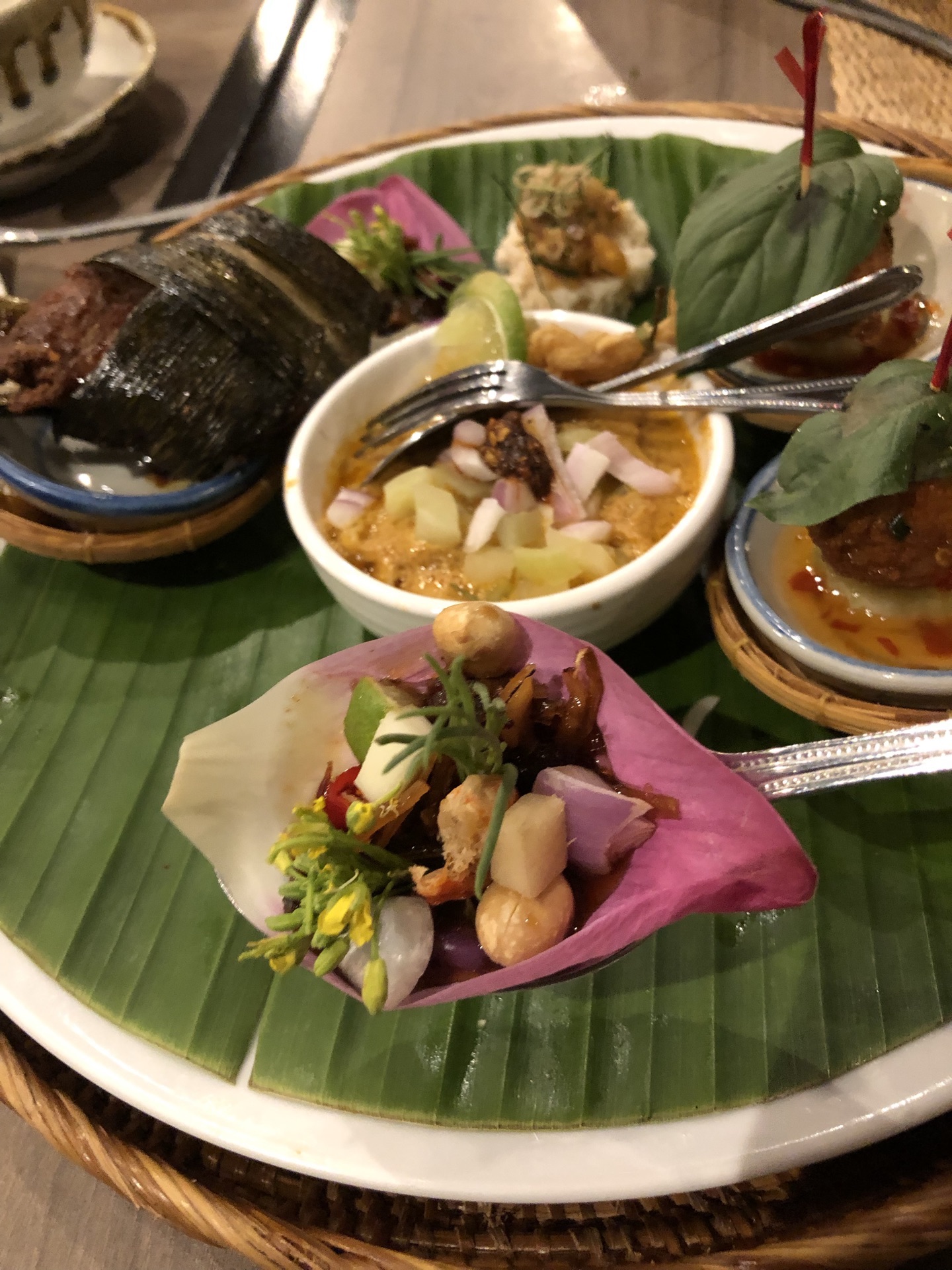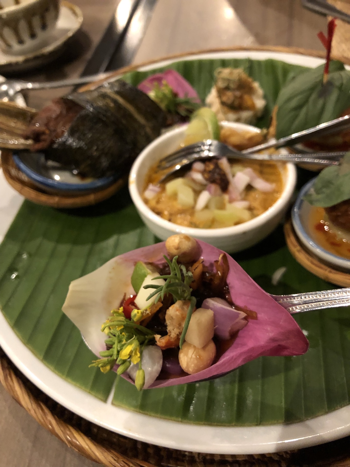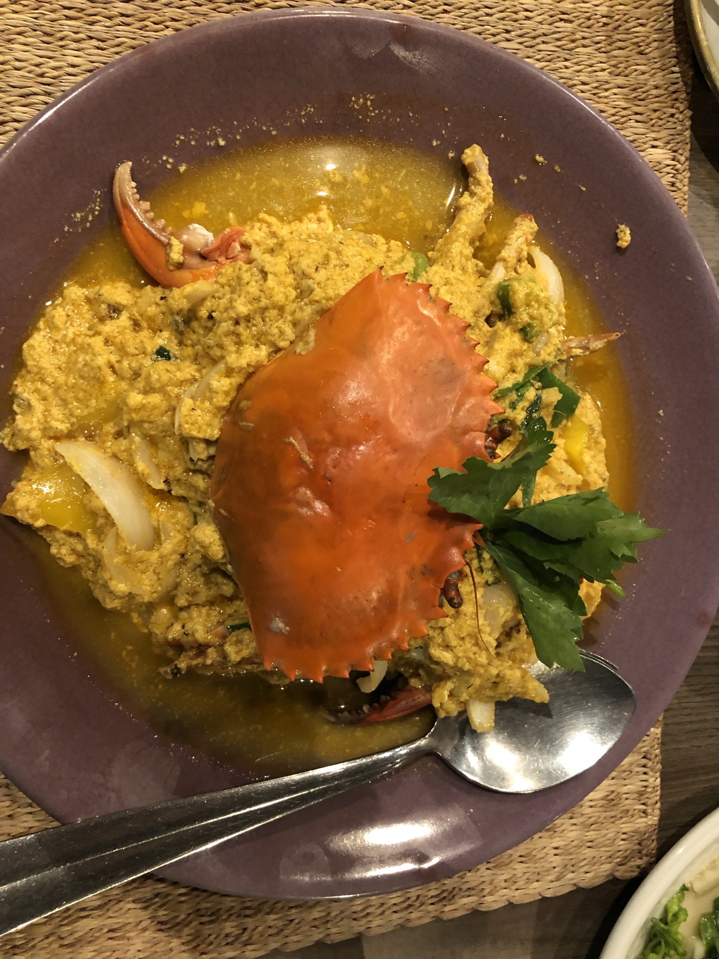 咖喱牛肉超级不错,咖喱螃蟹没什么特色,荷花苞和糙米饭挺有特色,青咖喱鸡肉也是一般般,但大环境不...柚子虾,炸鱼,咖喱牛肉超级不错,咖喱螃蟹没什么特色,荷花苞和糙米饭挺有特色,青咖喱鸡肉也是一般般,但大环境不错,服务员态度很好,相对来说,值得一试。