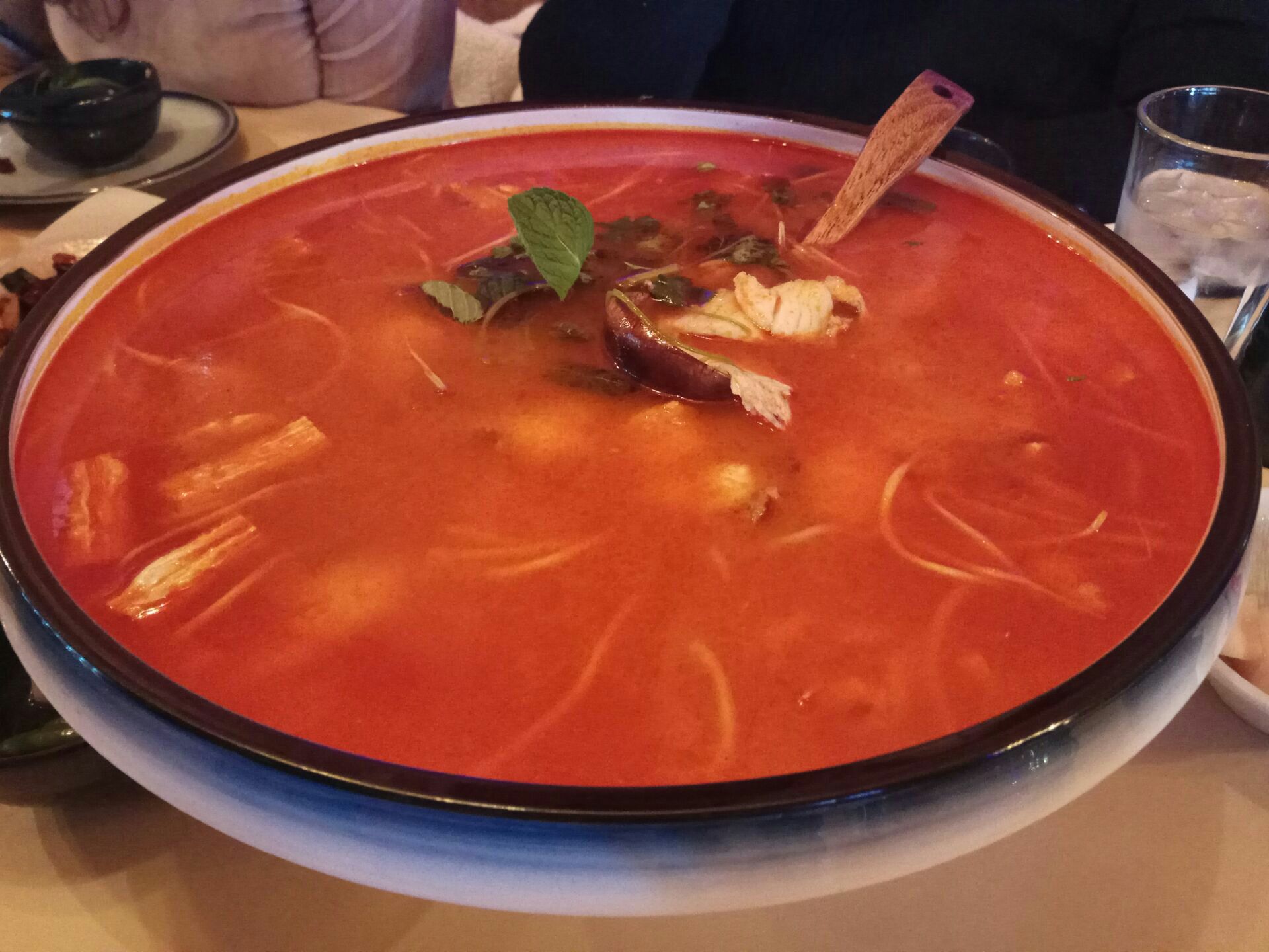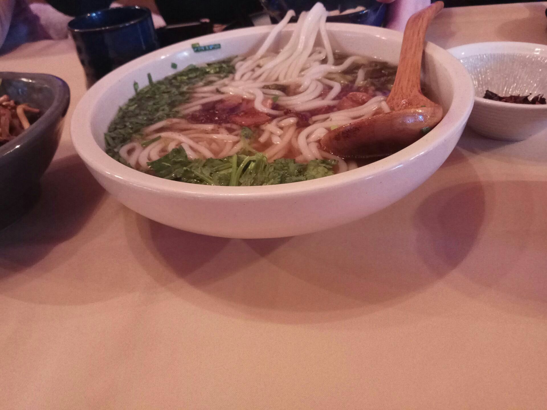 工作日午市过去虽然上座率蛮高但还是不需要等位的。翻翻菜单,感觉品种不多,感兴趣的更少,也就随别人点吧。餐厅环境太暗,个人不喜欢,服务员忙到上了第一个菜也没时间给我们倒杯水,后面加水更是千呼万唤。 点了几样菜让我觉得好吃的居然只是一碗牛肉粉,但也没到出色程度,好一点的快餐店也能做出的水平。酸汤鱼应该是招牌特色吧,但是这一盆显得空荡荡的汤,而且入口一点不浓郁,太稀了,拌白饭不错,但我宁可选满大街的酸菜鱼去吃吧。爆浆豆腐没有爆浆啊,就是煎嫩豆腐而已。葱爆牛肉用的是洋葱哦,但至少牛肉的量比回锅肉多,回锅肉那菜简直应该更名为大葱炒大蒜。