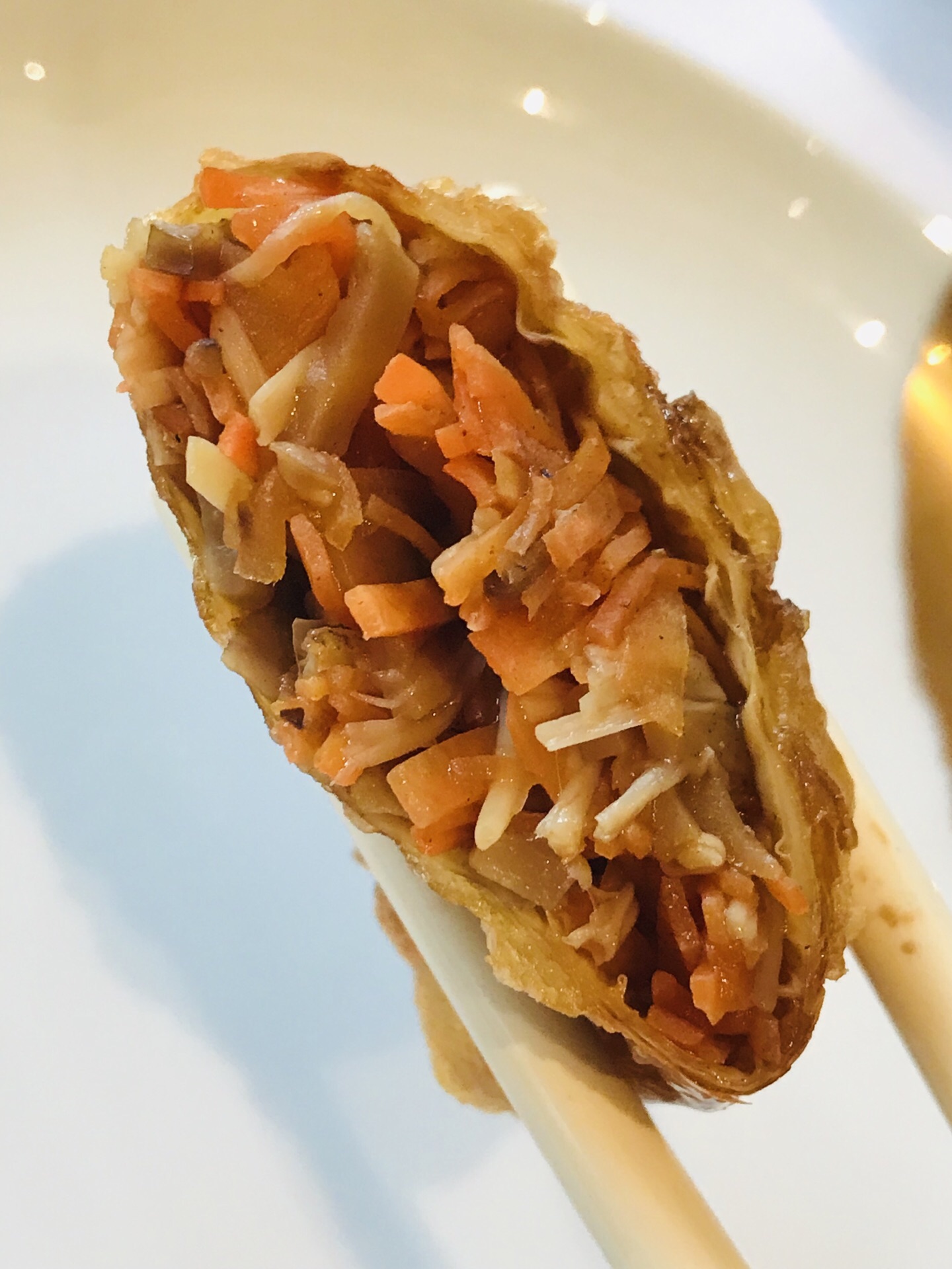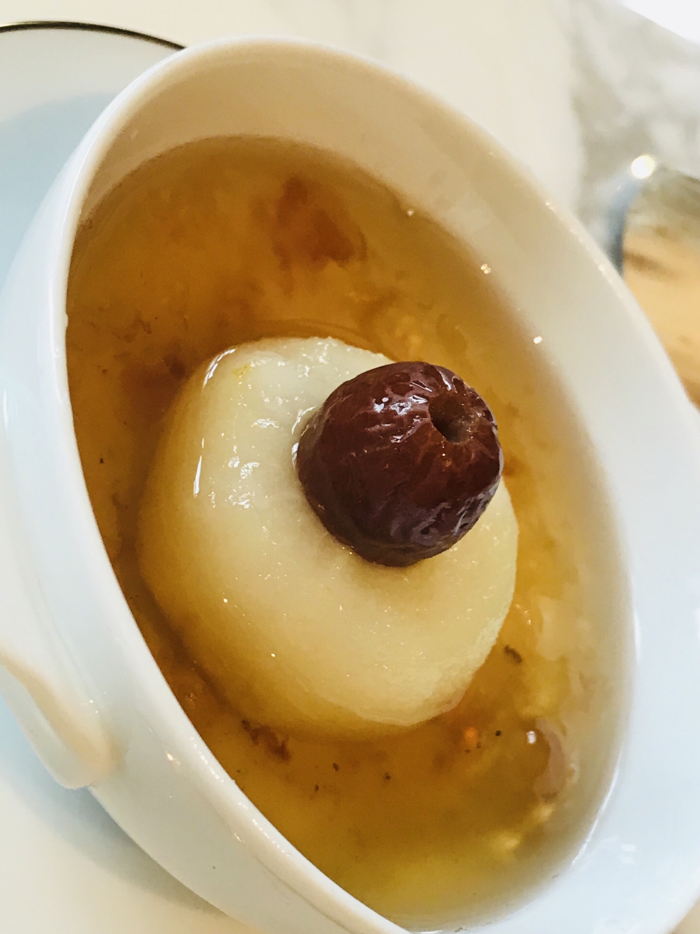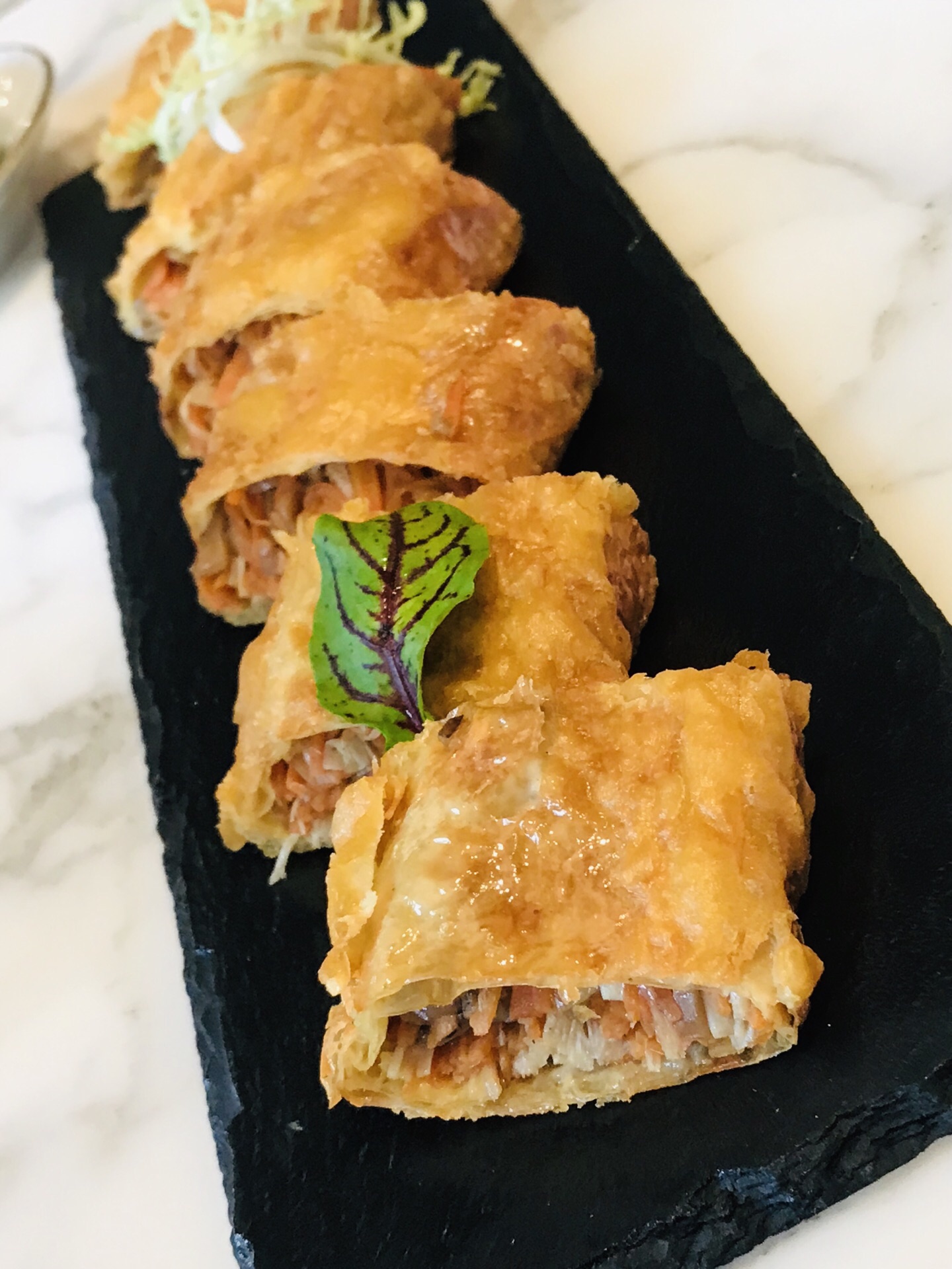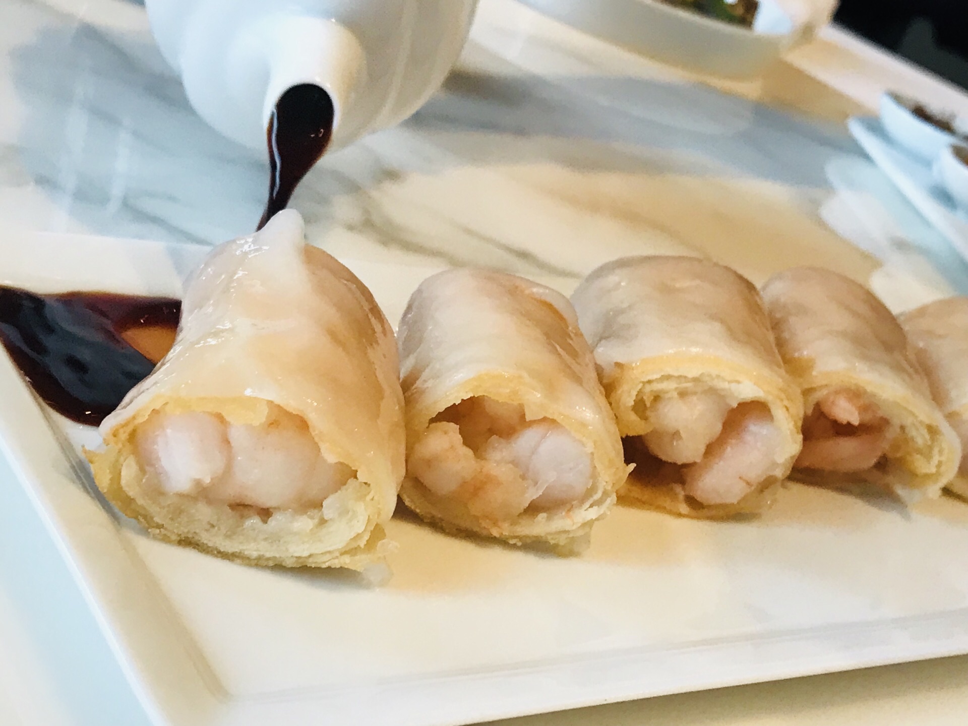 芝心虾春卷 配上蛋黄酱。热的时候。还不错吧。 脆皮鲜虾卷 哎呀,这个和芝心虾春卷点的有点重复了, 那没有办法呀,就喜欢脆皮线虾卷, 然后这个一定要到店里热的时候吃。 原只鲍鱼酥(粒) 为了这道菜恋上一家餐厅, 可见这道菜做的有多好吃。 一定要保持水准哦, 我五月份还要来过生日呢。 黄金素鹅 这道菜适合年纪大的人吃, 因为都是素的, 诶呀今天好像都点的是油炸的了, 爸妈都吃撑了。 化皮乳猪件 这一次一定要大大的表扬。 真的进步好大! 叶经理真的是一个好经理啊。 客气的说听取了我们的建议, 进行了改进。 哇!现在开始乳猪都是客人现点现烤, 然后这个盘子也是火热的, 总算能在上海吃到好吃的, 热气腾腾的烤乳猪了。 桃胶雪枣炖香梨 在现在容易感冒的季节, 这道甜品润喉最好啦。 杨枝甘露棉花糖 杨枝甘露做的不错 下面怎么相果冻不像棉花糖!