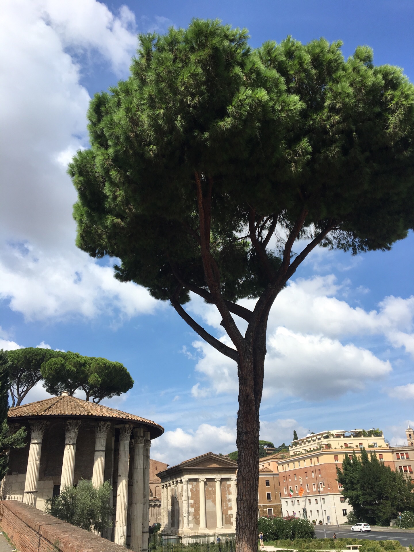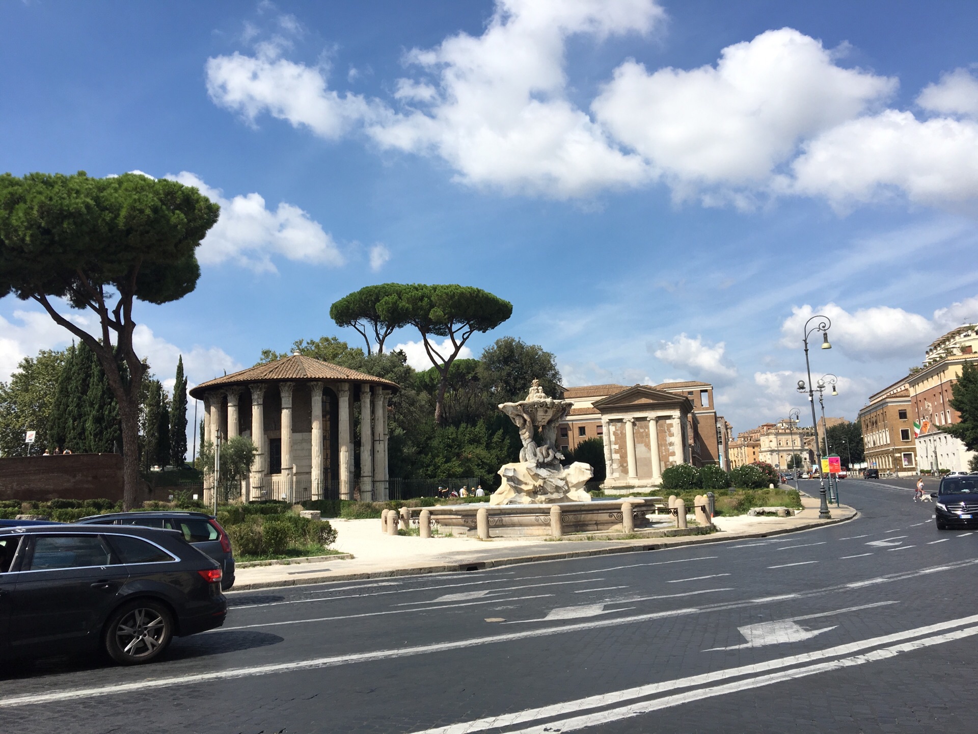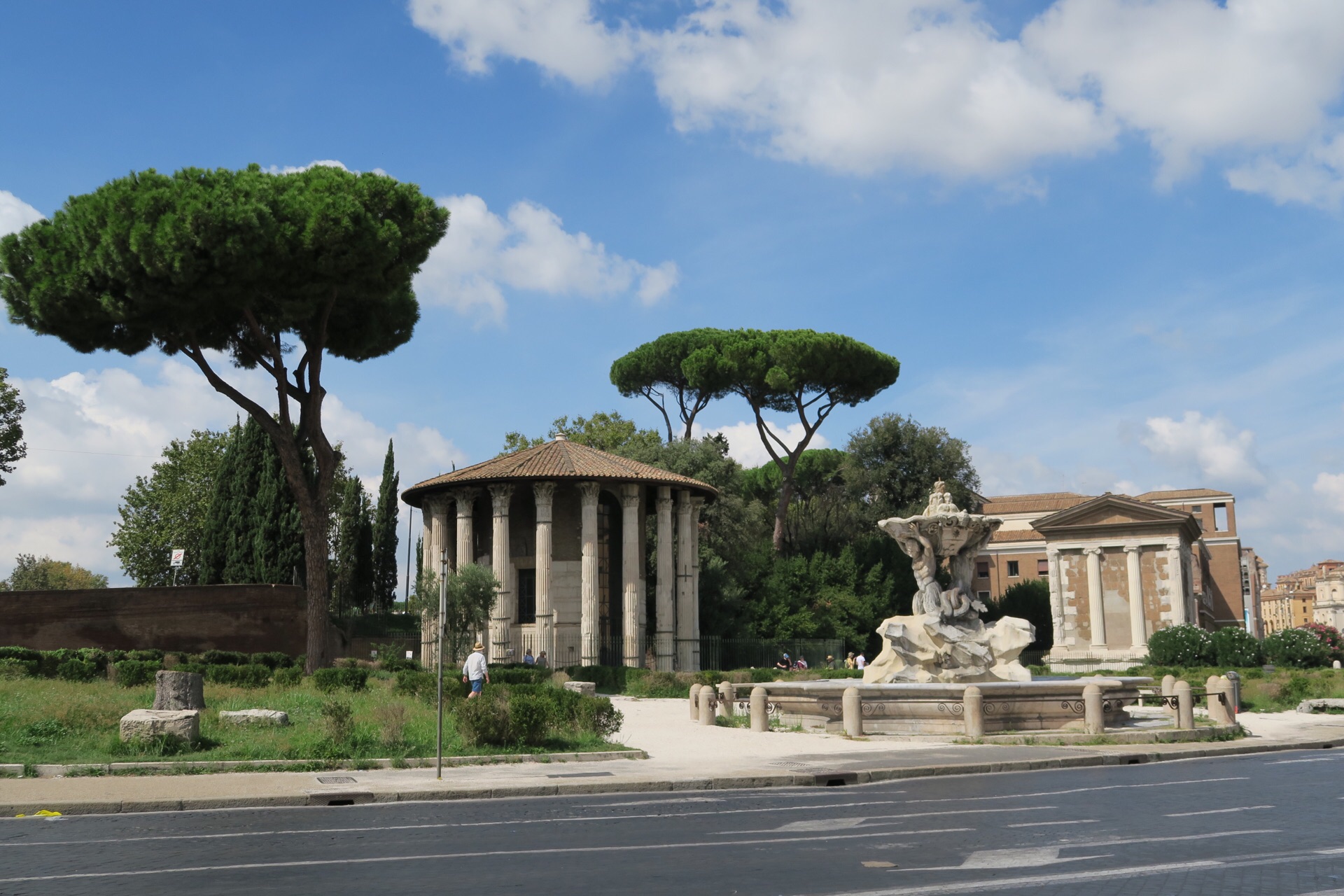 真理广场的对面有两座神庙,一座是圆形的胜利者海克力斯神庙,一座是长方形的波图努斯神庙,胜利者海克力斯神庙上面还带了一个圆形的帽子似的。圆形的神庙环绕的是希腊风格的廊柱,在祭台上面还有残存的壁画。海克力斯在西方的世界里是大力士的同义词,不过祭祀他的神庙却是比较袖珍的。
