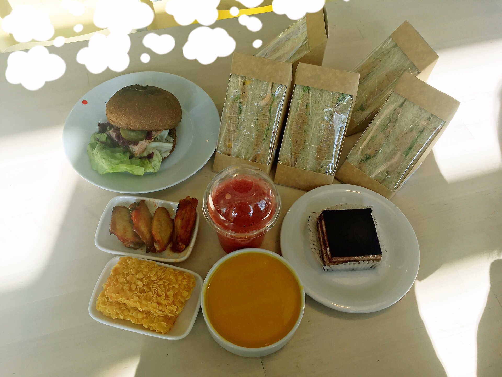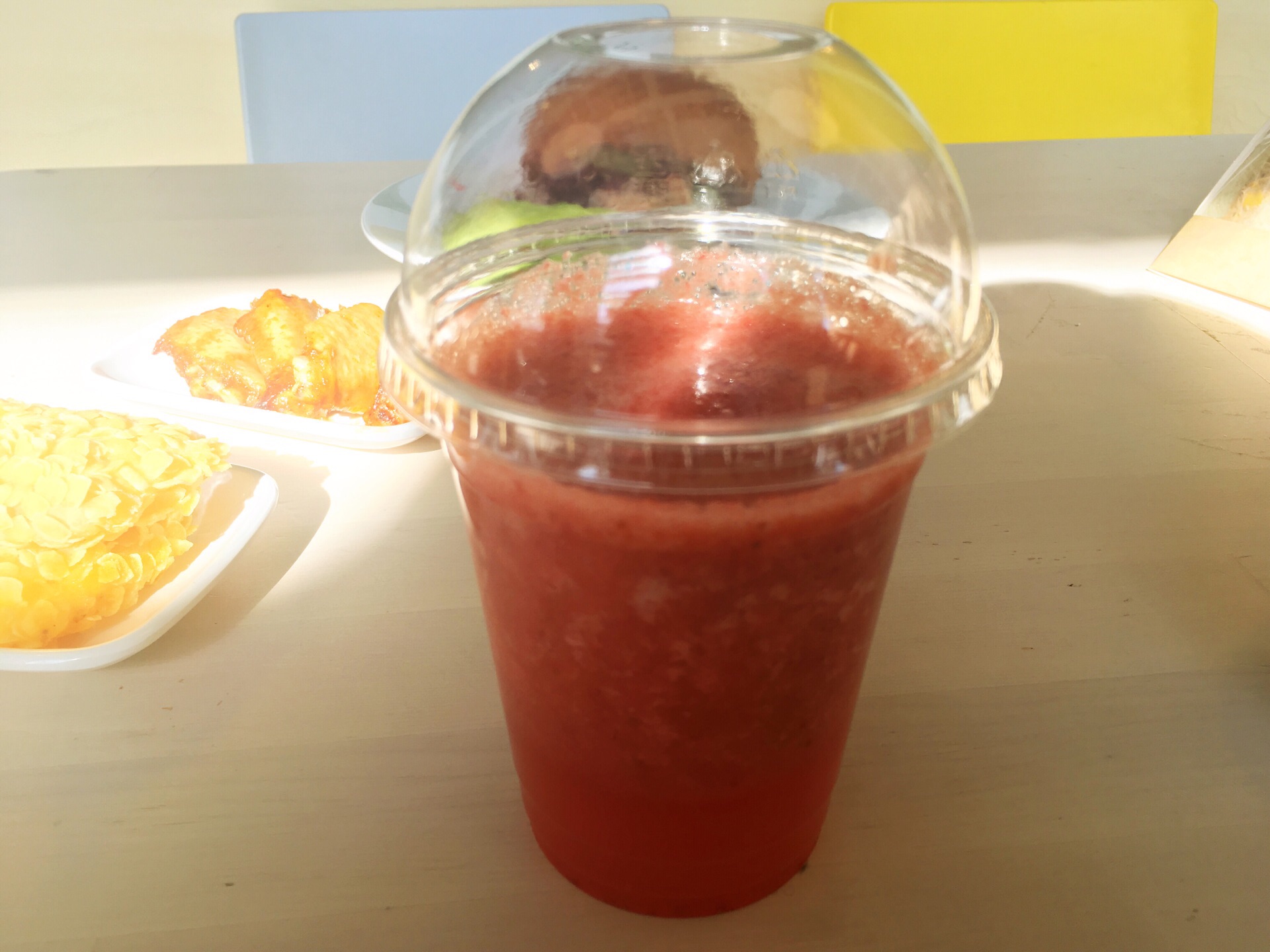 第一次在临窗的位置吃饭,感谢宜家祝我外婆生日快乐第一次在临窗的位置吃饭,感谢宜家祝我外婆生日快乐。 红色现榨果汁是草莓+香蕉+车厘子,奶油南瓜汤有一点点咸,我的常规菜单一定是三文鱼三明治与金枪鱼三明治。