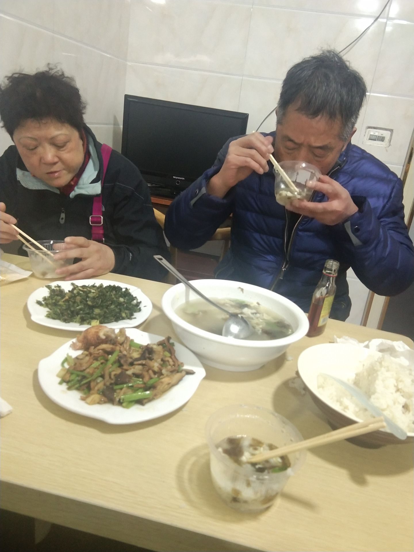 去年就住的祥和,一块手表引发的误会,于是今年又定了房并且在那里吃晚饭了,和爹妈一起三个人点的双人套餐,中午吃饭多了几块鸭子和一瓶酒我们带来吃了,老板娘看见说了一句自己买酒啦,爸爸就解释说中午点多了,于是老板娘也没说什么了,双人餐量挺大的,主要妈妈糖尿病少吃多餐所以正餐吃不多,主力就是我和爸爸了,味道在山上来说很不错了又便宜,碗给我们一次性的不知道为什么,看看后面两桌都不是一次性的呢,但也省的我们去用茶水洗碗了!