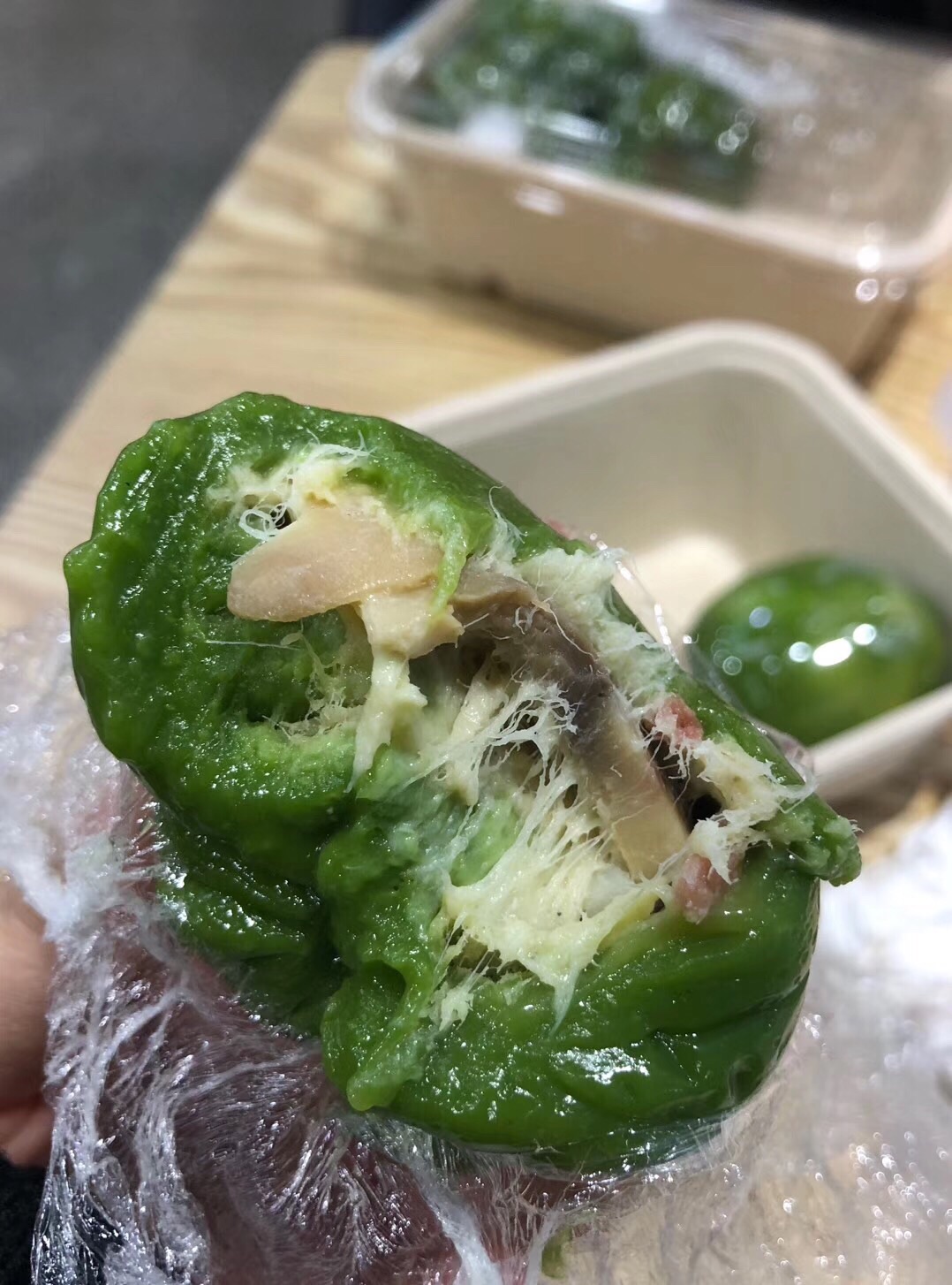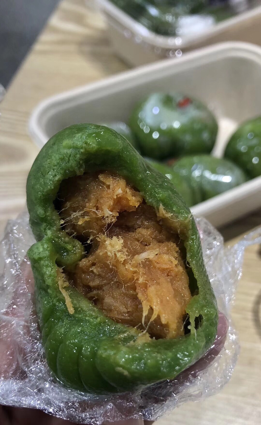 奶油鸡丝青团应该是刚刚上市的新产品,应该是加了奶油和奶酪,所以有拉丝的效果,值得一试杏花楼是网红店啊,每次看到都有人排长队。今天终于有时间加入排队大军,尝到了网红产品肉松青团和奶油鸡丝青团。奶油鸡丝青团应该是刚刚上市的新产品,应该是加了奶油和奶酪,所以有拉丝的效果,值得一试。