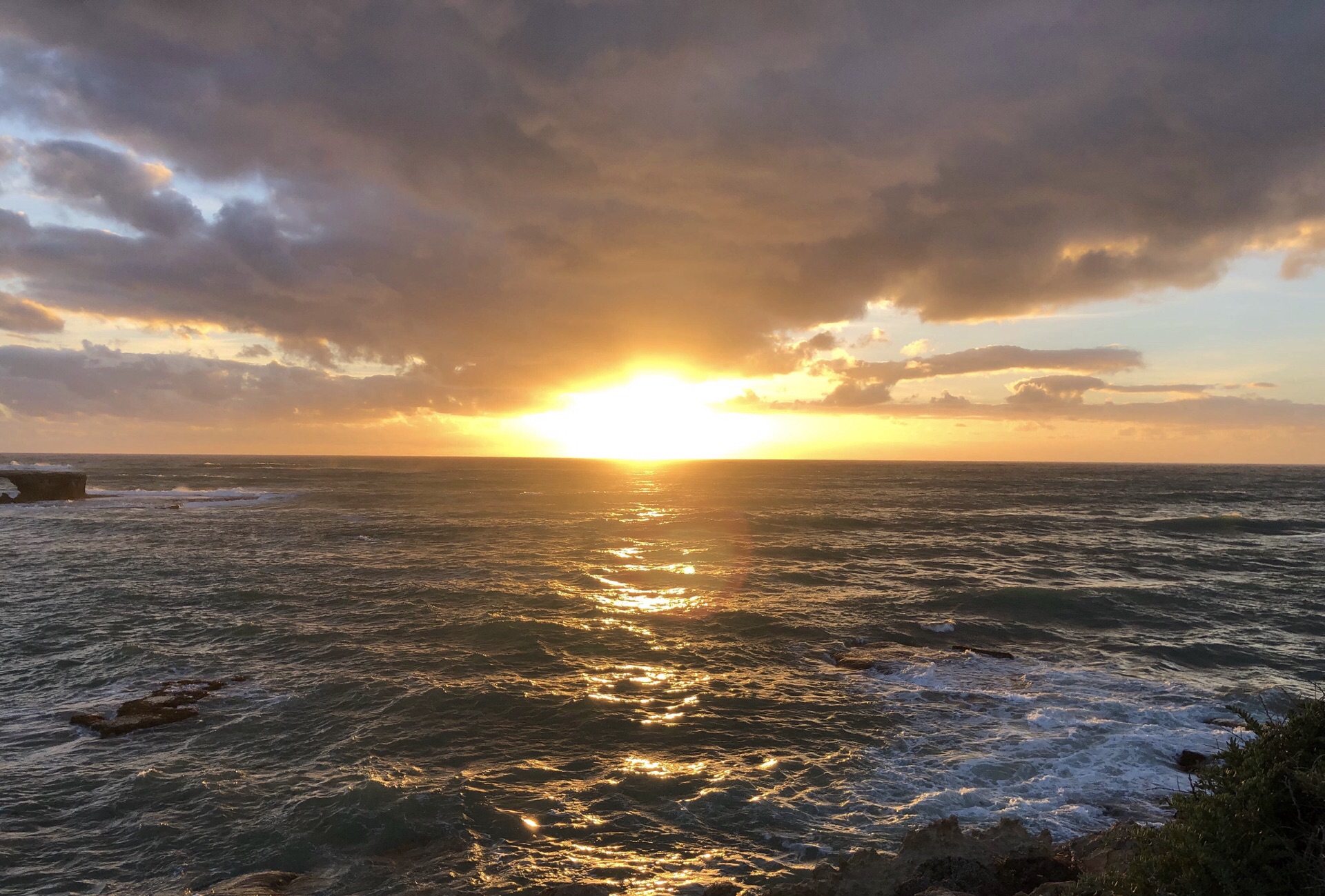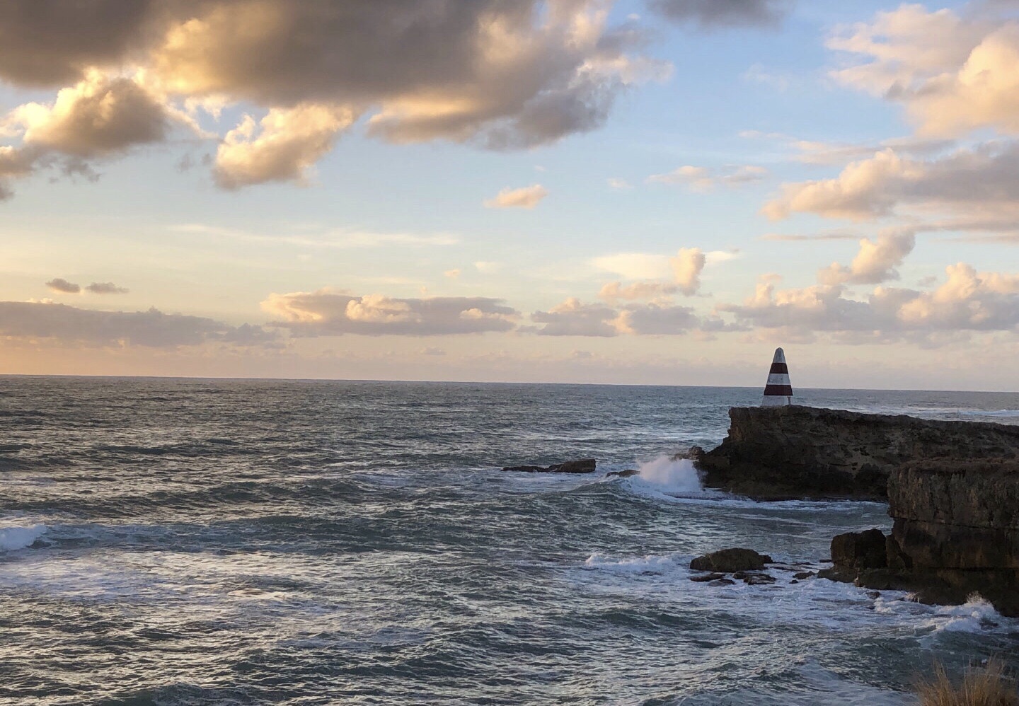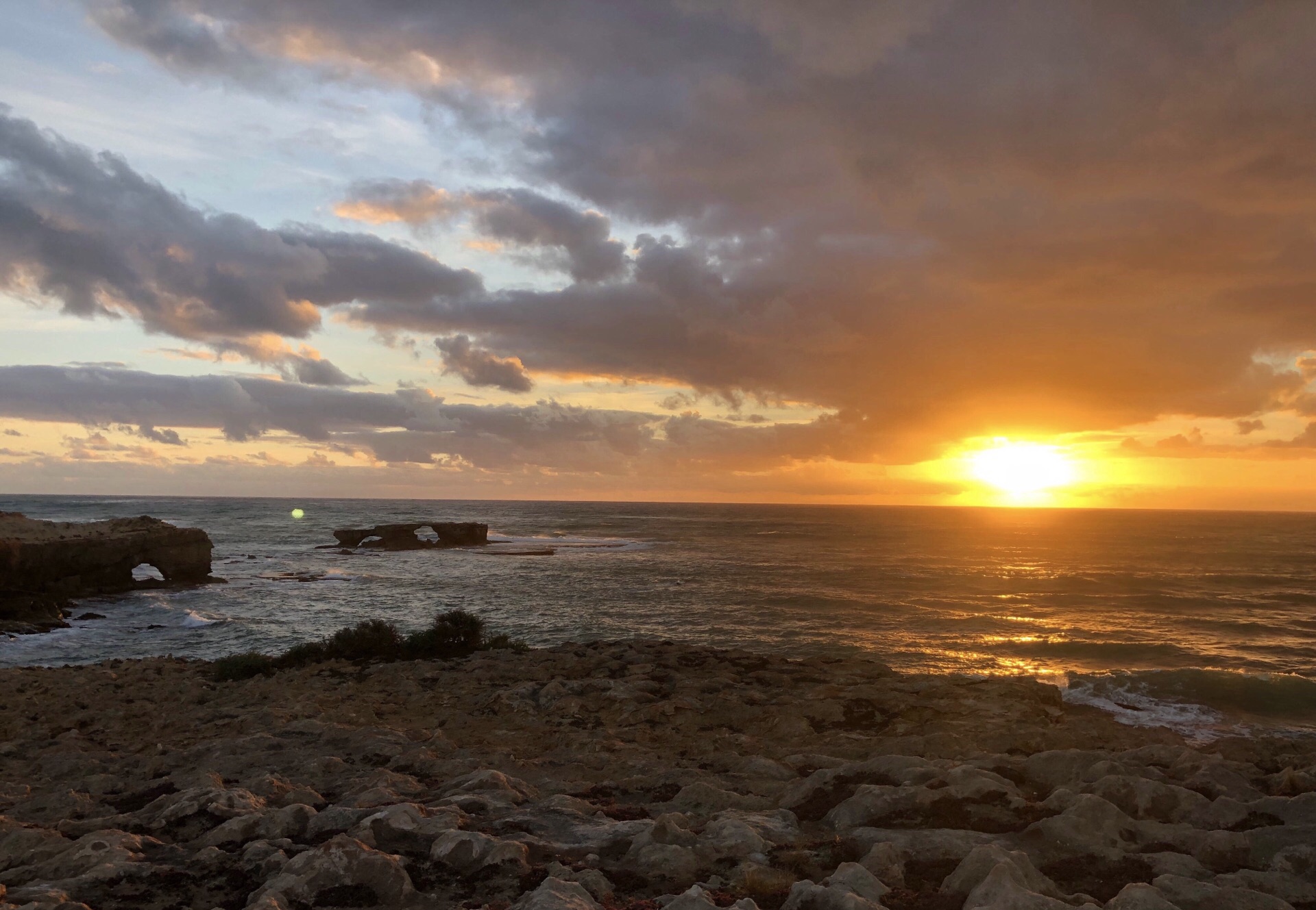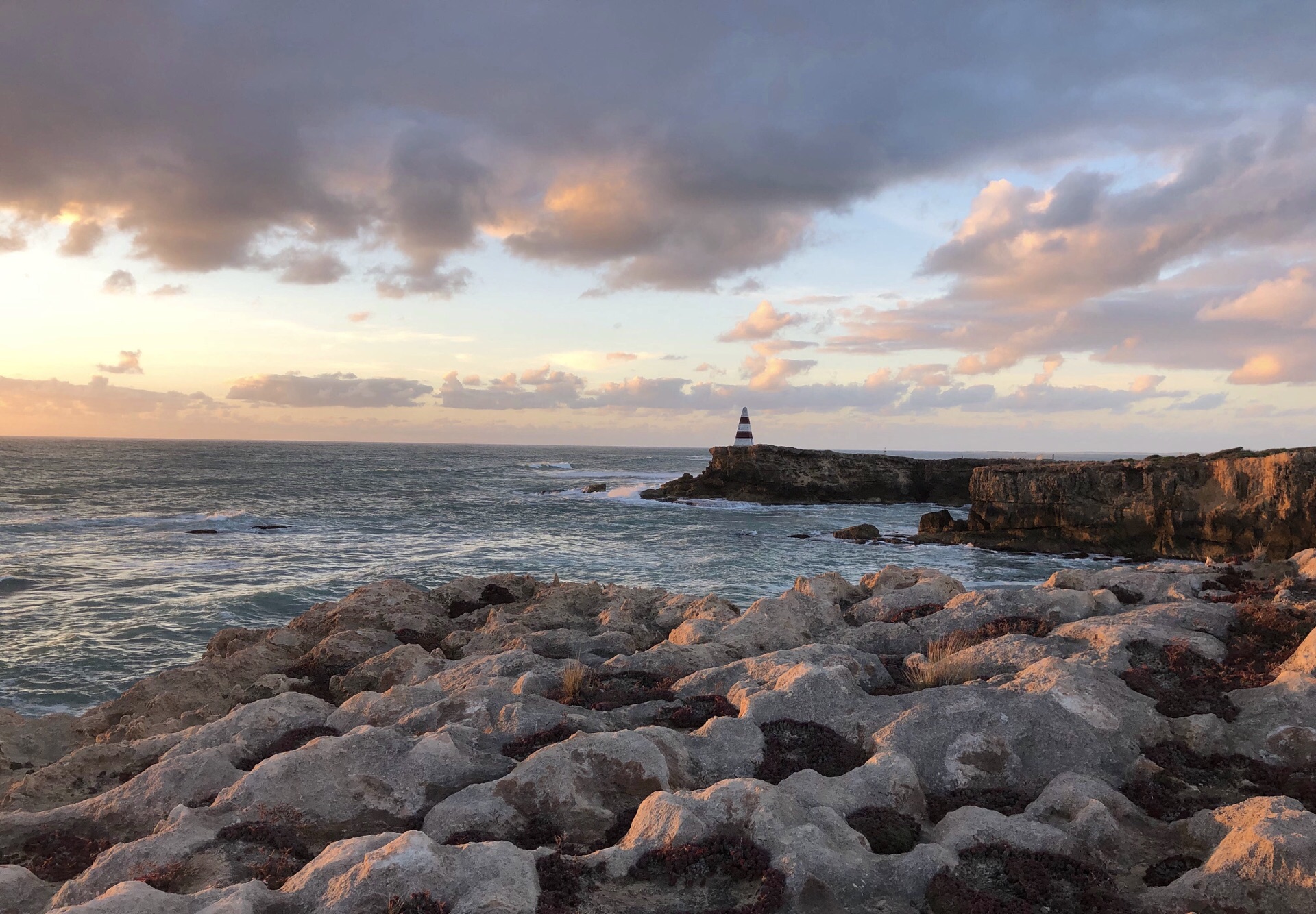 到了Robe,正是落日的时间。 在Robe obelisk看到夕阳西下。也一样是悬崖峭壁,海涛汹涌的拍打着,泛着泡沫。 Robe有很奇怪的地理特性,应该都是石灰岩,有各种奇怪的形状,长满了特别的植物。 因为有很厚的乌云,所以日落时象是黑天。