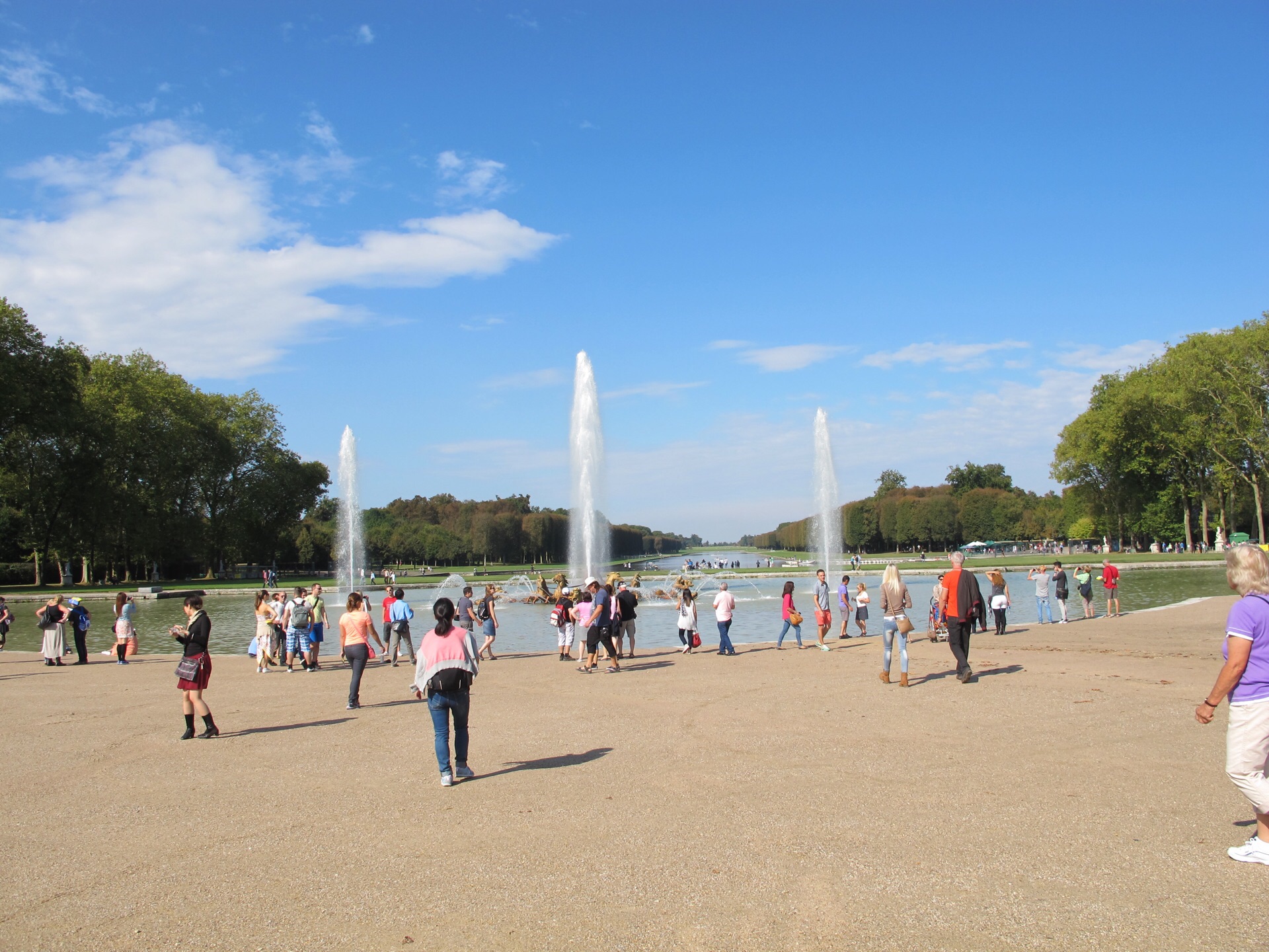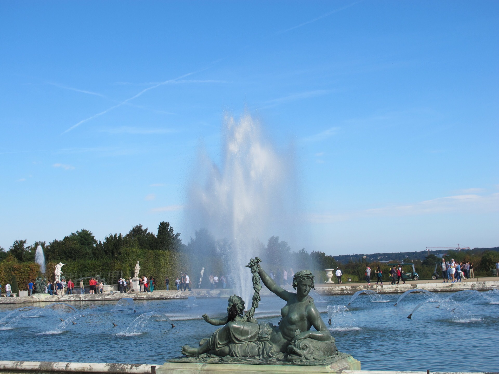 凡尔赛的花园面积非常大,中轴线长达好几公里,在花园里走一走一定要装上轻便舒适的鞋子,因为实在是太大了。花园不光大,而且美,是法国古典主义大花园的绝对典范。花园是绝对严谨的左右对称,中轴线即皇家大道一直通向大运河。皇家大道中间是宽阔的草坪,就像是铺了一条绿毯似的。