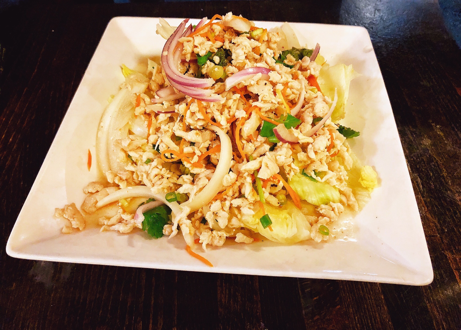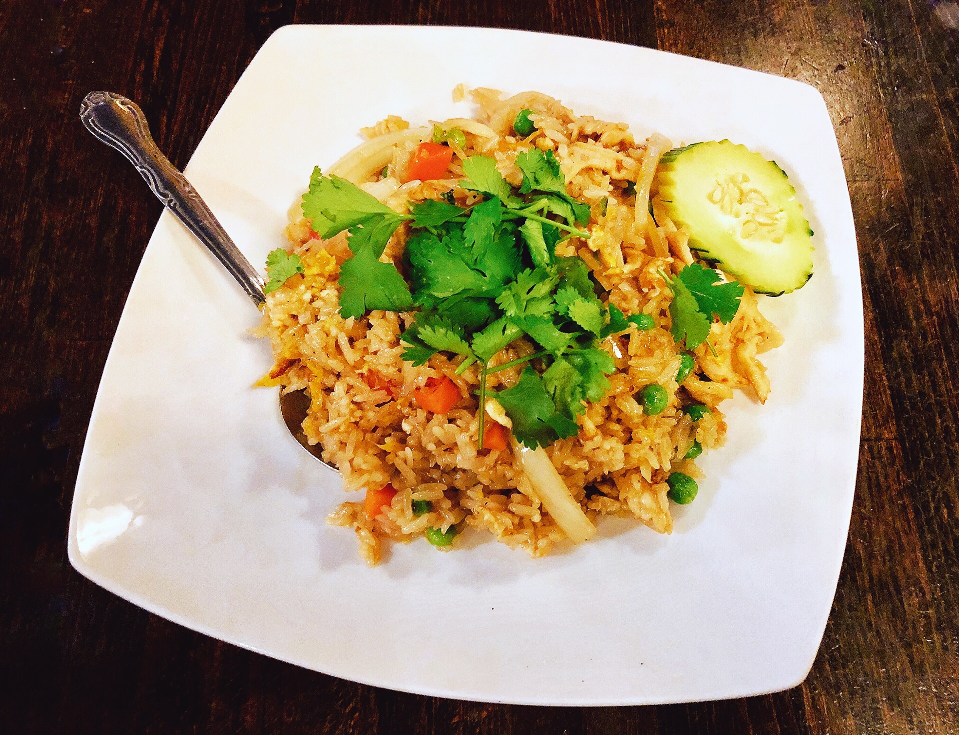 点了色拉、馄饨汤和鸡肉炒饭,酸甜程度没有国内泰国菜浓郁(我没去过泰国所以也不知道正宗泰国菜什么味道