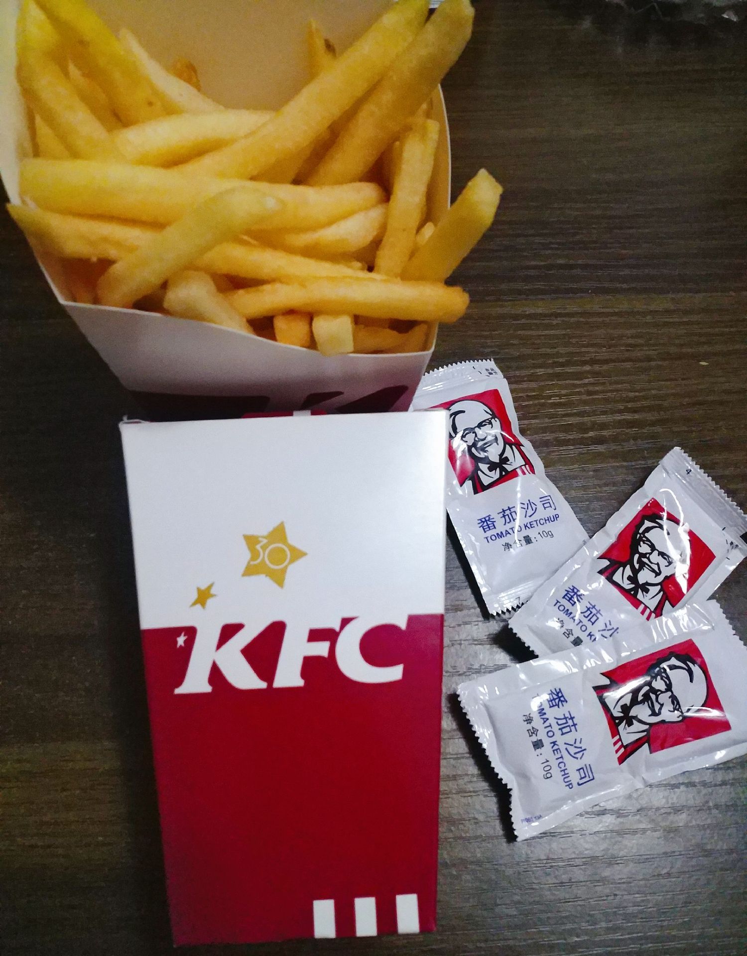 遛狗子碰到小伙伴越逛越远,狗子遛嗨了,不肯回家,app上下了单,立即进去拿了鸡米花和薯条,狗子才被一路骗回来。 鸡米花外皮炸得透透的,香酥松脆,里面的鸡肉狗子最爱了,薯条是自己喜欢的,多蘸点番茄酱,虽然知道油炸食品不好,但还是吃不厌。