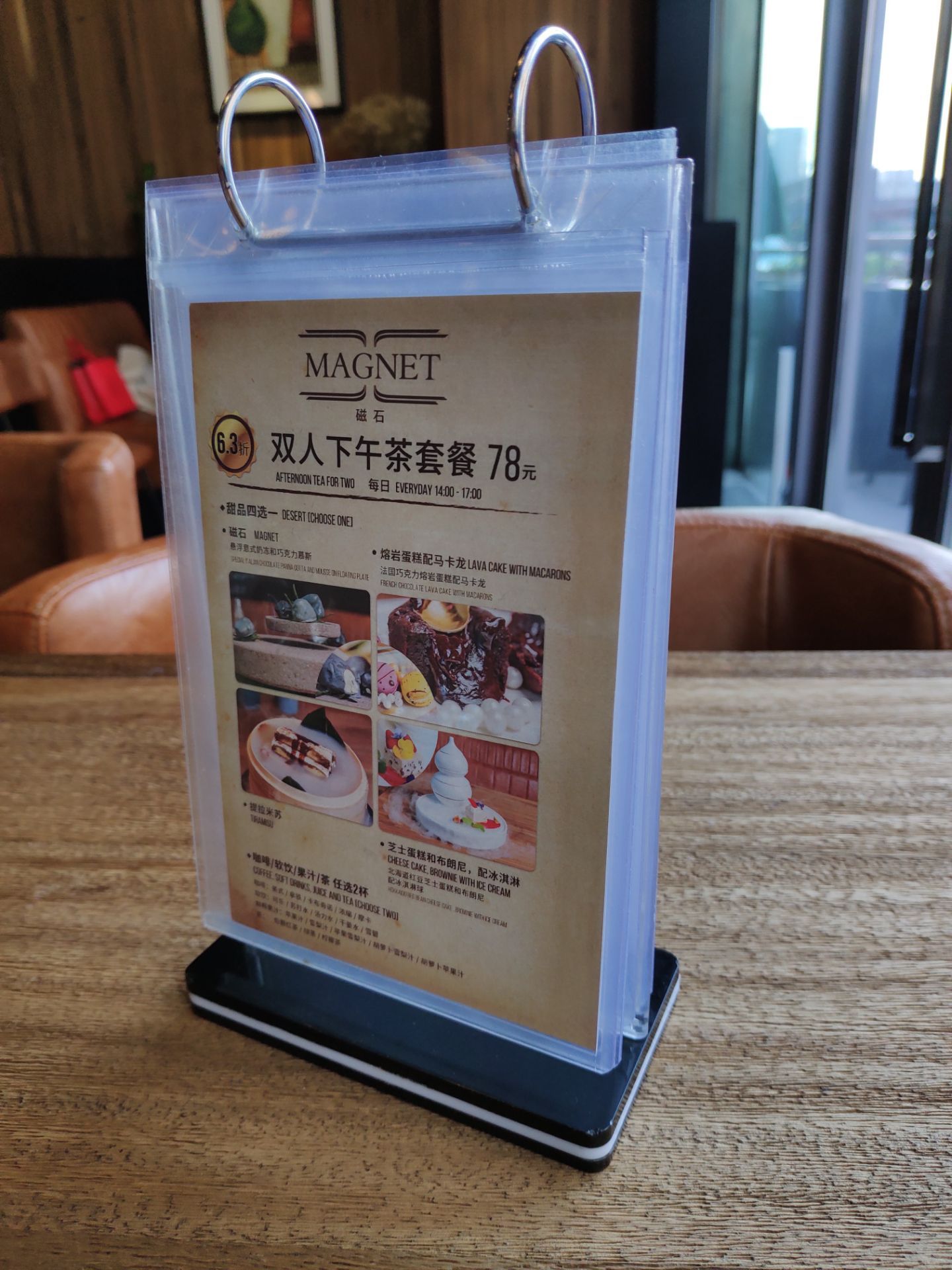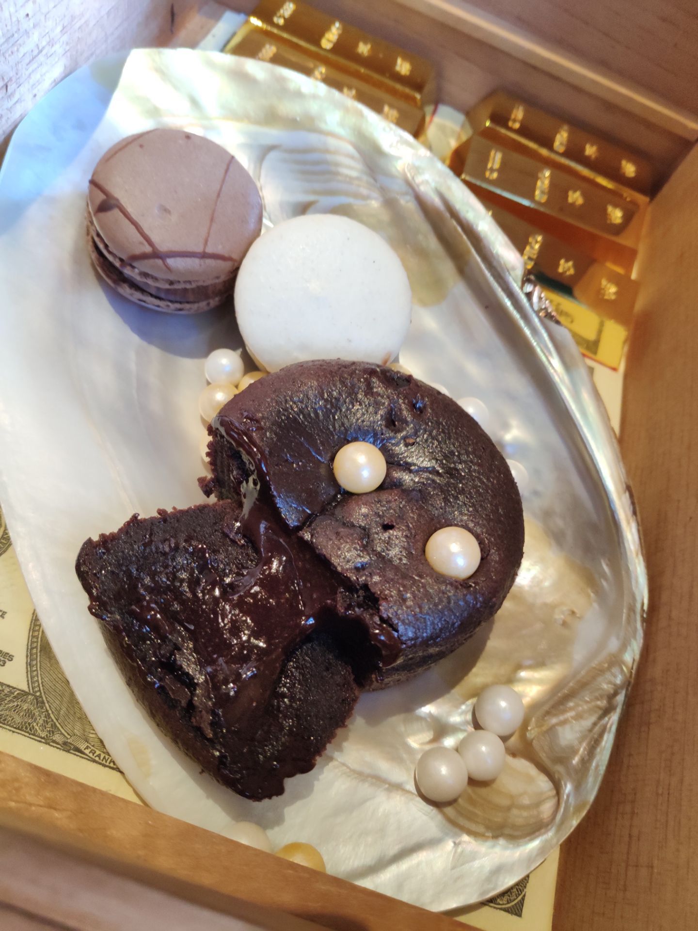 之前在大悦城吃过磁石的猪肋排套餐,感觉挺好的,这次发现徐汇日月光也开了磁石,环境还行,周末下午人不多,很安静,座位也宽松,适合闲聊。天气暖和的话,还能坐到室外,不过现在坐门口边会觉得有点凉。 他家甜品的摆盘都很有特色,招牌的磁石自然会让人惊叹,而我们这次点的熔岩蛋糕马卡龙可谓土豪版装饰:是以宝盒形式出场的,打开盒盖则是满满的100美元大钞,端开“钞票”方见甜品真容,放在了贝壳之上,周围点缀了珍珠,底下还有金条烘托,哈哈,奢华之气扑面而来!里面甜品的味道还是对得起这漂亮的装饰,熔岩蛋糕果然会熔哦,所以一定得趁热,巧克力浓郁,我喜欢。马卡龙本来并非我所爱,因为之前别家吃的不是太甜就是太硬,这次倒觉得不错,外壳略脆但咬下去比较松软,口感挺好的,甜度也调到了国人习惯的口味。饮料一般。