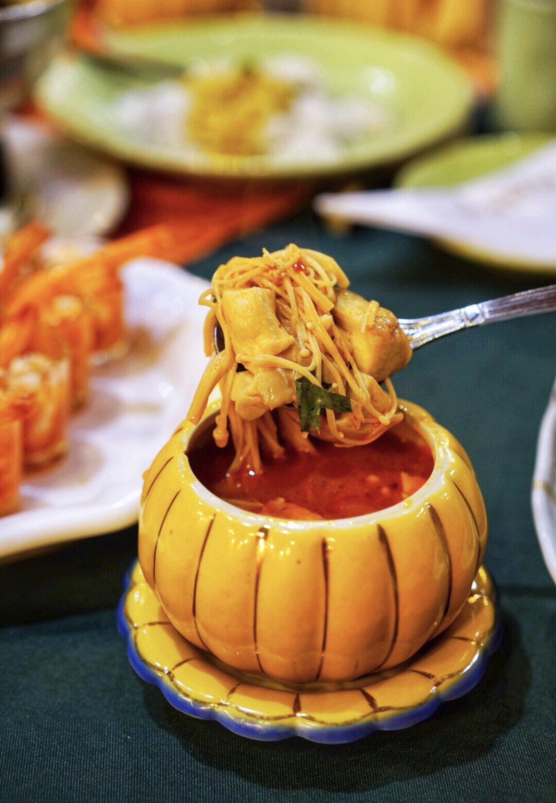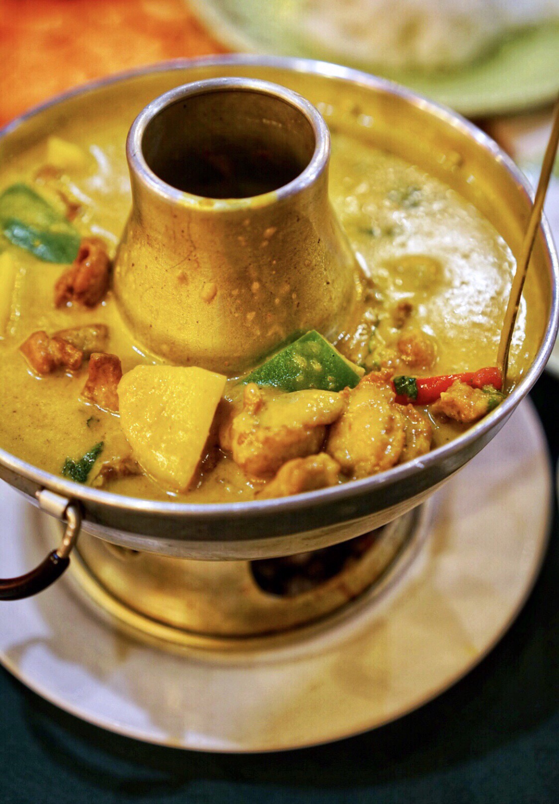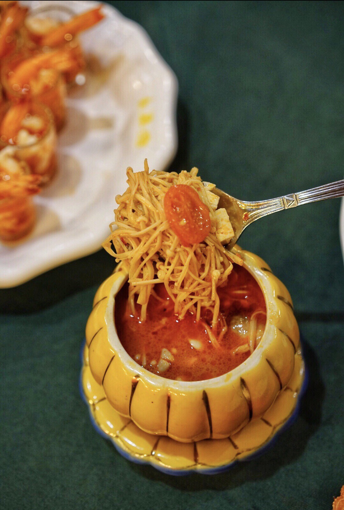 作为厦门泰国菜的鼻祖,金象湾可以说是早已声名在外了。在泰式料理已经星火蔓延后秀迭起之时,金象湾依旧屹立不倒,凭的就是他的那一盘令人魂牵梦萦的咖喱。 咖喱鸡肉,顺滑浓郁的黄咖喱,刚一入口,醇厚的滋味就令人欲罢不能。软糯的土豆,嫩滑的鸡肉,在咖喱汁的映衬下口感愈发鲜活起来。汤汁是一点也不能浪费的,拿来浇米饭保证能多吃两碗! 香茅浸虾,开胃首选!足够分量的香茅所散发的迷人气息,与鲜甜的虾肉混合,便成就了这酸辣中带着一丝甘甜的精髓。 冬阴金针汤,单人份小盅分量正好,酸辣鲜美,红彤彤的模样令人食欲大增。