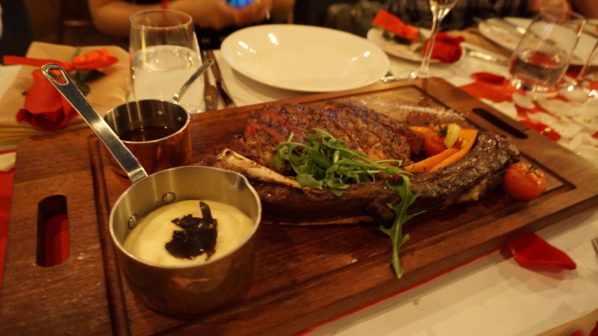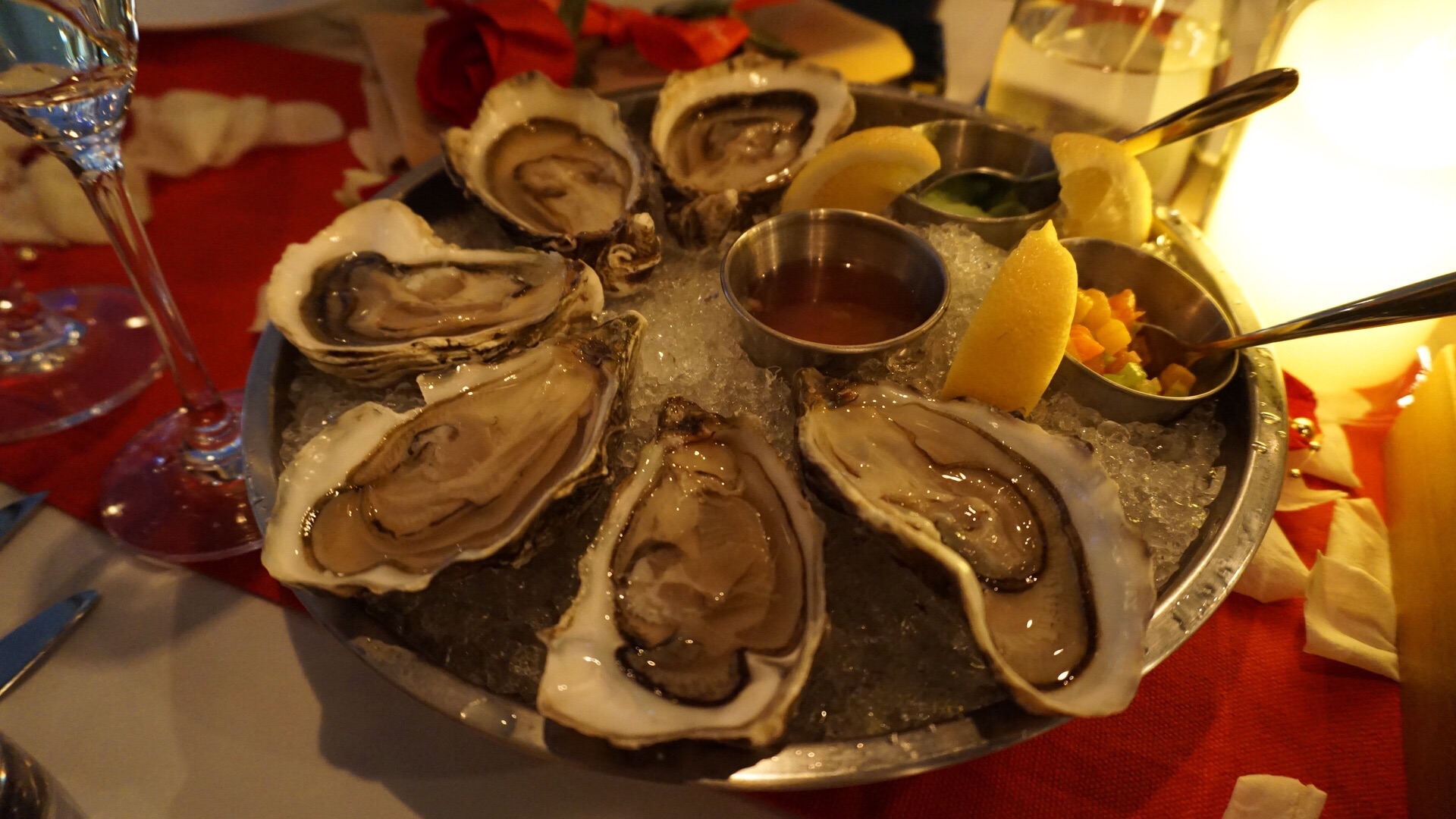 朋友生日预订了这家餐厅,一共8个人用餐,安排了一个靠窗的长桌。 【环境】整体位置很不错,可以看到浦江以及对面的开瓶器三件套,浦江游船来往,繁华好看。 【服务】餐厅为生日会特地布置了玫瑰花瓣和生日快乐的灯牌,很贴心。进到餐厅里有服务员帮忙挂衣服,还会有衣服对应的号牌方便认领。 【口味】点的所有菜口味水准都在线,生蚝新鲜,五分熟的战斧牛排也很惊艳,三文鱼沙拉口味浓郁。最惊艳的是最后的甜品提拉米苏,是服务员推荐点的。作为一个平时对甜品不太感冒的人,也必须承认这份提拉米苏口味很棒,甜度适中,配合一点点咖啡,更加强了不一样的风味。 总体来说,这家餐厅可以强推!
