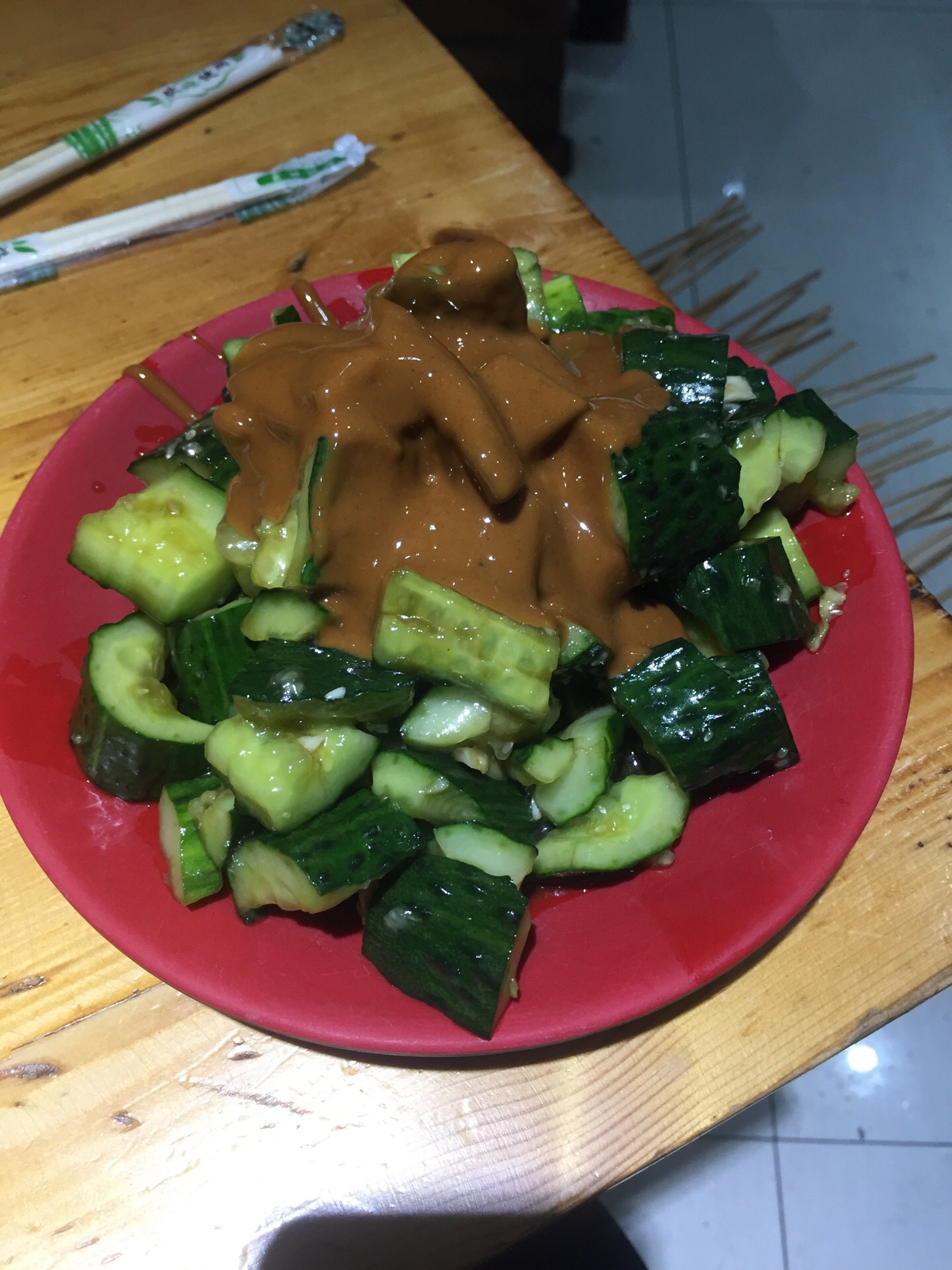 还是点了店里的特色菜品,醋椒豆腐、麻酱黄瓜和羊肉串天气渐暖,来这里吃饭的客人越来越多了,每到饭点肯定是要等位的,今天还不是很多,18:45来的拿的一号,等了一会儿就有座位了。还是点了店里的特色菜品,醋椒豆腐、麻酱黄瓜和羊肉串。