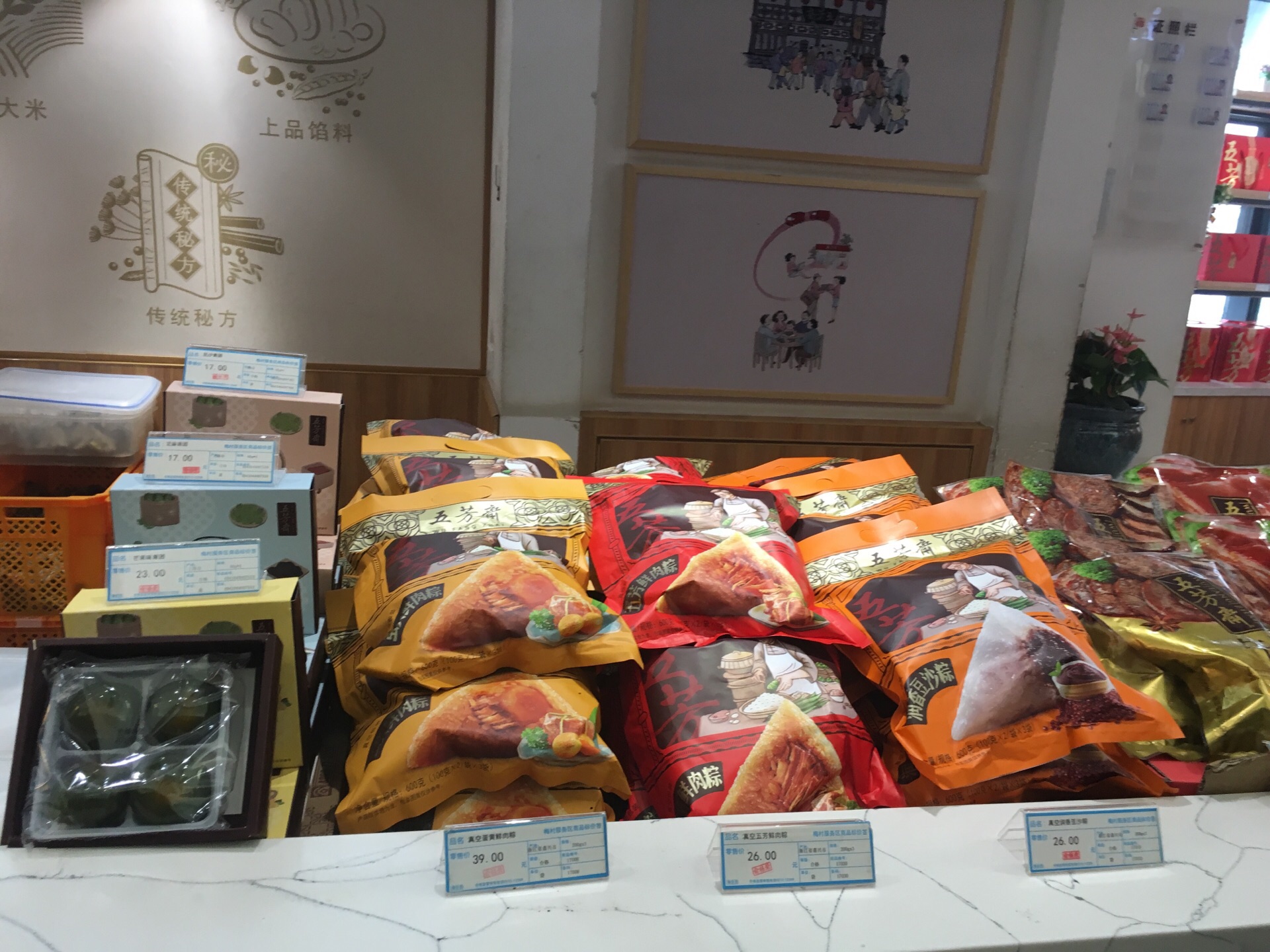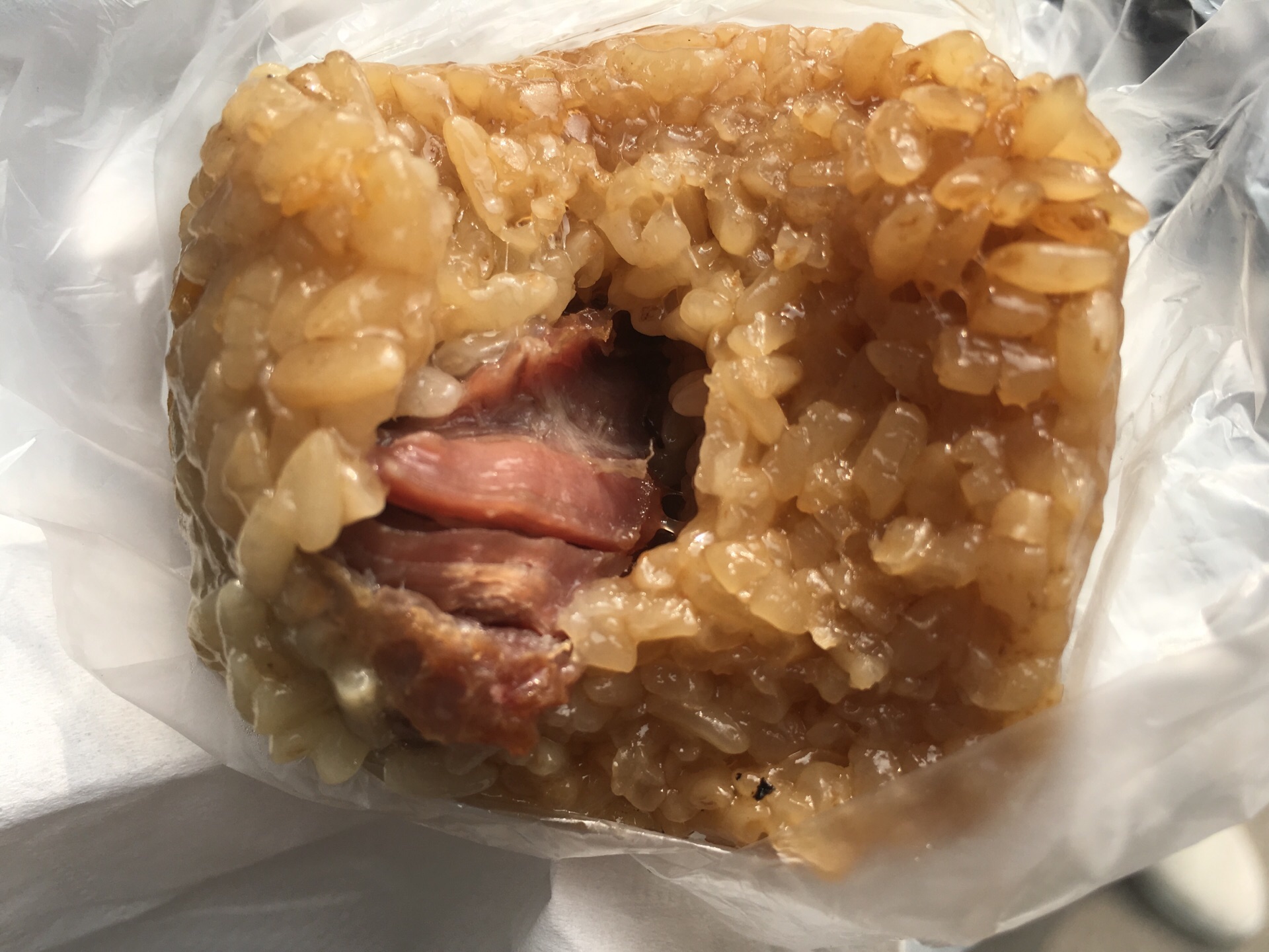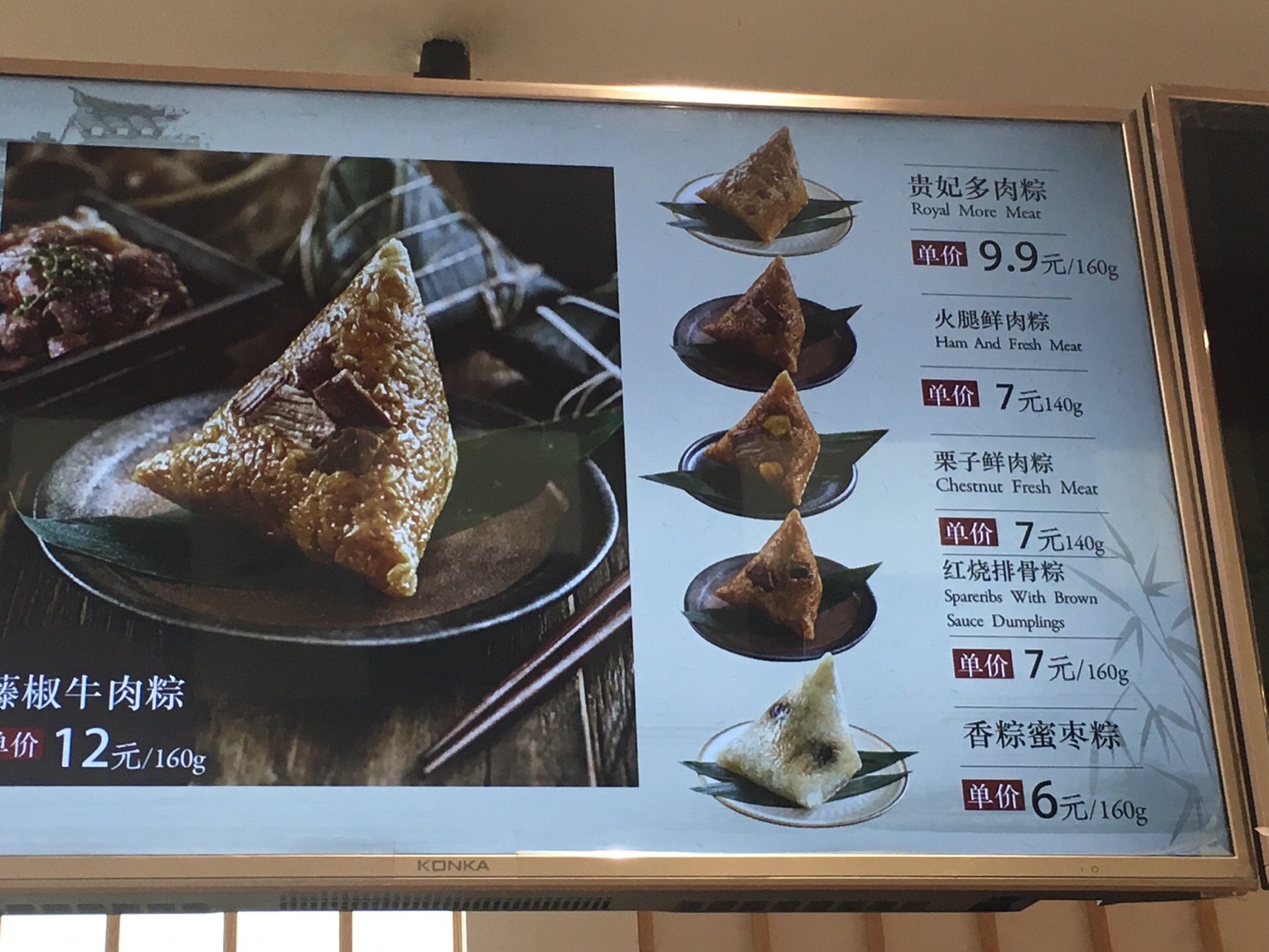路过梅村服务区,看到有五芳斋粽子,就买了一个蛋黄肉粽,热的,8元一个。糯米还可以,几乎没什么肥肉,精肉有肉夹气,而且柴,蛋黄硬,一点也不好吃,这样还好意思卖8块钱,五芳斋不行了! 粽子还有外袋的一袋袋的,还有青团出售。