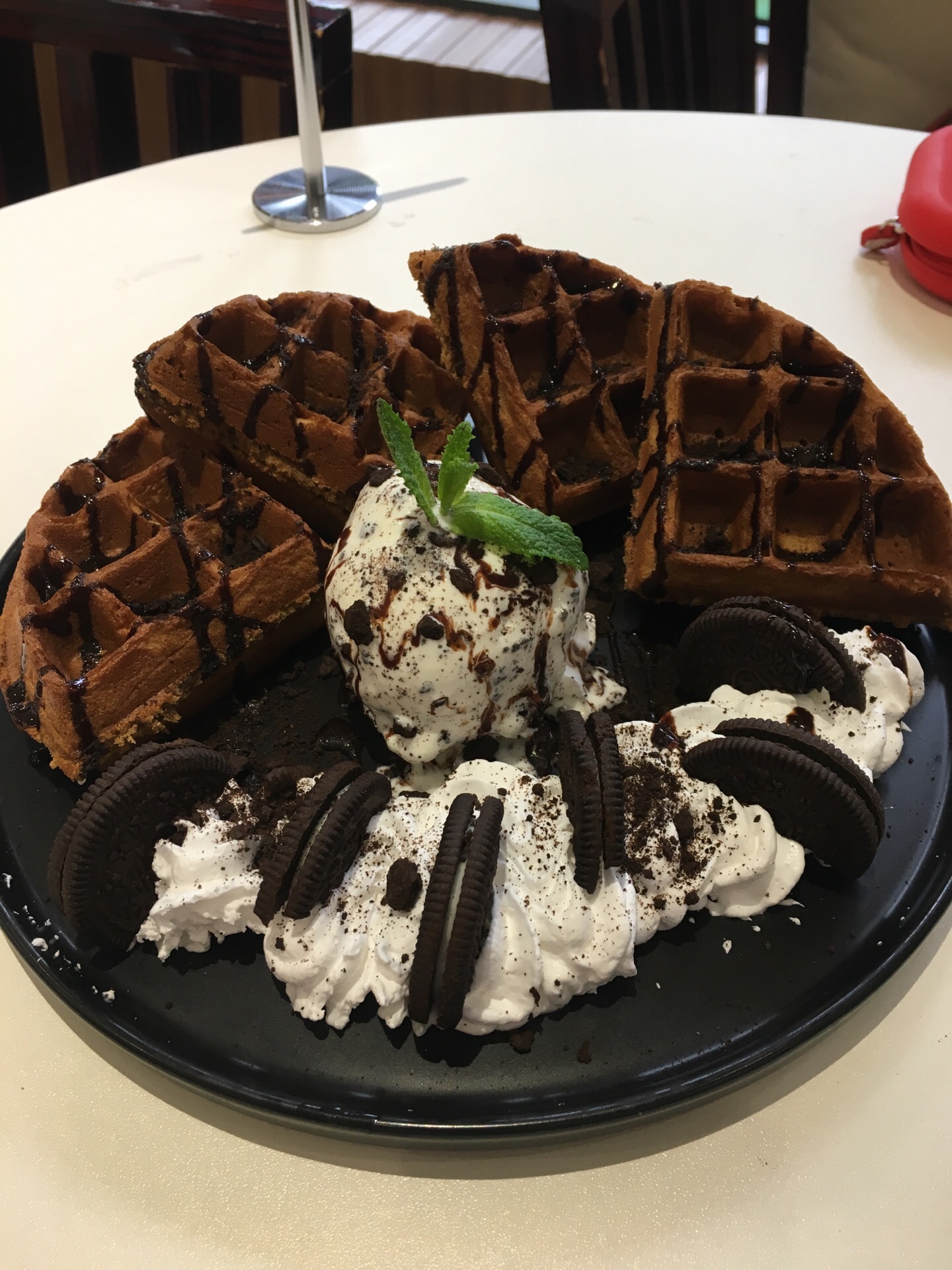 朋友中的霸王餐,在黄花岗公园旁边。 士多啤梨思慕雪山和摩卡合伙人两杯饮料,一杯是冰沙另外一杯摩卡;布朗尼冰淇淋华夫饼和曲奇薯薯,很大份,曲奇薯薯是用薯泥做成曲奇的样子,还不错;华夫饼有4大块、中间有个雪糕球,旁边还有些奥利奥点缀。很大一份,感觉是3-4人份的下午茶。挺好的