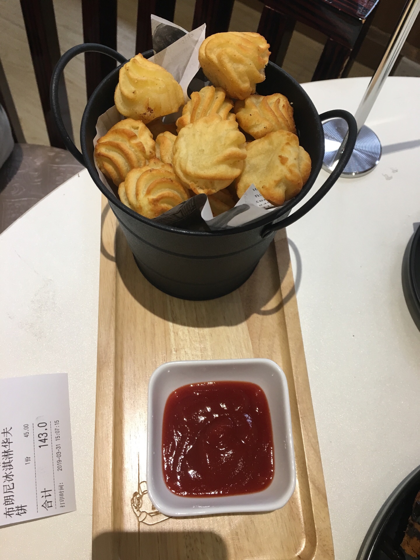 布朗尼冰淇淋华夫饼和曲奇薯薯,很大份,曲奇薯薯是用薯泥做成曲奇的样子,还不错