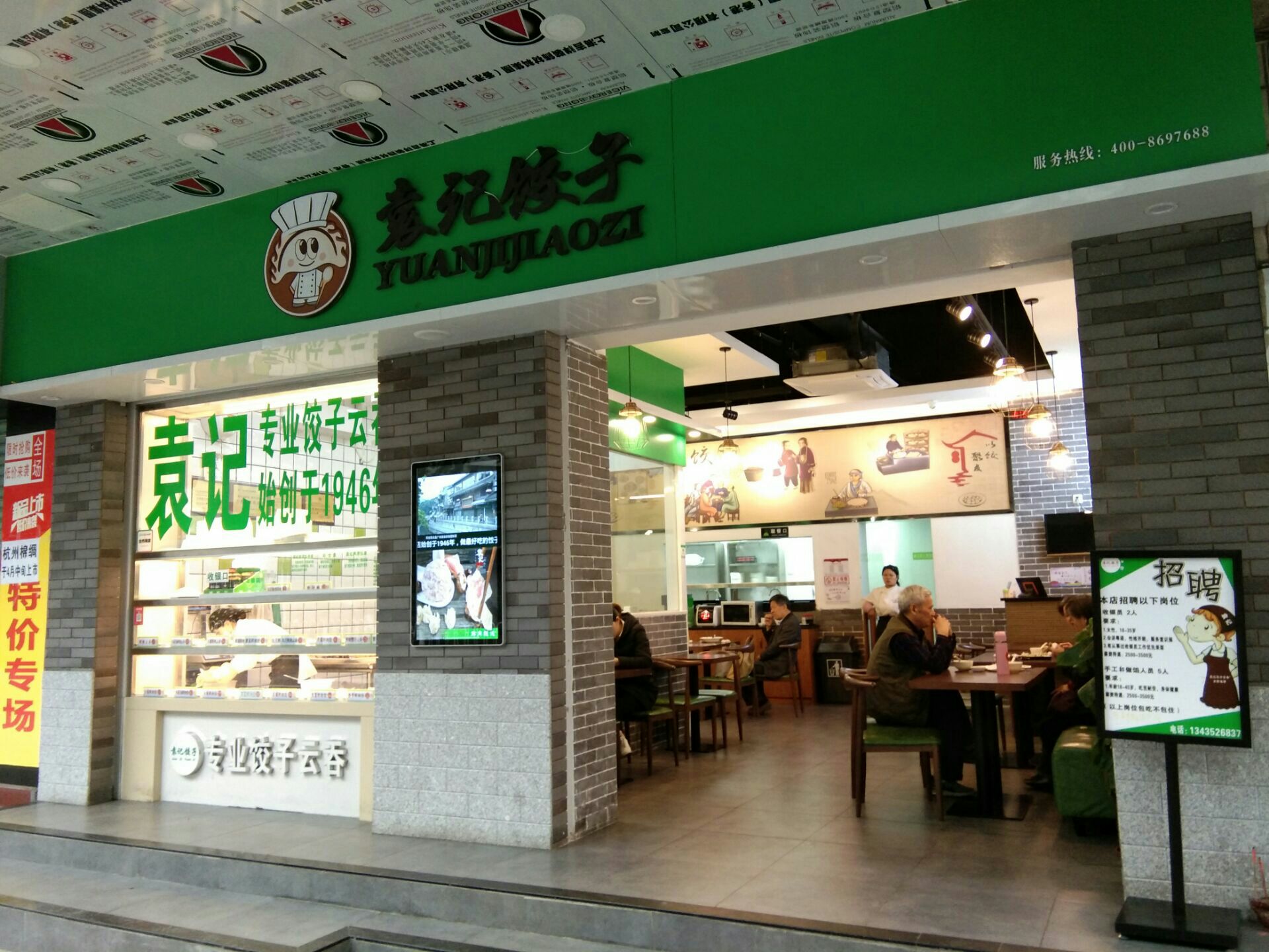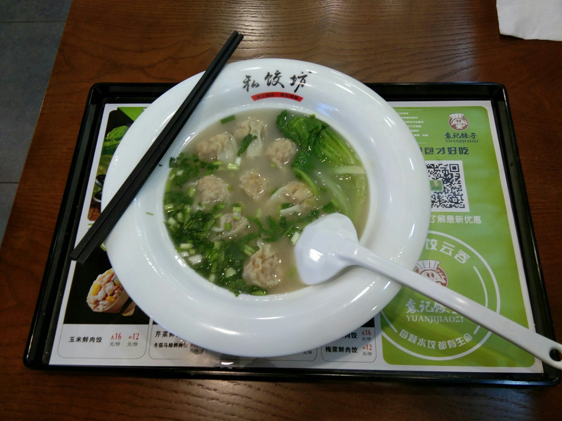 袁记饺子――网上有点评说歧视团购客,俺的亲身体验是没有啊!挺有礼貌的服务。原价12元小碗云吞或饺子(多款馅料可选),团购特价9.5元!俺选了马蹄冬菇肉云吞,挺爽滑鲜甜的!都是现包现煮的绝对新鲜!故略需等待。全透明的厨房让人看着舒服与放心。碗看着挺大也漂亮,实际份量正常吧。