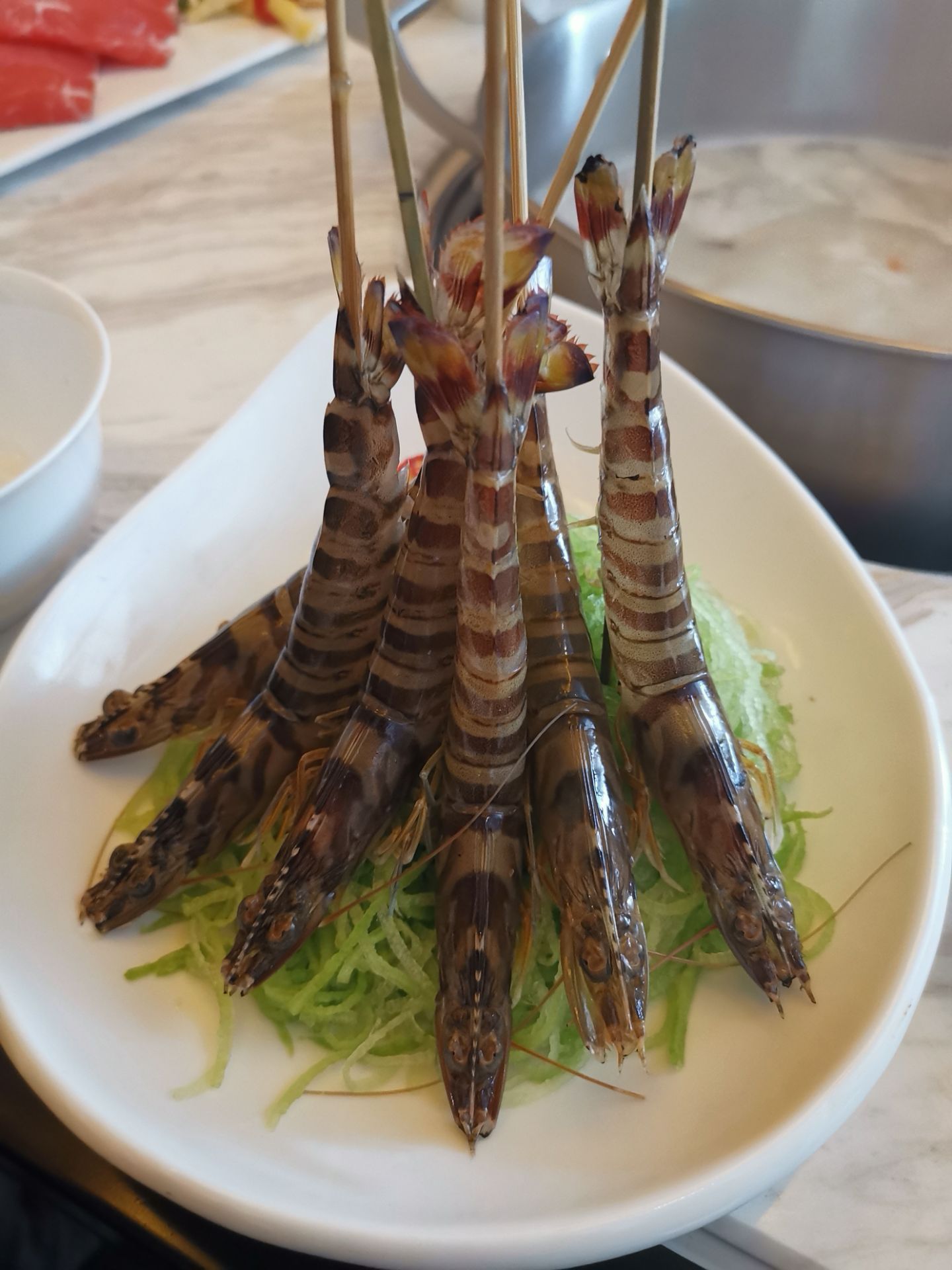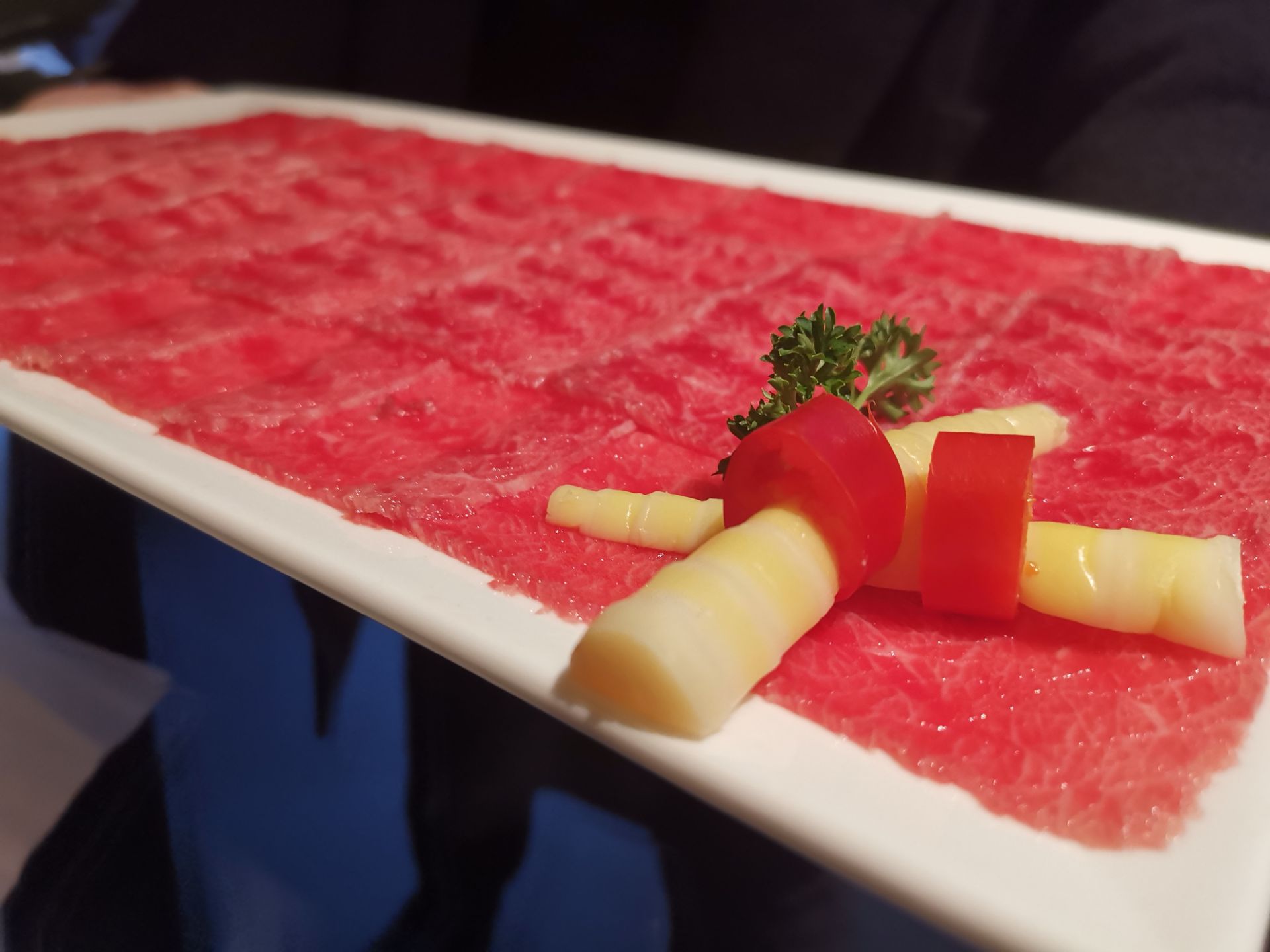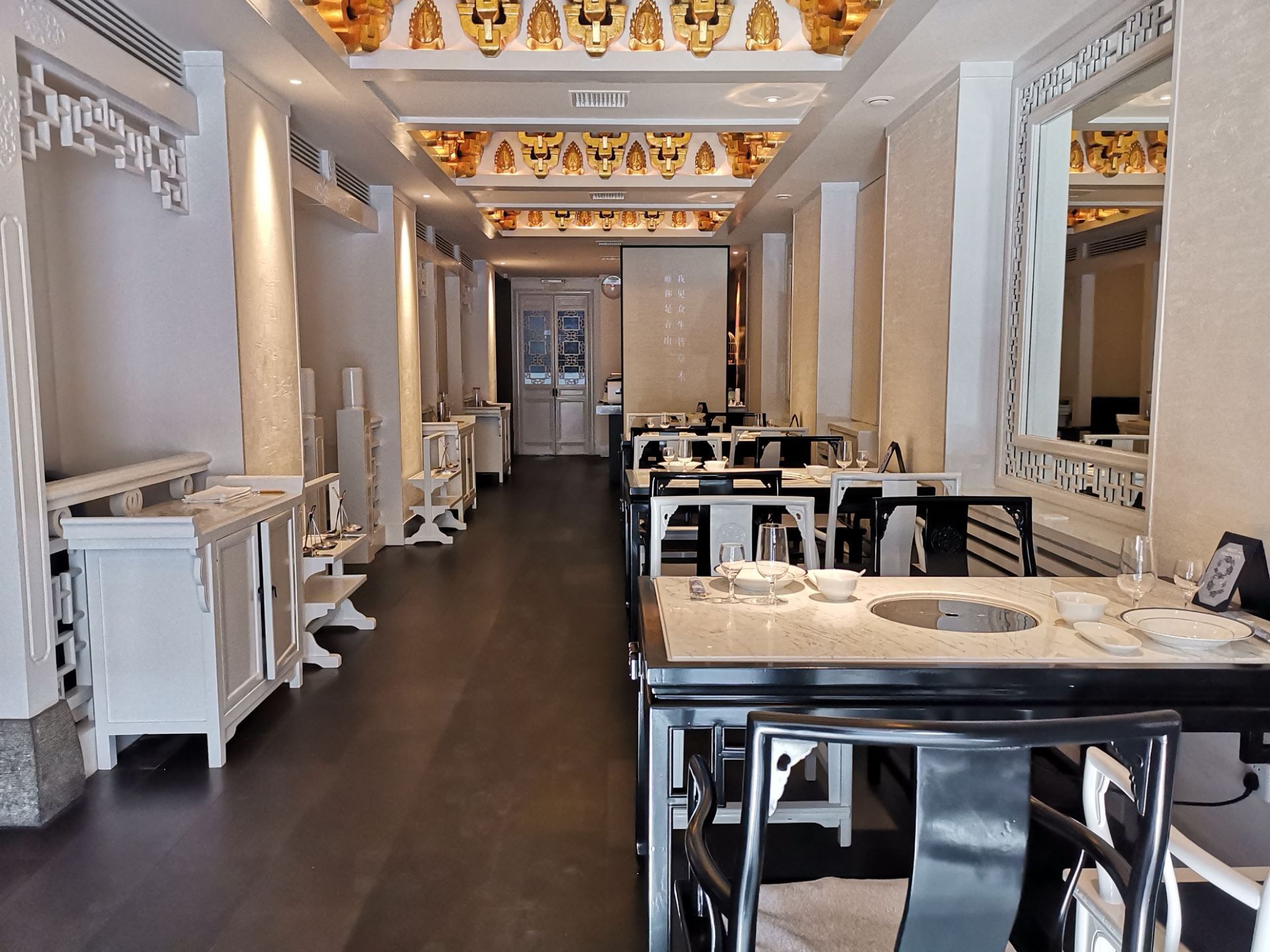 拔草了一家颇有档次的火锅店,汤城料青山,位于十一纬路40号。 从门脸看不出火锅店,店有两层。装修精美,一层散台,洁白为主色,非常漂亮。二楼有包房,各种装饰都十分的上档次。餐具也是精美绝伦,看着都很贵重。 服务态度挺好的,我和朋友选的招牌松茸锅底。松茸顶级食材,汤确实鲜美。可以先盛一碗直接喝。 这里的酱料是特制版,叫八味酱料。盘中八个小格,不同食材,然后把这些按个人口味都倒进餐盘中加上店内特制海鲜汁,咸鲜香。 食材很干净,质量也是上乘。多数菜品还是偏港式,肉类不散,菜类清新,还有其他东西也都可口。炸响铃我很喜欢吃。 松茸汤底吃完胃很舒服,没有丝毫的不适。吃完这顿,精神焕发了许多。