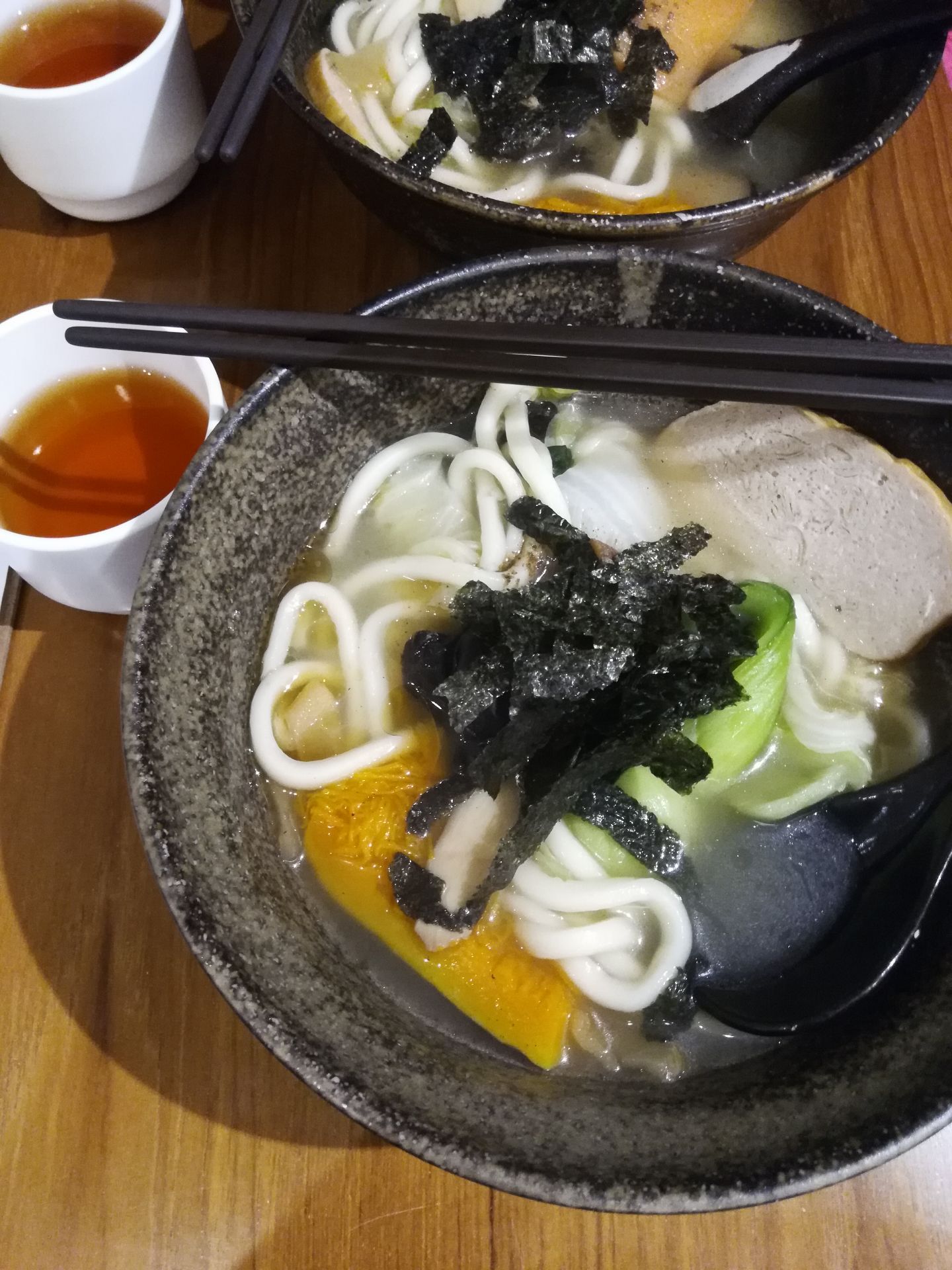 晚上从宁夏夜市回来,从捷运双连站出来,路上经过这家店,晚饭看见门口的招牌推荐杂锦乌冬面,又累又渴就吃个汤面吧。店铺不大,一楼一边是厨房一边靠墙有一列座椅,点餐后发现这家店的招牌是甜品——麻薯和刨冰,但俺们就选了汤面。看见别的桌上来的麻薯是干的,一颗挺大,上面撒了粉状的配料,估计是花生粉之类,用竹签叉住吃,对于俺口干的人来说一点也不吸引。乌冬面上来了,挺大一碗,蔬菜比较多——上海青、红萝卜、笋、南瓜、香菇等等,蔬菜都很好吃,还有一片类似豆干的,汤底还可以。乌冬面QQ的。 店门口还有个捐发票箱,俺就把前几天的发票都捐啦。