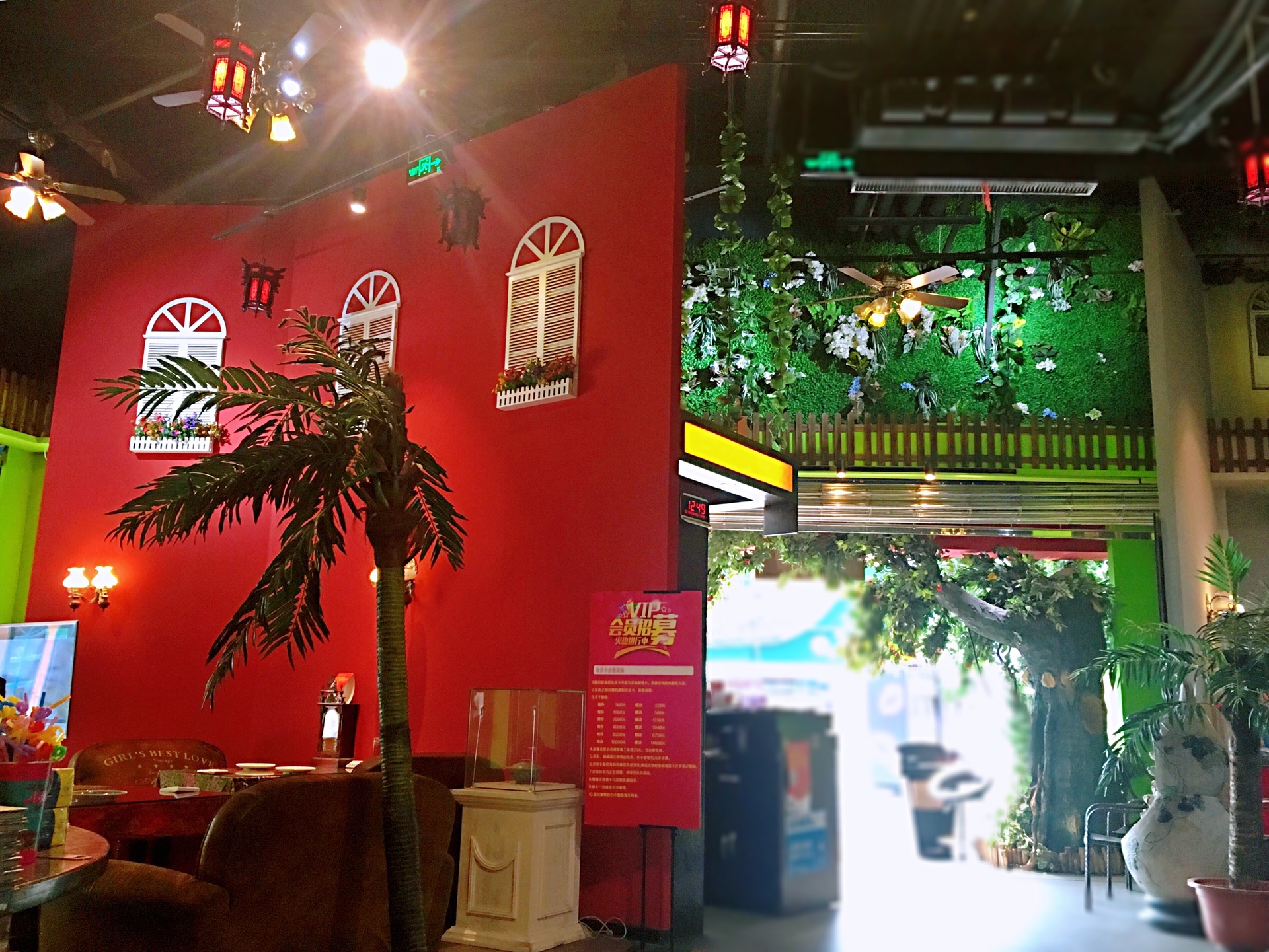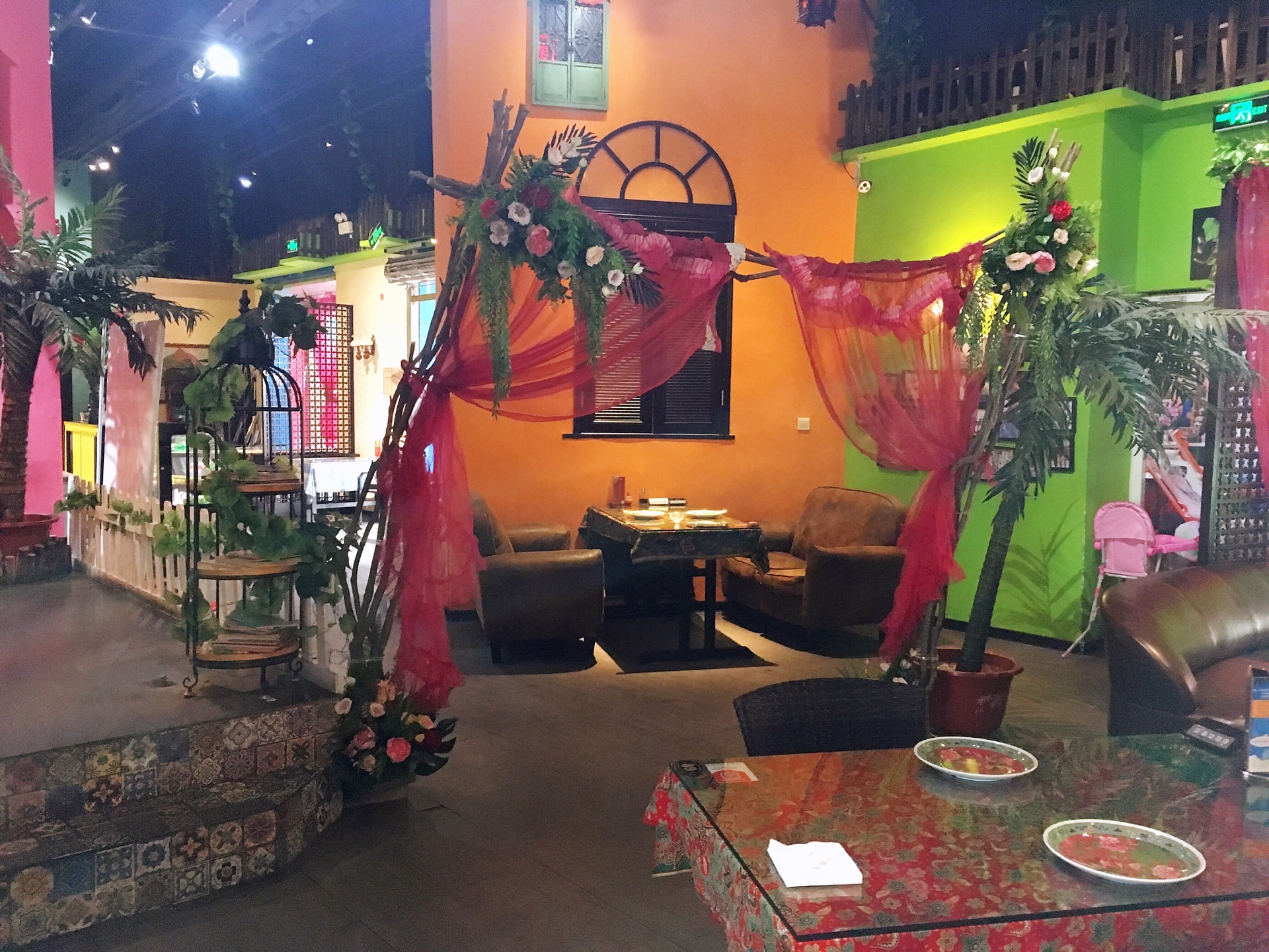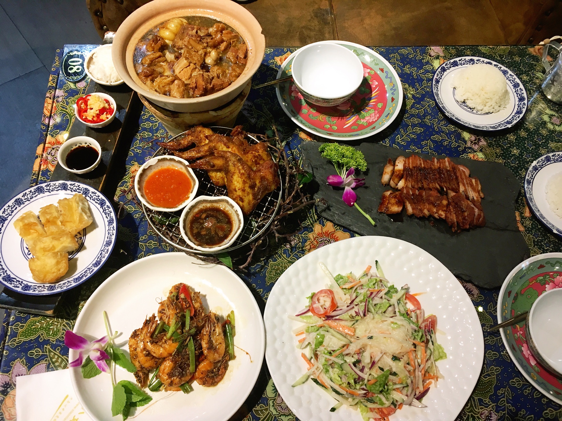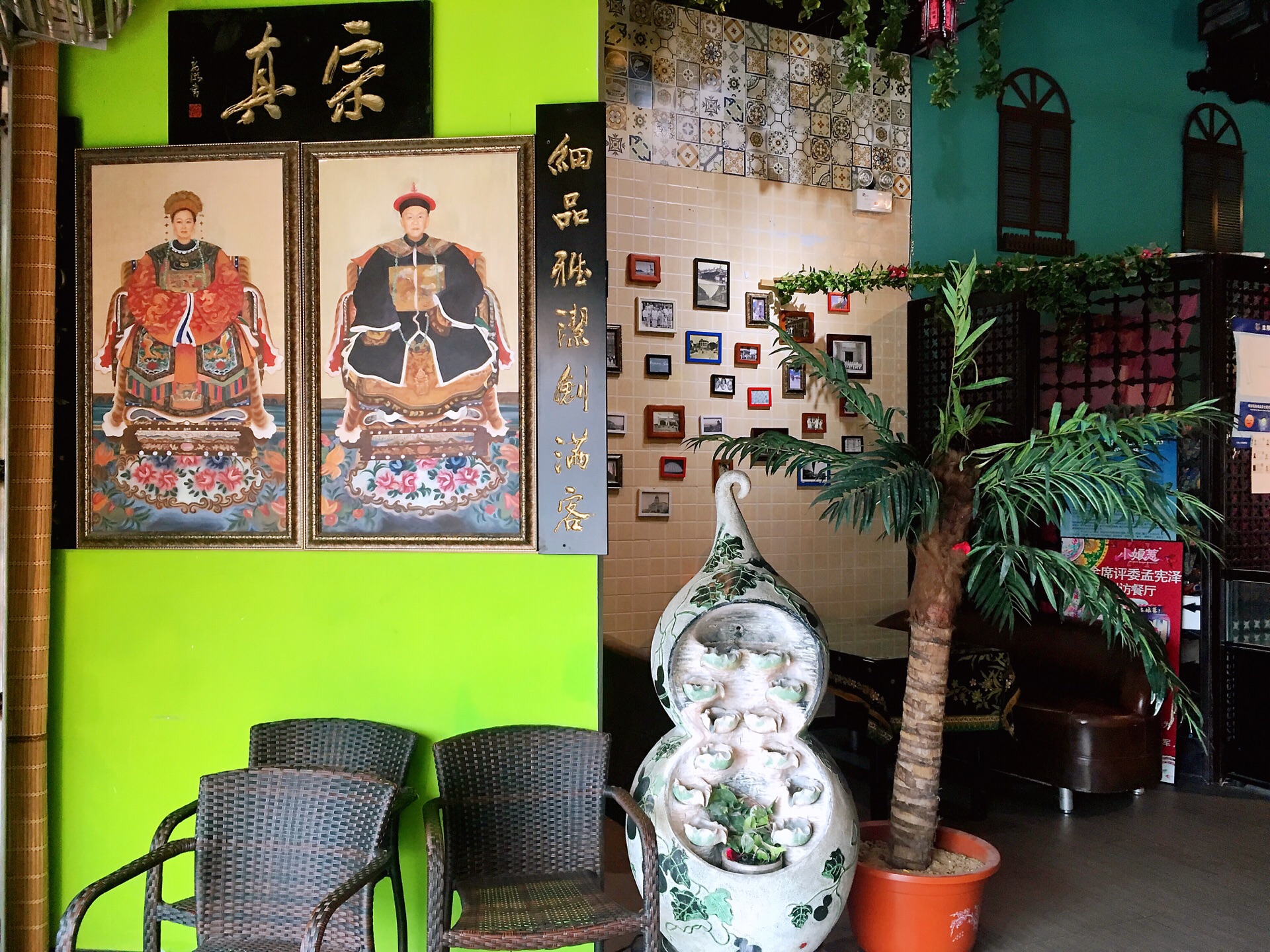 餐厅内部的面积其实蛮大的,举架特别高,就搭建出了一种森林般的感觉。几乎每个餐桌旁边都有一株椰子树,每一个餐桌的装修风格都是古色古香的。最喜欢他们家的吊灯,这种古色古香的宫灯一直是我的最爱。餐厅的中间部分竟然还有一个幔帐,还是挺有东南亚风格的。整个餐厅的墙壁都做成了窗户的形状,提高了餐厅色彩的明艳度。 『巴生肉骨茶』这是传统的东南亚菜,来之前特意查了一下,马来西亚传承的是我国福建的菜系,因此是苦中带甜。而新加坡传承的是我国海南的菜系,因此是甜辣口味的。茶其实是药汤,福建人忌讳说药而改说茶。砂锅炖煮,里面的食材很丰盛,包括猪排、猪肘、猪蹄、豆腐泡、油条,搭配米饭、酱料、辣椒和蒜。汤汁特别鲜美,平时不太爱吃米饭的我,都吃了整整一碗米饭。 『黑椒虾』摆盘中的这朵花,突然让我眼前浮现出别在少女头上的鲜艳的小花,黑椒虾稍微有些辣,甜辣的口感。 『娘惹烤翅』感觉这样三个烤翅都好大,微辣的口感,不细品感觉不到的微辣,蘸料有辣椒酱和调和酱料。 『蜜汁黑叉烧』餐具很有趣,是一个不规则的木板造型。这次的叉烧竟然以精瘦肉为主,很是惊艳,配上蜜汁,甜而不腻,很喜欢吃。 『酸甜蔬菜沙拉』在普通的蔬菜沙拉里加入了粉丝,更奇特的是加了山药,口感特别好,最开始我竟然以为是荸荠。 『洛神玫瑰茶』玫瑰红的颜色很是鲜艳,酸甜且偏酸的口感,解腻又好喝。