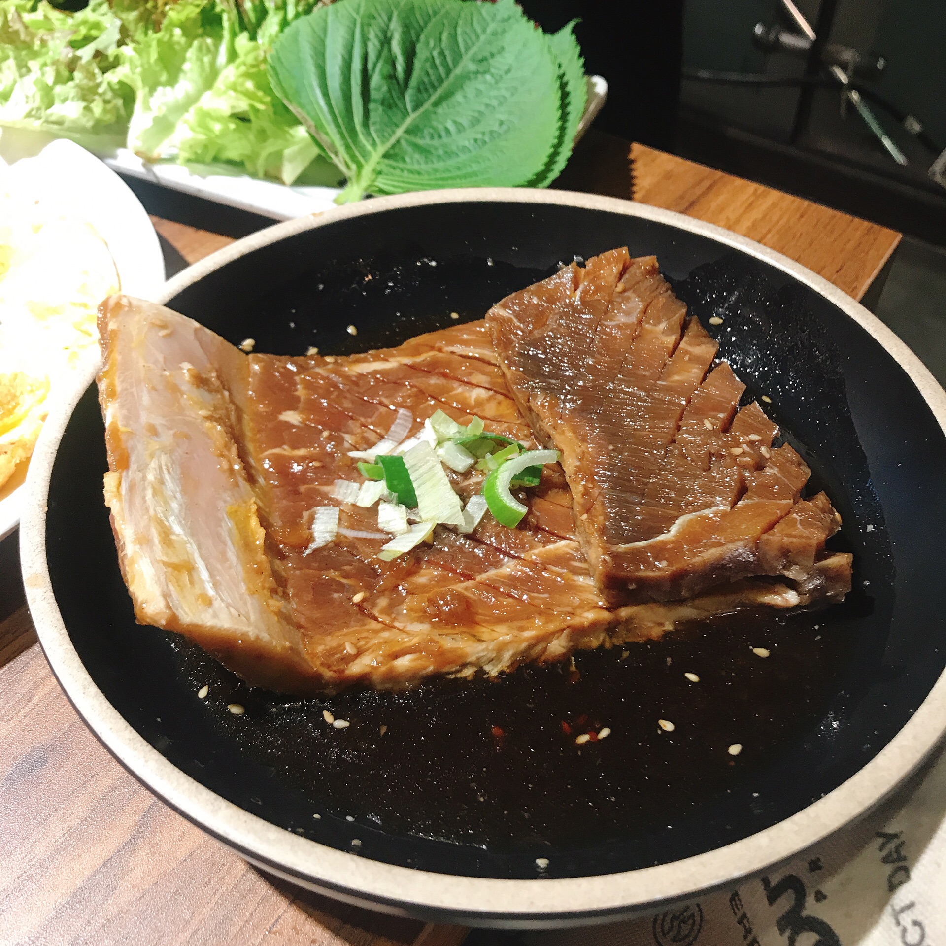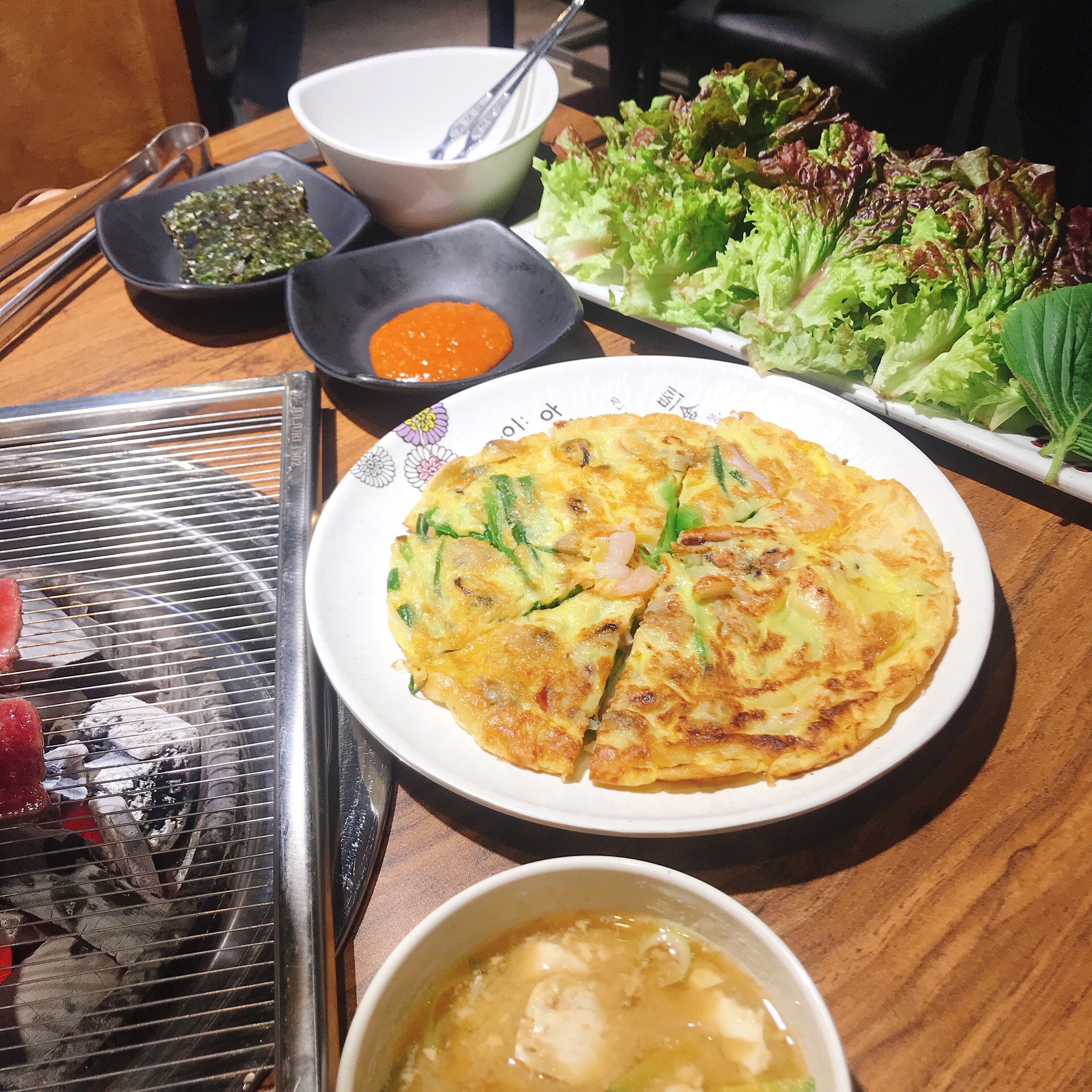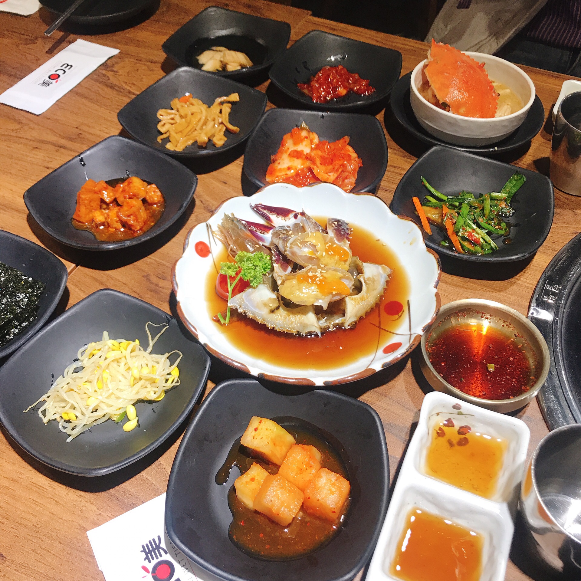 第一次尝试酱蟹,搜索好久找到这家,不愧是好评率超高的店铺,我们六点左右过去一楼已经满了,建议大家去的话坐2楼,可以看演出听听歌~菜单有中文,餐厅的员工都能讲中文,点菜比较顺畅[呲牙] 我们点了一人份酱蟹,雪花肥牛、排骨肉,主食点了份海鲜饼~酱蟹我是初体验,有提供专门挖螃蟹的小勺子,我直接捧着一吸,蟹肉像果冻一样就吃到嘴里啦,口感很特别,不过一定配饭或者饼一起吃,因为有点咸~烤肉的话我建议尝试雪花肥牛,肉质很新鲜,特别嫩!蘸盐和香油吃无敌美味~晚一点的时候喝点酒听听音乐看看演出,也是相当舒适啦~ 总体来说还不错,值得再来哈哈~