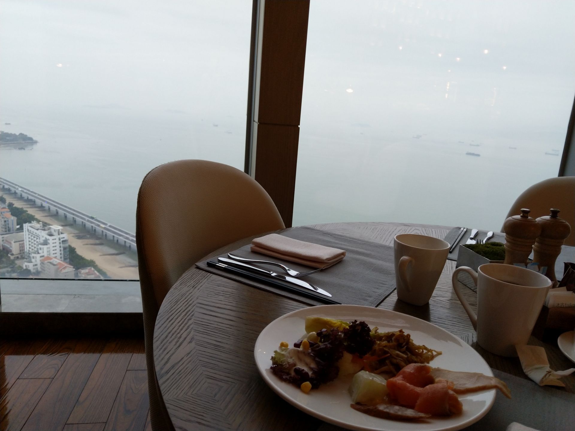 这个餐厅的食材品质还是可以的,价格也算是合理吧位于世贸大厦其中一幢的38层,这层也是康莱德酒店的大堂和咖啡厅也就是这个餐厅,在38层感觉不要太好啊能看环岛路又能看鹭江。这个餐厅的食材品质还是可以的,价格也算是合理吧。