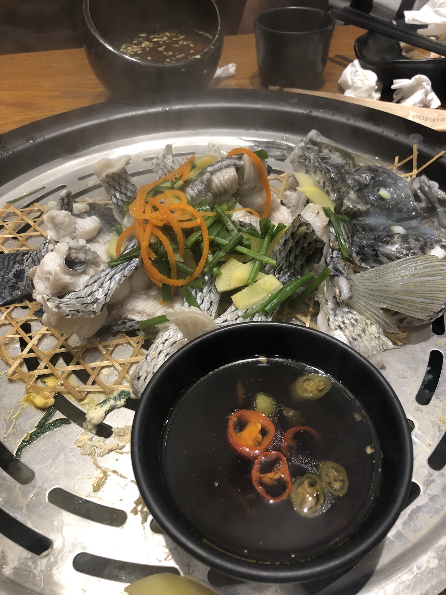 小伙伴推荐的清蒸海鲜店,现在各大平台有团购活动,人均也就130多一点吧。主要海鲜都是蒸出来的,比较清淡,但是将萝卜吃多了,还是渴得不行,套餐量比较大,还是建议四人套餐四个人吃,我们没吃完。对了,那个牛蛙太麻辣了…