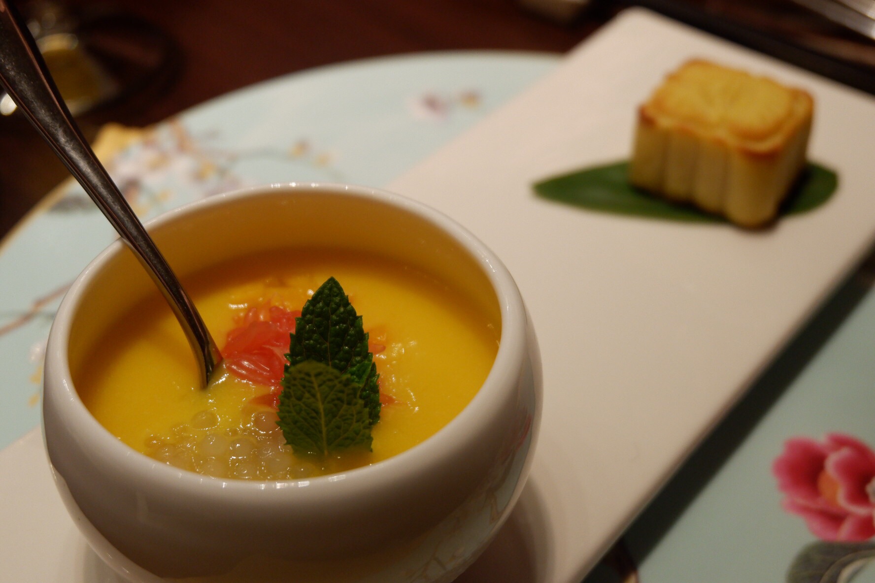 乐美中餐厅 一直都很喜欢的一家酒店中餐厅了~ 春天到了,很多餐厅的春季菜就很值得期待了 这里也是其中之一,所以约了朋友过来。 这边其实涉及的菜系挺多的, 主要是江浙菜为主,还有点川菜的口味。 冷菜点了三样,都是个人很喜欢的 千张包是杭州经常可以听说的一款, 肉多,千张厚度合适,口感也好,很入味。 螺肉带着点辣的是,很多人不吃是因为怕麻烦 但这里会帮忙全部挑出来,特别赞! 口水鸡,辣度调得很合适了,不会觉得重, 回味中带着点点淡淡甜味,很满意,口感嫩 吃完冷菜就要先来一碗开胃汤, 万豪系的酒店炖汤从来没有让我失望~ 很滋补,没有太多添加调味,原汤的鲜美 红烧巴鱼,巴鱼是养殖的河豚,无毒,在江苏应该可以见的更多,算是淮扬菜里的江鲜,果然不出所料,巴鱼肉超鲜的,能吃超多! 鲥鱼,又是江鲜之一,江南三味之一,吃这个一定是要带着鱼鳞一起的,营养价值相当高,蒸的做法可以使之更佳~春季可以说是必点菜了,心头好。 春笋当然是这个季节必须要点的时令菜了,油焖春笋在杭州是最常见的做法,烧的很入味,口感爽脆,笋挑选很不错。 香椿炒蛋,香椿也是很有名的时令菜了,而且本身功效就多,趁着这个季节也是要尝一下的至少,香椿和鸡蛋可以说是融合的很好了,口味事宜,端上来特别香。 最后点心再来一道杨枝甘露配酥,特别完美~
