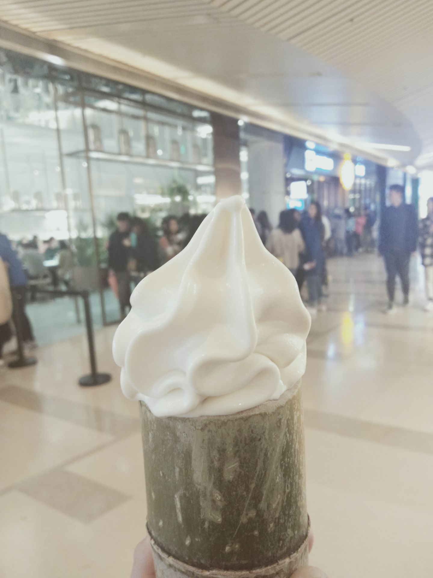 周末打卡特色网红店。 三里屯的这家青山研究所太有人气了。 周末进店吃甜品需要排长队。 还好外卖窗口不用等位就能享用同样的美味。 【竹筒茉莉花冰激凌】 现在特价,10元。竹香的竹筒当容器,很有特色。茉莉花味很浓郁。还给了小勺挖冰激凌吃。吃后留着竹筒也很好。