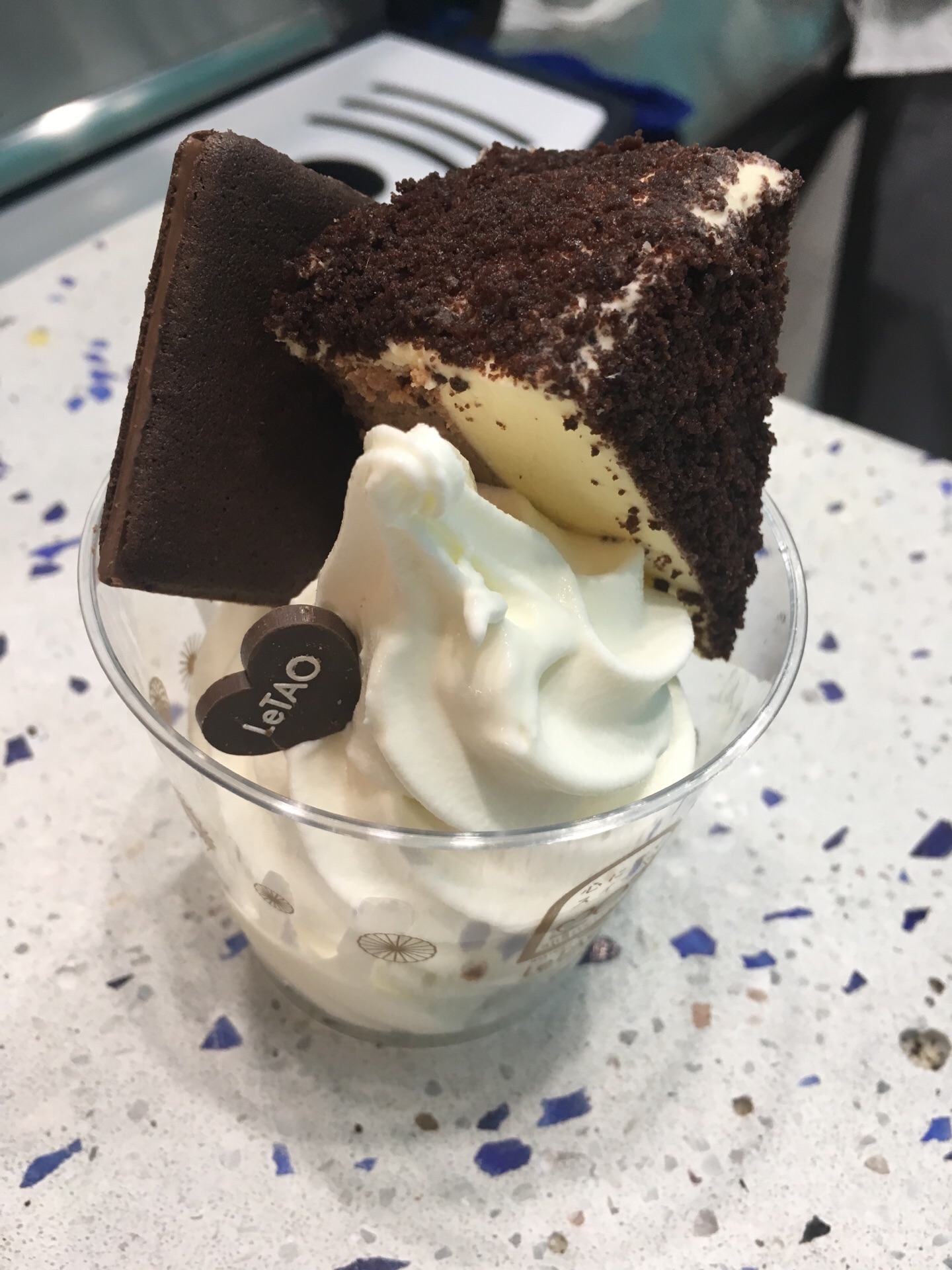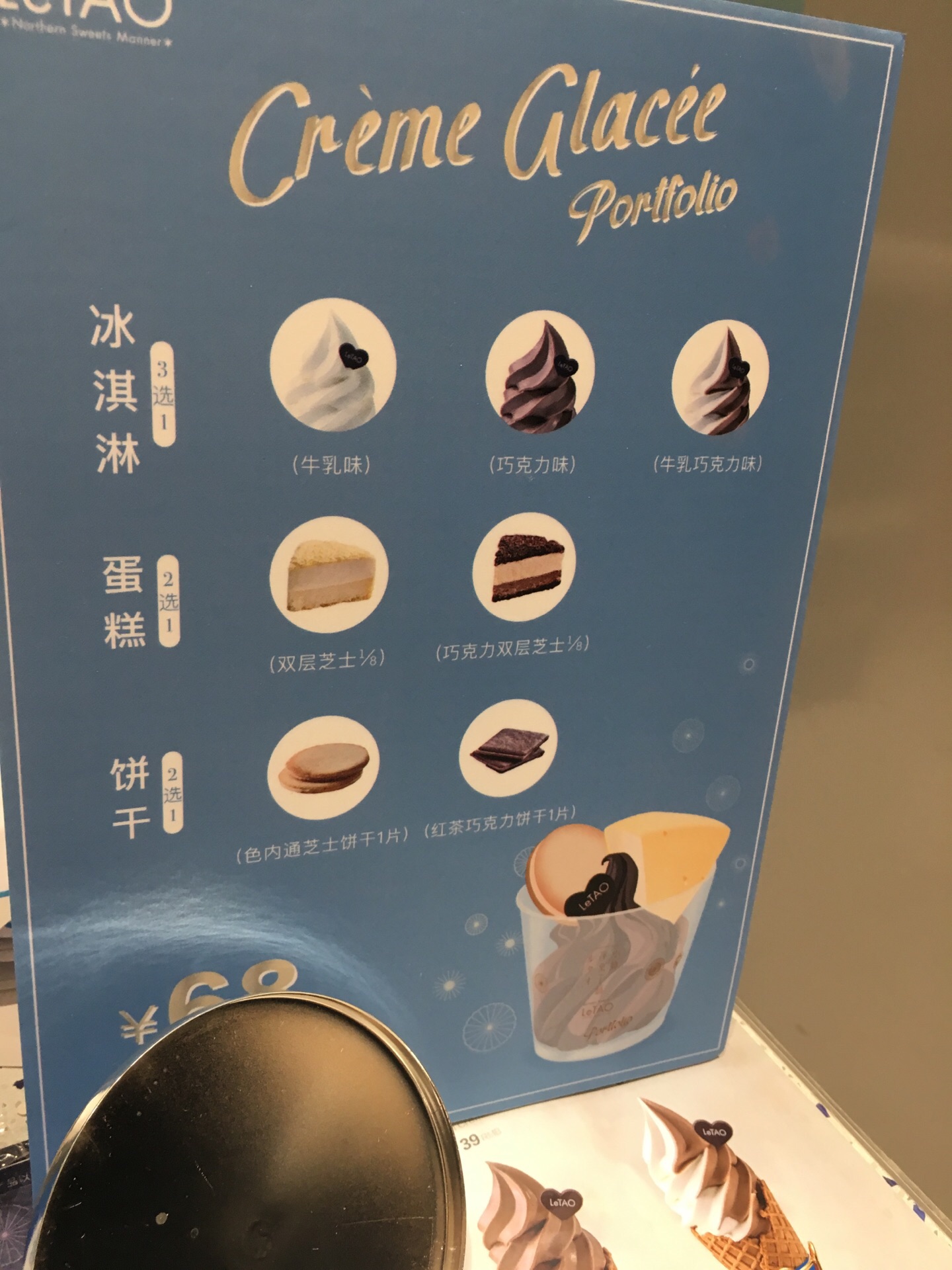 LeTao国金中心店,就在电影院对面,这家座位是去过的上海三家店里最少的,只有3张桌子,6个座位。到的时候坐满,就买了冰激凌组合68元,八分之一双层巧克力芝士蛋糕加牛乳冰激凌加一片红茶巧克力饼干,牛乳冰激凌奶味不足,最后站着吃的。 进店有店员在发芝士饼干试吃,每次去日本都会买这个啦,看了下店里价格是日本价格两倍还多。