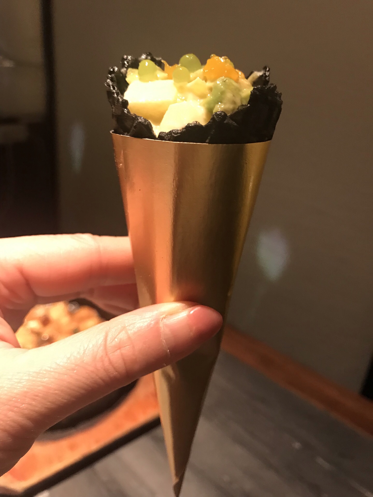 桂满陇万象城店,是我常去的如食堂一般亲切的杭菜馆。从当年的网红店,到如今遍布市区每一个角落的连锁餐饮企业,开一家火一家,适合男女老少一切人群。如此亲民的餐馆,自然是有他独到的经营理念和过硬的菜品质量。摆盘的讲究一如当年,端上来的菜,不管量多量少,总是精美如画,难得还始终味道好吃。这次点的甜筒牛油果沙拉是以前没有点过的,味道很好,既是冷菜,外面包了一层饼干甜筒,也可以当点心。东坡肉是百吃不厌的经典,石锅沃豆腐的味道不在东坡肉之下,端上来时还在沸腾状态下,翻滚的泡泡冒着热气和香气,妥妥地勾出了你的馋虫……