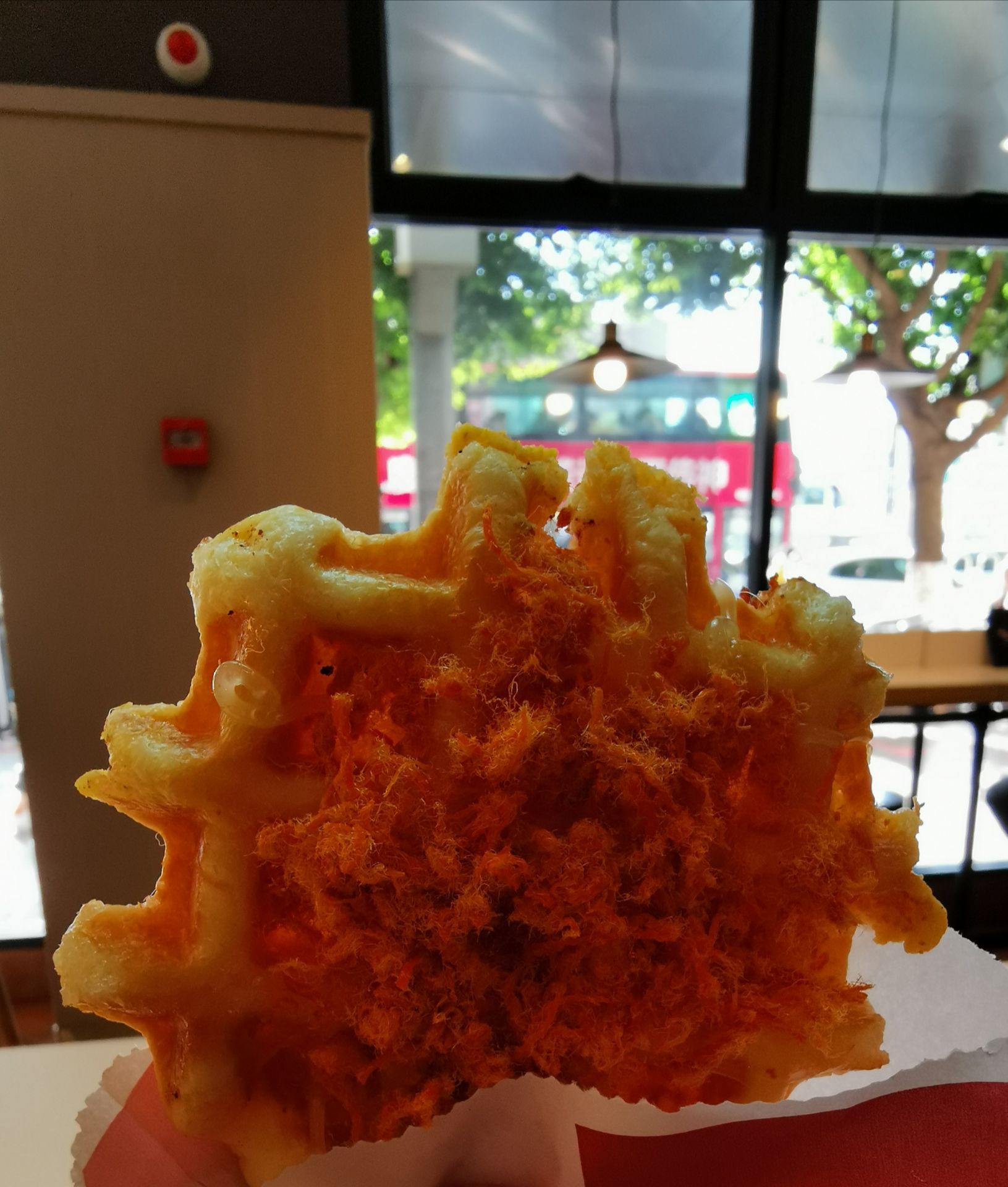 路过这家肯德基,忙里偷闲吃点东西。愤怒的华夫饼挺有创意,馅料是蛋黄,表皮撒上了肉松,这种组合味道竟然毫无违和感,唯一缺点是肉松粘性不够,容易四处飞溅。蛋挞还是一如既往的香甜,再搭配一杯类似果粒橙的茶饮,最后打包一大盒黄金鸡块,满足!