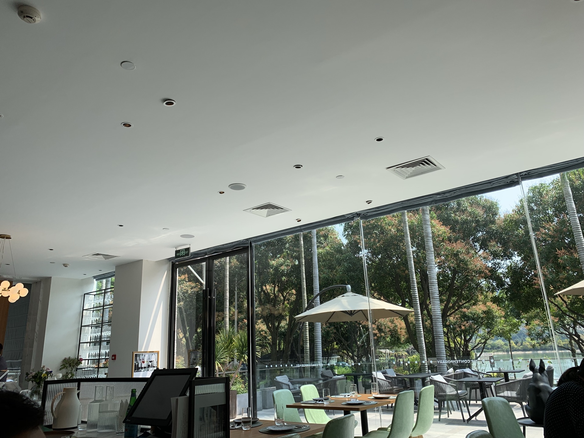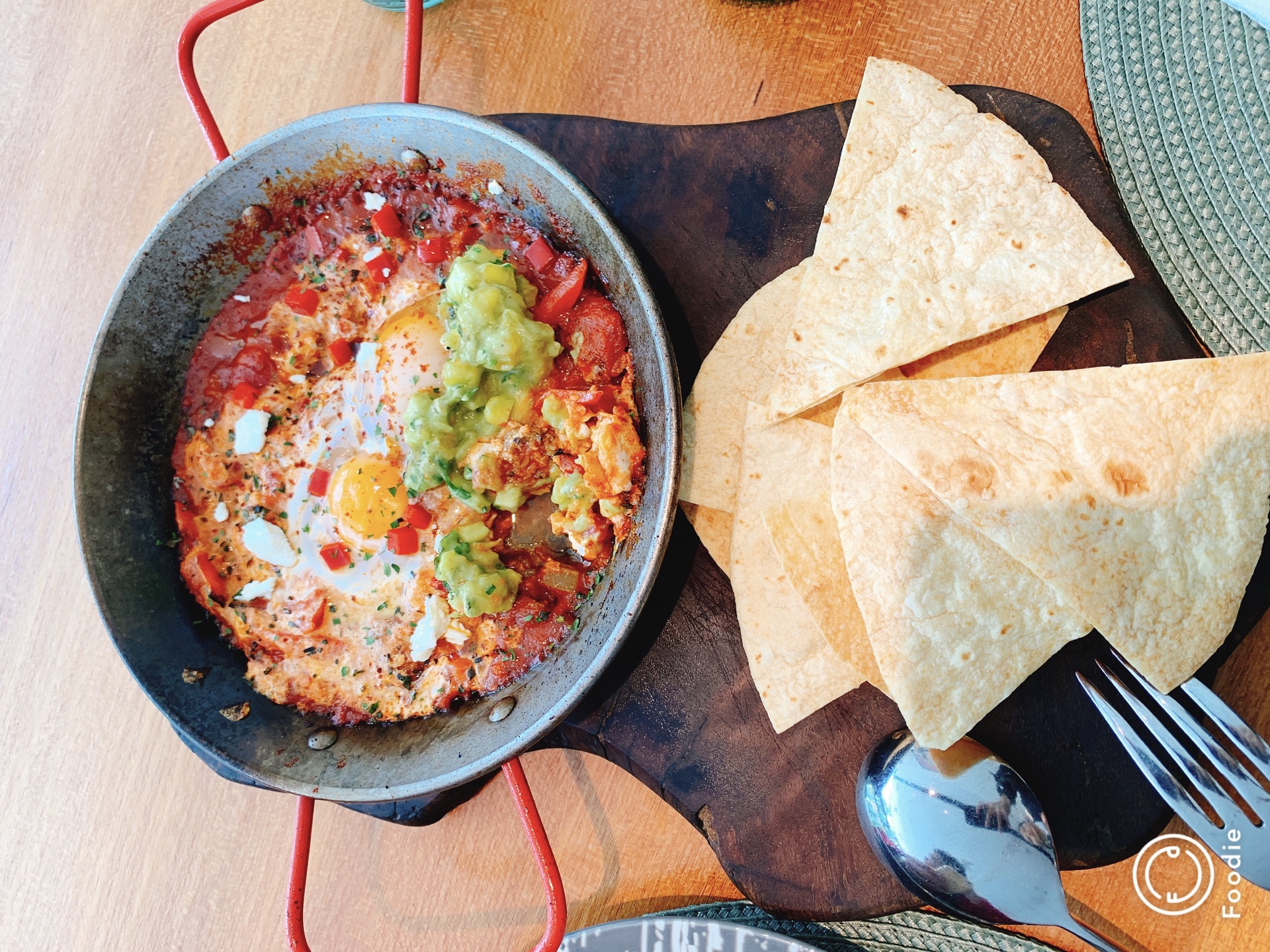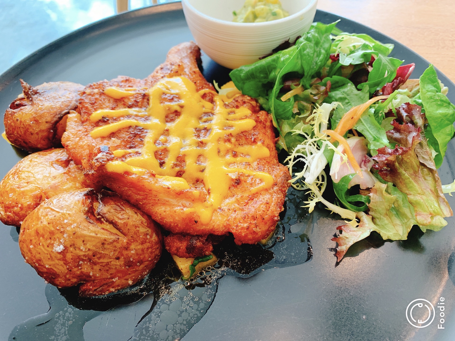 驱车来买拿破仑,路边的时候就被这家店整面的落地窗和里面干净简约的装修吸引了,刚好吃个午饭。 [环境]位于lv隔壁,推拉门不起眼,倒是一堵简约的墙吸引人。里面空间大,座位不少确也不拥挤,靠窗位置可以近览外面湖光水色,真是惬意。 [服务]服务员热情,绅士有礼,细节都做的到位。 「墨西哥式焗蛋」看旁边点了两份,好奇心让我也打算试试。上菜时候觉得有点失望,又是卷饼,早上才吃的。不过吃下去觉得还是不错,这个饼是脆脆的,加上酱料,咸香酥脆又有酸甜的融合。 「康沃尔式鸡」很大一份,烤鸡金黄不腻,有机土豆烤出来也绵密香,酱料酸甜有点回味。