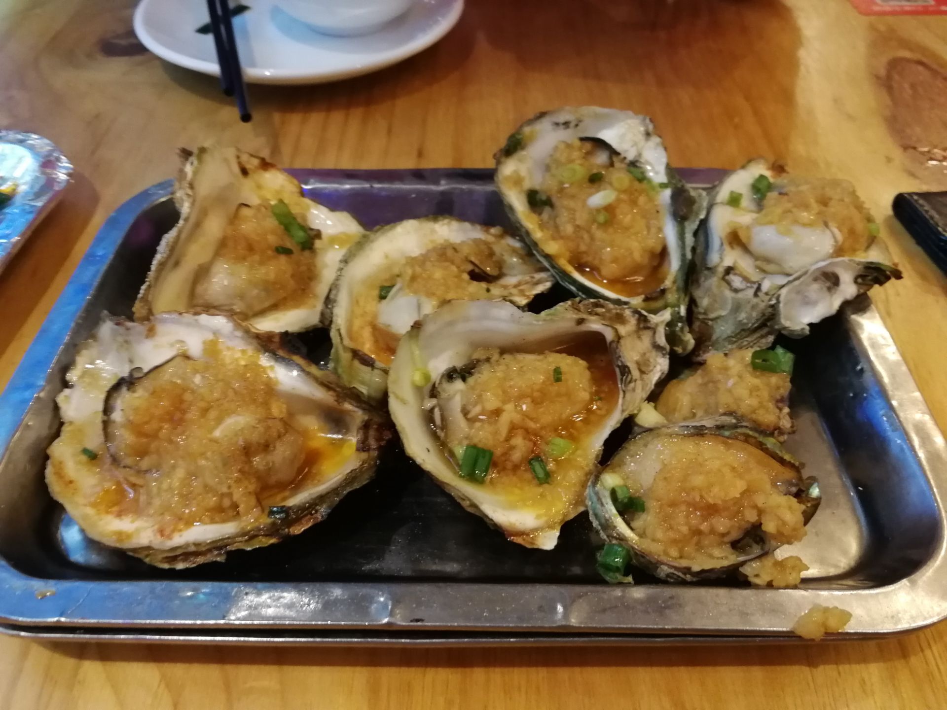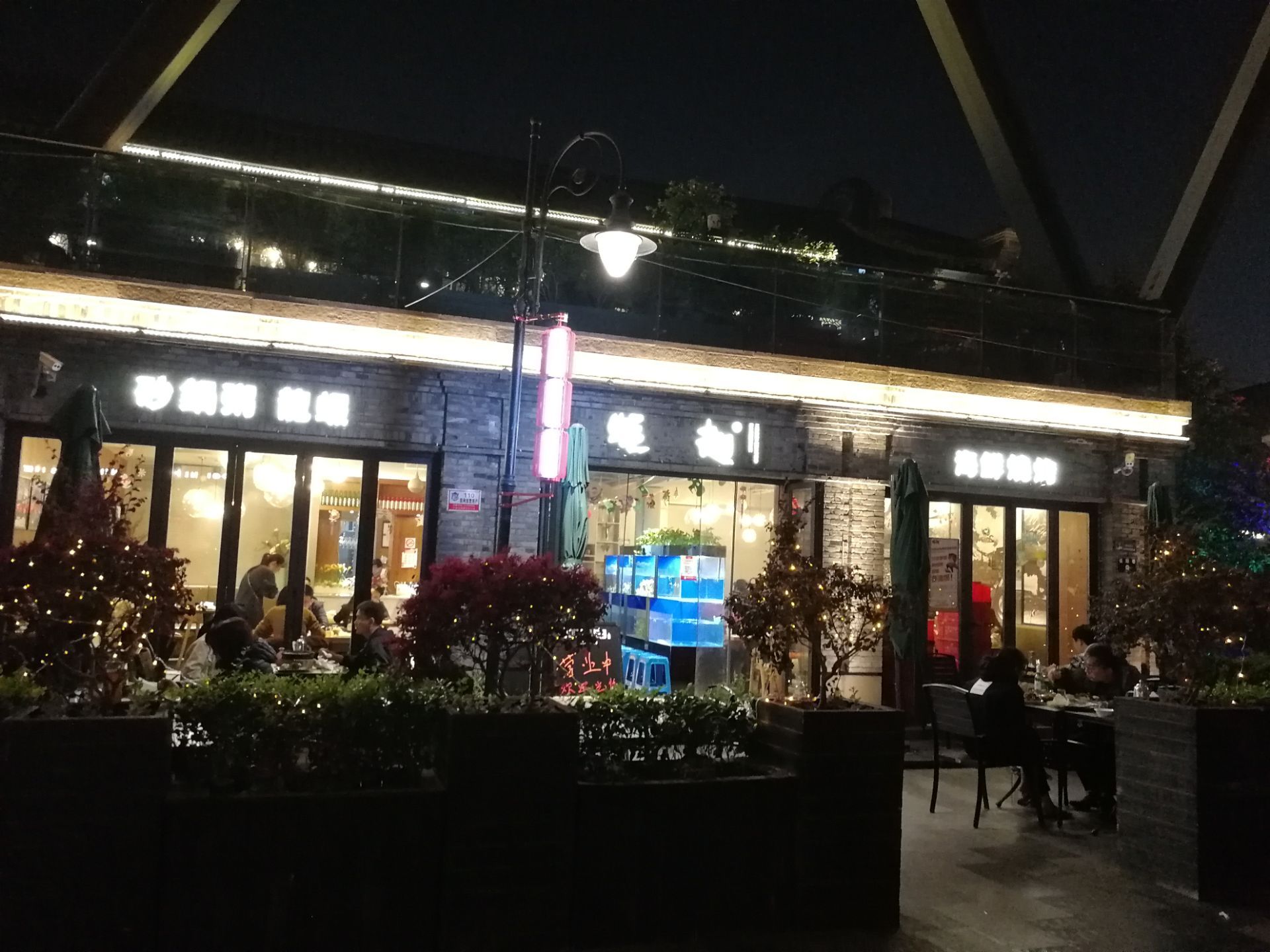 在仿古商业区月湖盛园的盛园街东端,虽然距离城隍庙、月湖、宁波站都不远,但地理位置有点尴尬,公共交通不太方便,我们是骑共享单车过来。两层楼的建筑,外面还有一定的露天座位,合共能容纳过百人,不过据说用餐高峰时段等位厉害。我们晚上9点多到,人不算多可以直接就座,但过了10点还见到前来就餐的食客络绎不绝。开业到凌晨两点,看来也是个知名的宵夜店。主打烧烤和砂锅粥,前者较实惠,后者不便宜。食材比较新鲜,烤的技术不错,不会觉得很热气,但口味偏咸了。不知是否年纪大了,感觉下油也多,不应该吃那么撑对肠胃也不太好,年轻人就忽略吧,