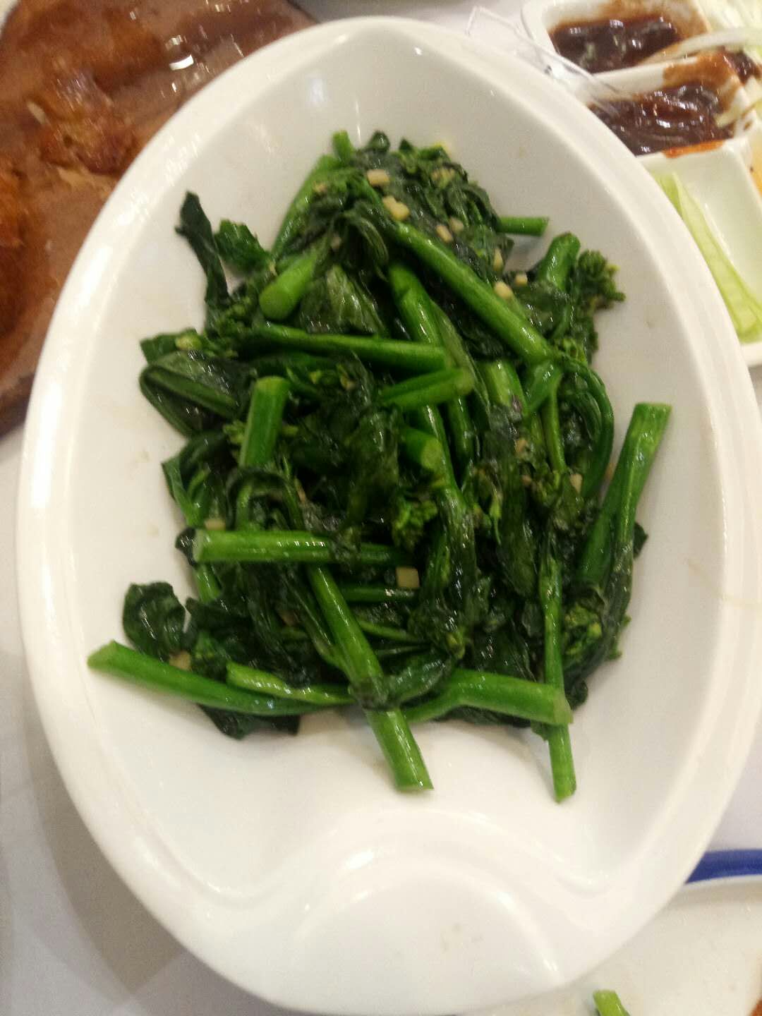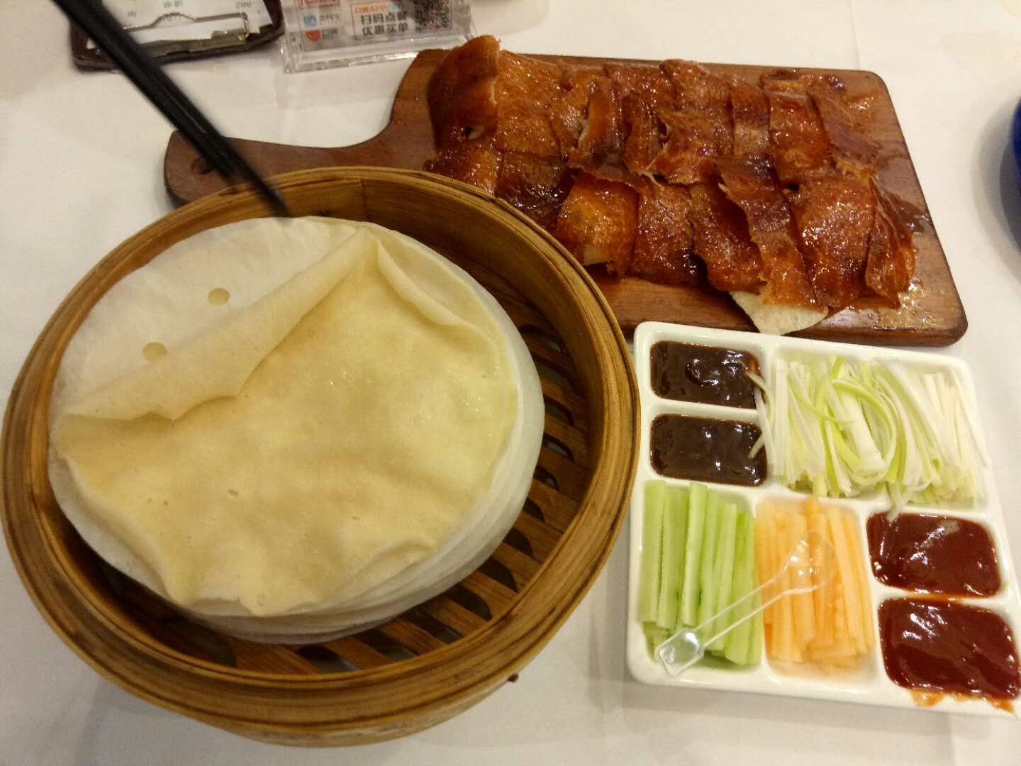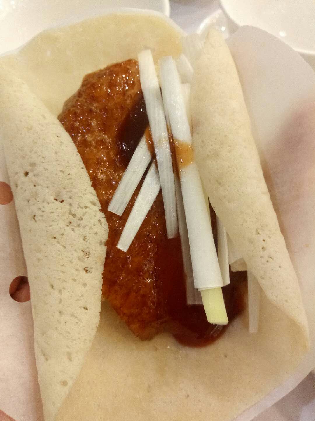 有一段时间没有来这里吃饭了,这次再来恰好碰上他们每月的会员日,每月的第二个星期一,可以使用积分抵扣消费金额,或者不抵扣现金就可以双倍积分,而且他们每周一的“自助水果餐”继续供应,非常不错!水果都是应季新鲜,杨桃、芒果、葡萄、橙子、火龙果、哈密瓜等等;还有糖水,芋头西米露、木瓜银耳羹、黑芝麻糊,全部不限取,当然好东西还是有限的,太多人拿,走两回就没了,比如芒果、葡萄,想吃好的早点去排队,晚上七点准时开放供应。 这次还点了一道“|片皮鸭二食^”,128元,服务员先把整只鸭片出脆皮,像北京烤鸭的吃法,用荷叶饼包裹烤鸭脆皮、虾片、大葱、黄瓜、蜜瓜、酱料等,卷好送入口中,真是别有一番风味,非常不错!另外的鸭身,我们选了用凉瓜焖,需要花些时间,等我们都吃完了才姗姗来迟,揭盖那会,香气扑鼻,焖得很入味!这就是他们的“|片皮鸭二食^”了,好值得推荐哦~ 其它几个菜也还可以,总体感觉还比较满意,记住周一来吧,一定会尽兴而归。