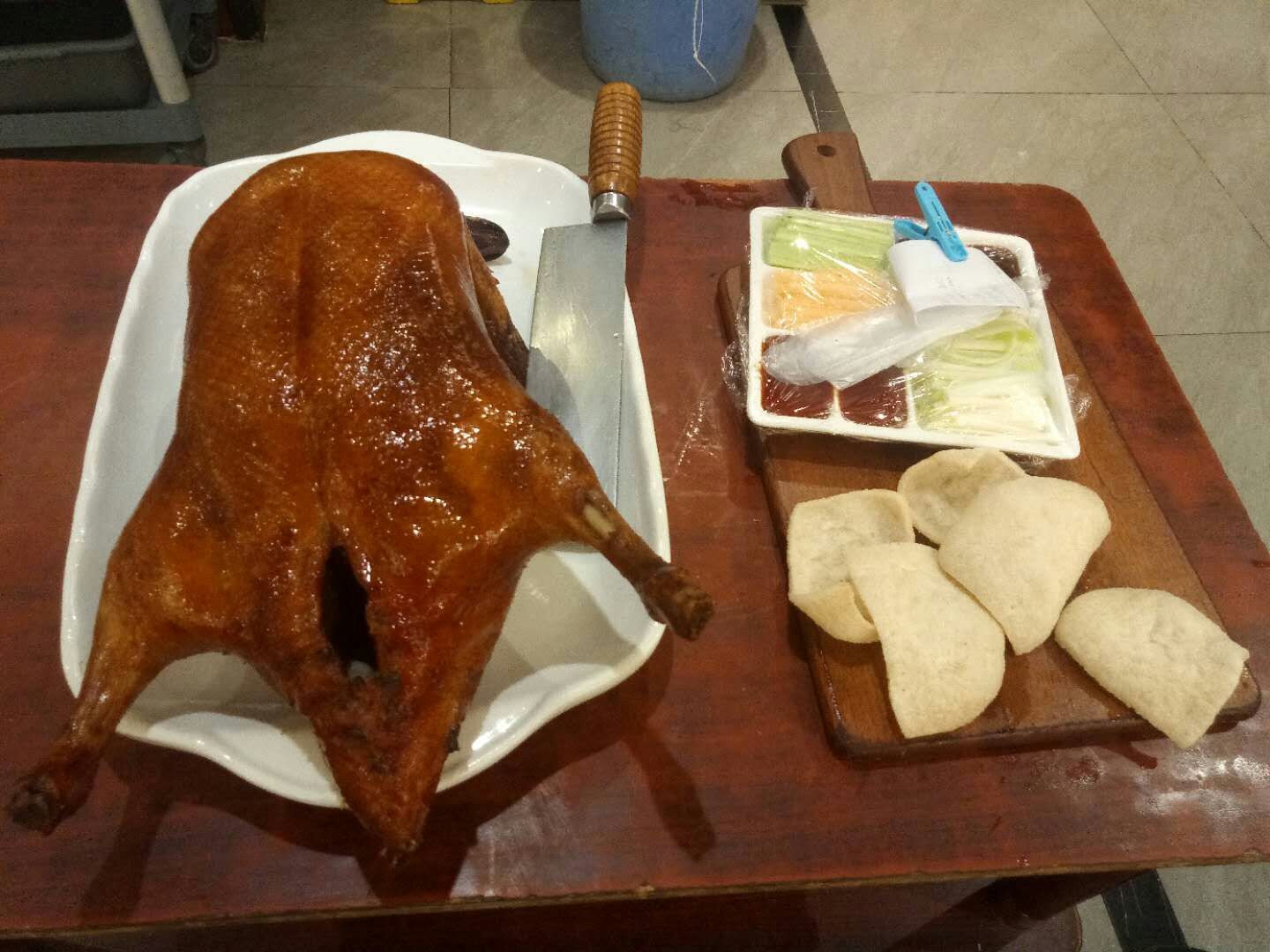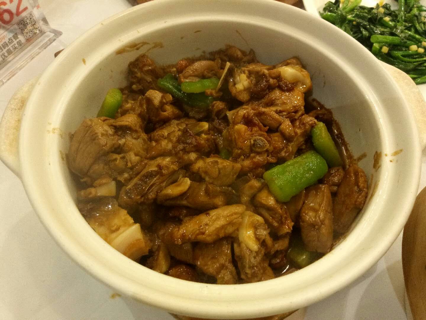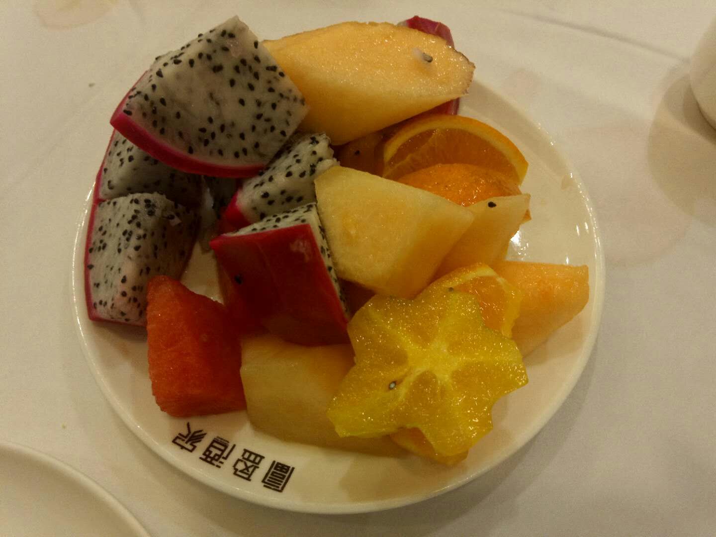 有一段时间没有来这里吃饭了,这次再来恰好碰上他们每月的会员日,每月的第二个星期一,可以使用积分抵扣消费金额,或者不抵扣现金就可以双倍积分,而且他们每周一的“自助水果餐”继续供应,非常不错!水果都是应季新鲜,杨桃、芒果、葡萄、橙子、火龙果、哈密瓜等等;还有糖水,芋头西米露、木瓜银耳羹、黑芝麻糊,全部不限取,当然好东西还是有限的,太多人拿,走两回就没了,比如芒果、葡萄,想吃好的早点去排队,晚上七点准时开放供应。 这次还点了一道“|片皮鸭二食^”,128元,服务员先把整只鸭片出脆皮,像北京烤鸭的吃法,用荷叶饼包裹烤鸭脆皮、虾片、大葱、黄瓜、蜜瓜、酱料等,卷好送入口中,真是别有一番风味,非常不错!另外的鸭身,我们选了用凉瓜焖,需要花些时间,等我们都吃完了才姗姗来迟,揭盖那会,香气扑鼻,焖得很入味!这就是他们的“|片皮鸭二食^”了,好值得推荐哦~ 其它几个菜也还可以,总体感觉还比较满意,记住周一来吧,一定会尽兴而归。
