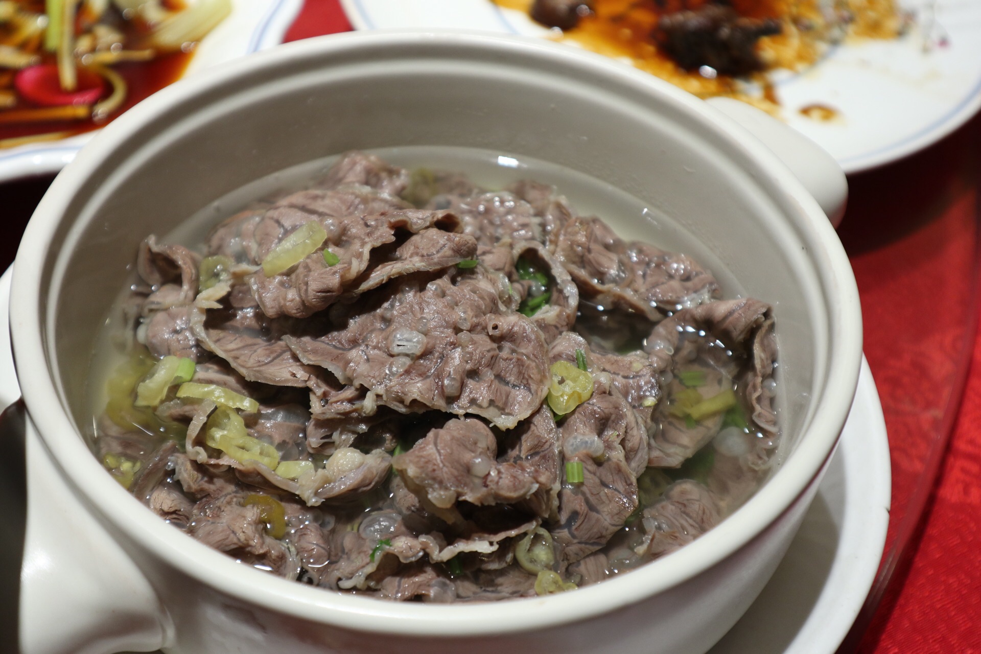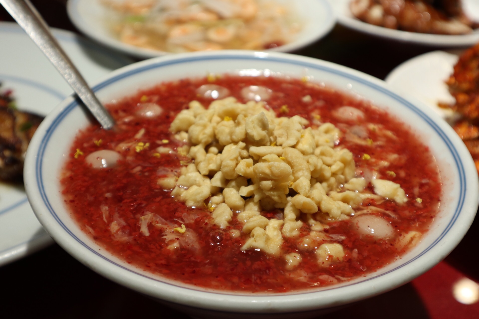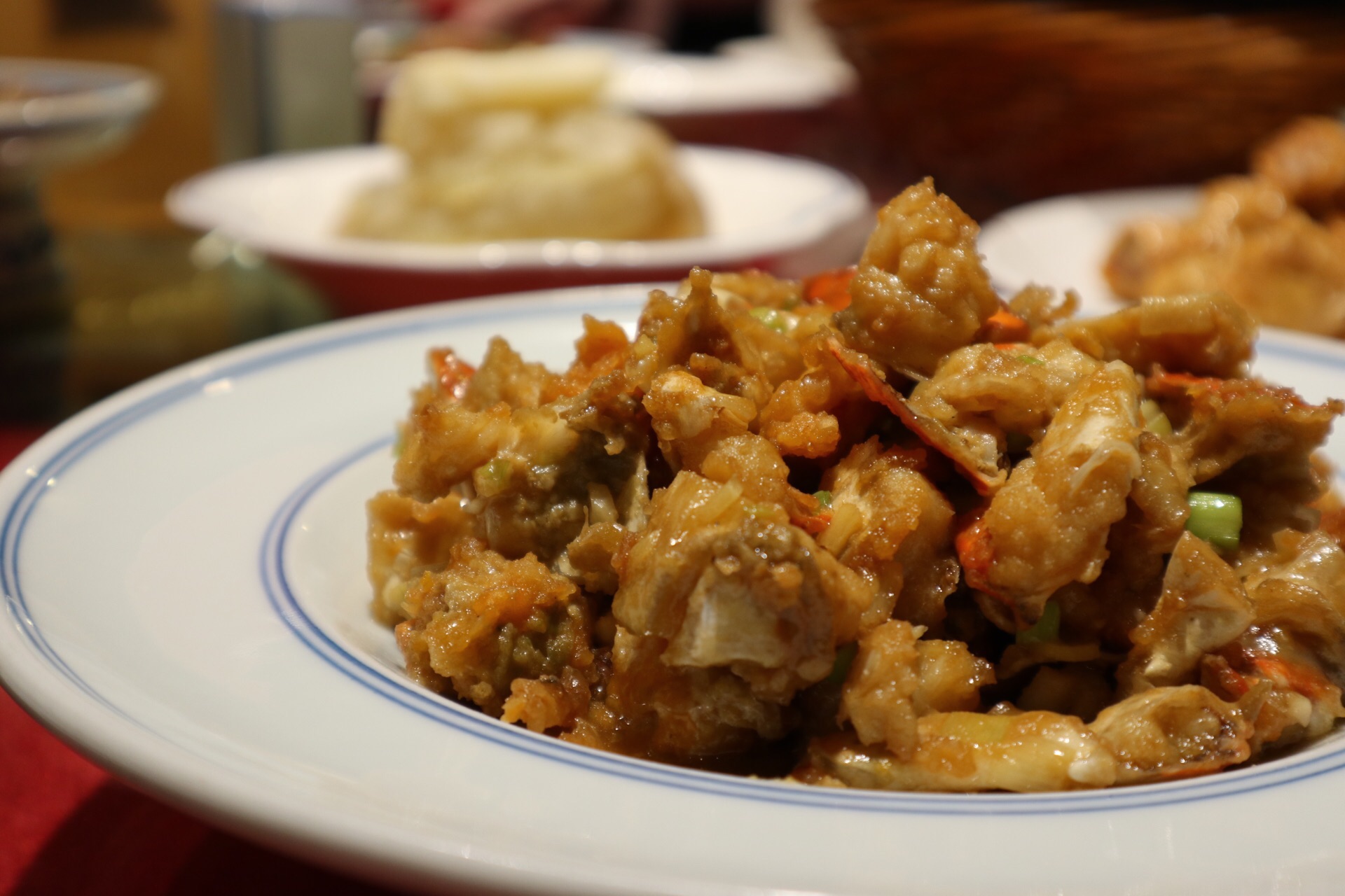 外食江浙菜吃的不多,这家的称赞也是听了蛮多年,好奇是怎样的宁波菜让人交口称赞 并不是豪华的装修,随处能见到好多老物件,多少勾起点黑白记忆 蟹糊、带鱼、烤鸭、臭冬瓜、芹菜螺肉、凤爪、牛百叶、杨梅拼西柚,冷菜已经摆满一桌,蟹糊很棒,红膏诱人,炸带鱼更是肉厚皮酥,烤鸭也值得重点推荐,有点介于麻油鸭与酱鸭之间,甜口不腻,肉质不松散也不老,真是太好吃了 烤鲳鱼、泉水牛肉、蟹骨酱,可谓是热菜必点 这一斤重的鲳鱼可是老价钱了,表面酥酥的,锁住鲜味,鱼肉可不是一般的肥厚,赶紧趁休渔期前多吃几口 泉水牛肉也是有点惊艳,纹理可谓媲美雪花,非常嫩,清汤鲜美又有泡椒的辣爽 蟹骨酱每家的做法不一,选用野生红膏蟹,偏向干煸的口感 鱼头煲、鸡煲,一份就占了三分之一张桌子,量大实在,鱼头煲里的菜籽油老豆腐味道很棒,鱼头没有腥味,鱼身部分留的肉也多 椒盐虾姑,个个带膏,盐水江白虾,也是带籽虾 油渣芋艿也很好吃 梅子肉、糖醋排骨、洋葱土豆、茭白榨菜丝、宁波老三鲜、烤菜年糕……热菜太丰富,完全吃不过来 酒糟核桃羹,蛮有代表性的中式甜羹,用的生核桃,以及迷你汤圆,酒糟一向很喜欢 灰汁团偶尔吃个,也蛮好吃的,小米糕松软清甜,还有手作汤圆 吃进嘴里,下到肚里,终于明白这家火爆的原因了,若是聚餐也必定在首选之列