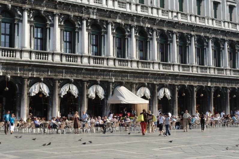 他就在号称世界上最美的会客厅的圣马可广场的旁边,咖啡厅会将桌椅都摆出来在广场旁边,不过当天天气...