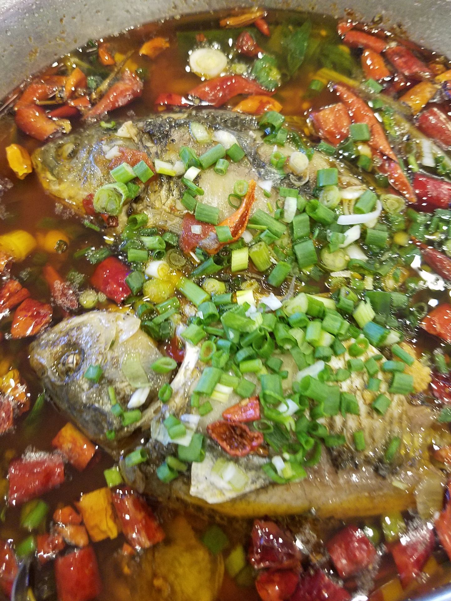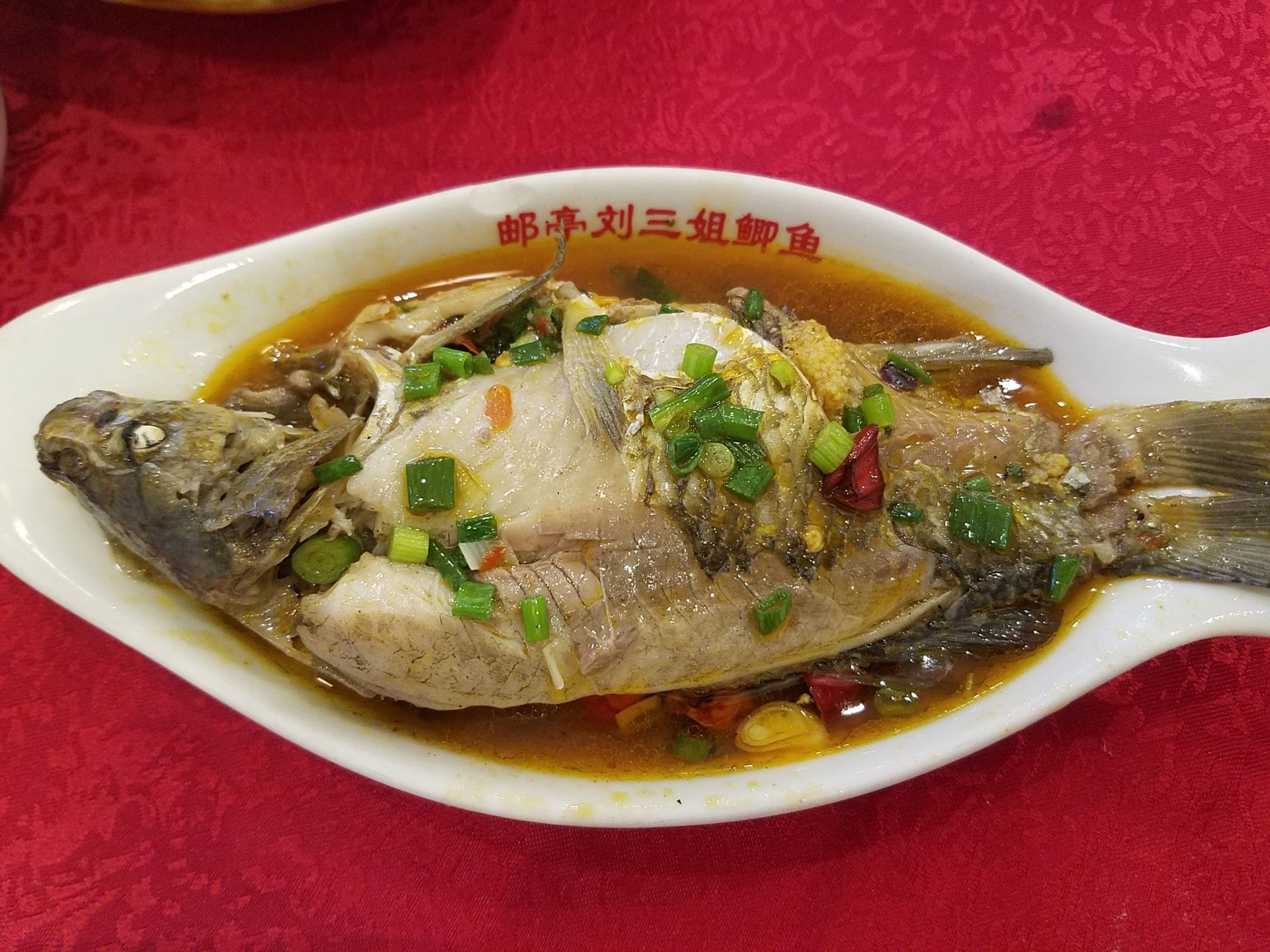 位置比较好找,跟着导航走就找到了。晚上去的,位置基本已经坐满了。面积比较大,有两层楼。整个环境还不错吧。点了二斤鲫鱼,加了二个素菜。分量很足。鲫鱼味道不错,属于红烧加冒菜的味道,就是刺太吓人,本人差点当场被鱼刺卡翻。幸好及时咳出来了。服务态度也不错,比较有耐心。
