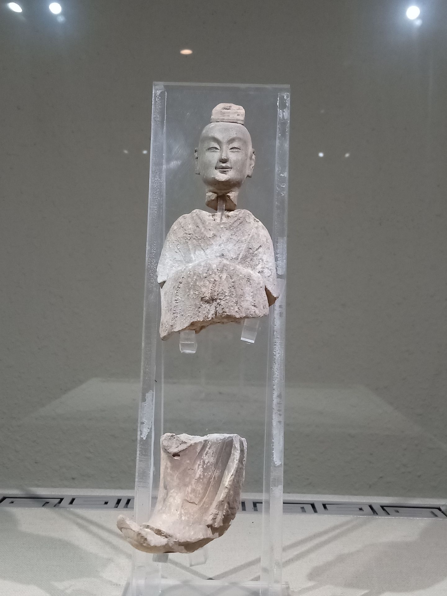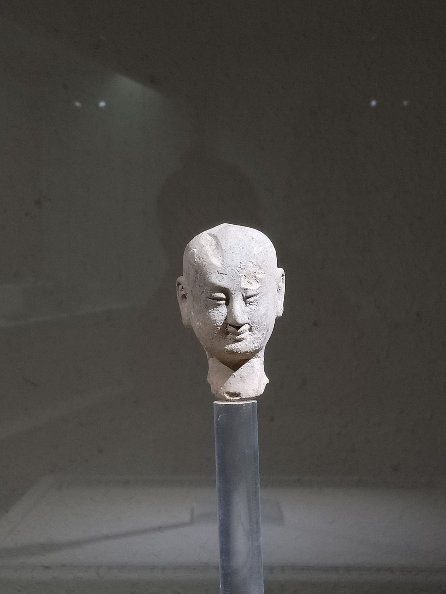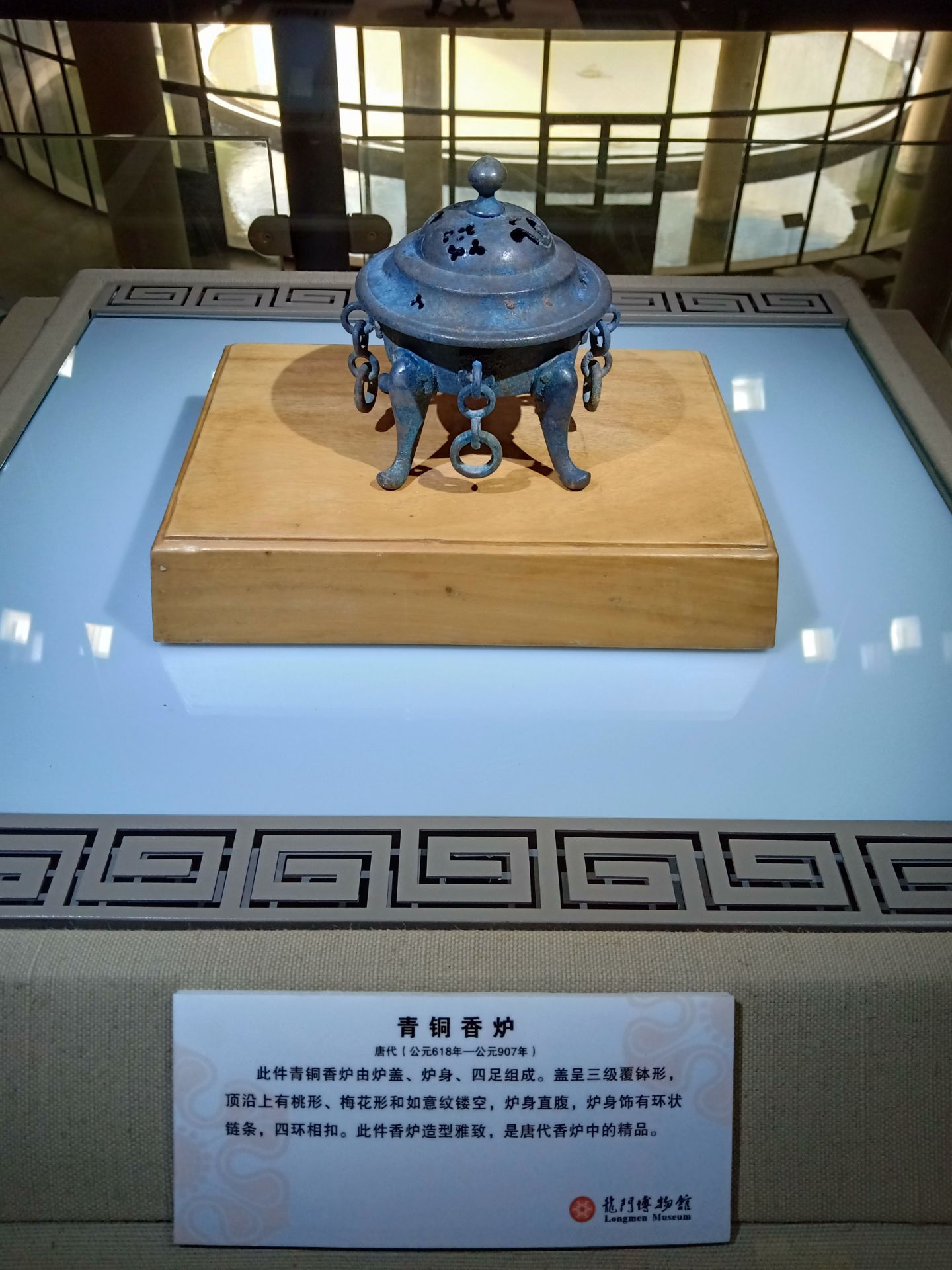 龙门石窟,是洛阳旅游的首选,也是摩崖石刻和碑刻的首选,在这样一块风水宝地上,修建龙门博物馆,难免为人诟病,有班门弄斧之嫌。所以,博物馆在建筑造型,参观路线规划及展厅设计,展品摆放等方面,都凝结了足够的匠心与智慧,令人耳目一新。博物馆里,常规展品,有一级文物‘春秋宝剑及鞘’,剑不甚稀奇,带鞘的剑可就少见不由得多怪了 。龙尾凤首簪,雕功细腻,浑然天成,也算是上品了。最喜男俑雕刻,相貌俊美,表情虚静,细微之处的塑造亦用心备至,从其隐约隆起的头顶中间的脊线可见一斑,由此思及大唐盛世的民俗风情,在那样一个物华天宝人杰地灵的时代里,即便是寻常百姓,也在不断追求理想的进程中,高洁的思想高尚的行为将日常琐屑生活变得十分惬意舒适,香花,美器,音乐,还有茶道,香道等生活的艺术,无一不映射出人类内心深处无限的追求与愿境,这才是真正的盛世华章啊!