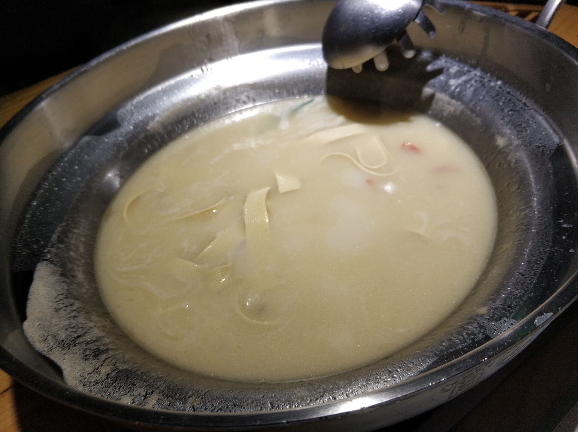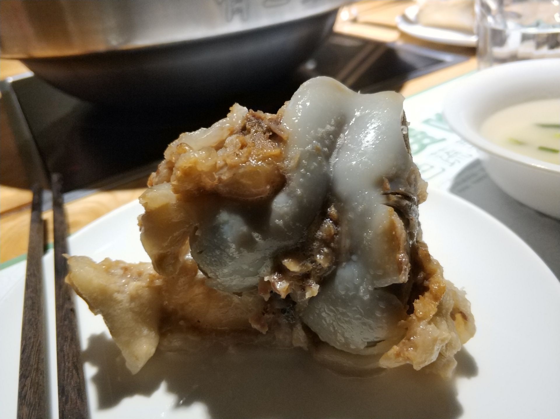 搜附近,看到骨味坊,突然之间就很想啃骨头,虽然一个人吃火锅有点尴尬,但是又不是没试过。在万达溜达了一圈没什么其它选择能克服啃骨头的欲望,所以,进店解馋。 环境不错,座位宽敞。服务很好,服务员都很积极热情。一个煲里3根(还是4根?忘了)筒骨,没什么肉,不过汤真的很好喝。