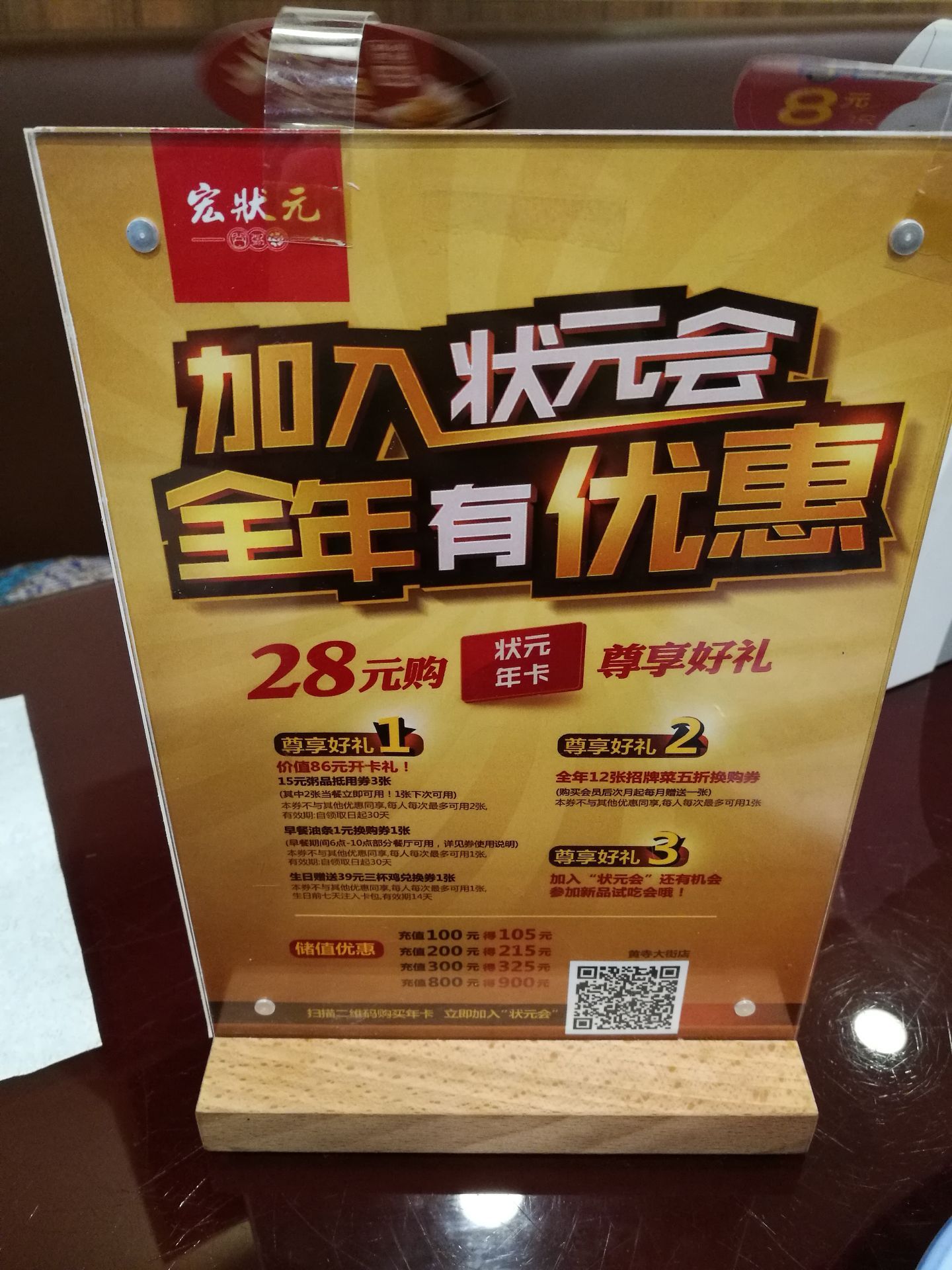 宏状元是北京一家连锁的粥店,也许称得上是性价比最高的粥店,在很多地方都能看到它的门店。这家宏状元餐馆位于黄寺大街,距离阳光丽景小区不太远,算是开在居民区的一家餐馆。作为连锁门店,这里的粥及各种菜肴和其他门店相比没有什么不同,都是精心制作的,味道总体不错,价格也不贵。这里值得推荐的是自助早餐,15元真的很实惠。另外值得推荐的是支付28元加入会员,会送3碗粥,在生日那个月还会送一个菜,还有其他会员优惠,非常值。这家餐馆比较大,卫生整洁保持得非常好,还设有书架摆放了一些图书供客人阅读,显得比较有文化。服务员也比较亲和,总体上说在这里就餐很愉快。
