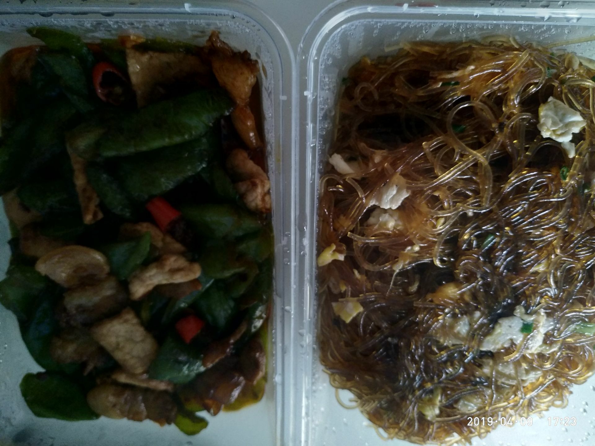 今晚点了一份外卖,两道菜,比较简单的菜式 ,不过家人都很喜欢今晚点了一份外卖,两道菜,比较简单的菜式 ,不过家人都很喜欢。一道是干捞粉丝,另一道是农家小炒肉,推荐干捞粉丝,粉丝很有嚼劲,农家小炒肉也不错,现在青椒很贵的,商家给了这么多,已经很棒了。
