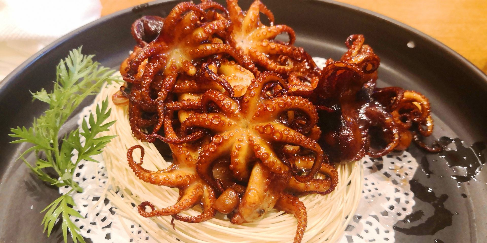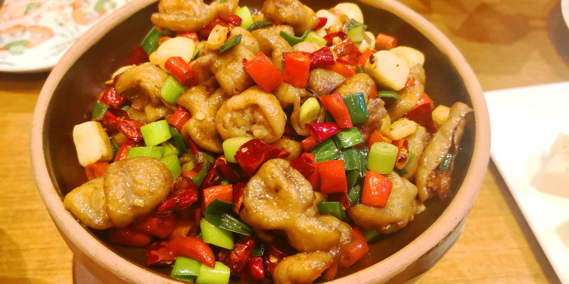 有小两个月没来了,感觉生意是愈发兴旺了呀。原来的空地也被安排上了桌椅,沿路的包厢都坐满。点了炭烧八爪鱼、干锅肥肠、芋头和米糕。炭烧八爪鱼味道有点甜,有嚼劲,我个人比较喜欢,经常点,不过这次来的量比以前少了噢;干锅肥肠是川味的,也是大家都喜欢的;米糕和芋头当主食吃了,没有另外加饭。米糕和盘子粘在一起这样的细节,店家也要注意处理一下,比如垫个荷叶,百尺竿头更进一步嘛。