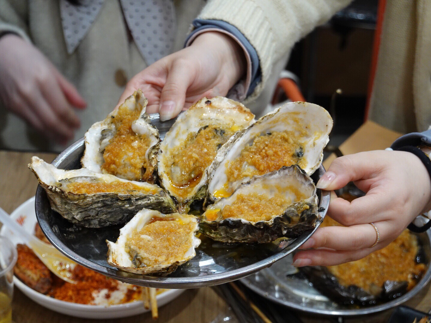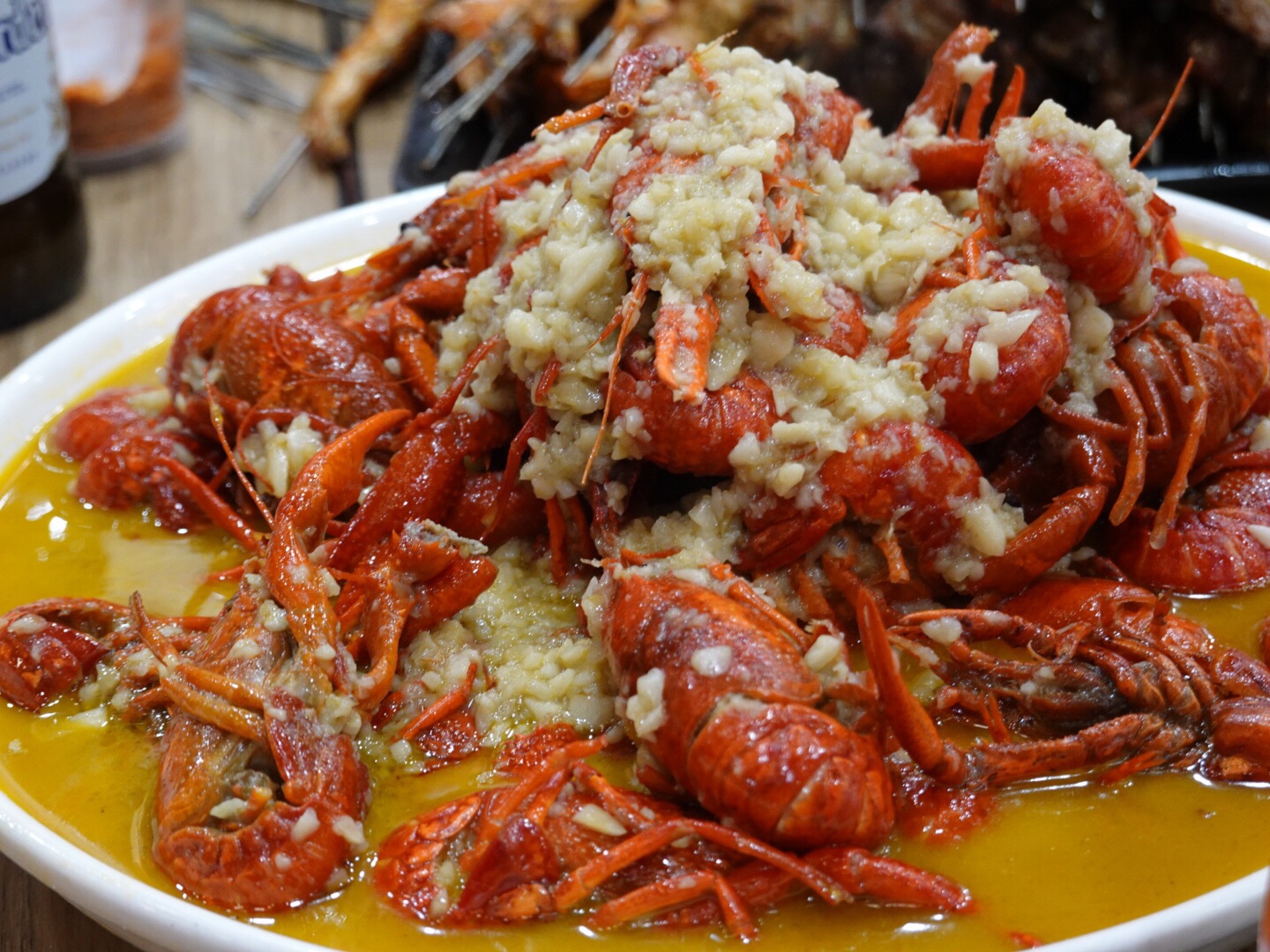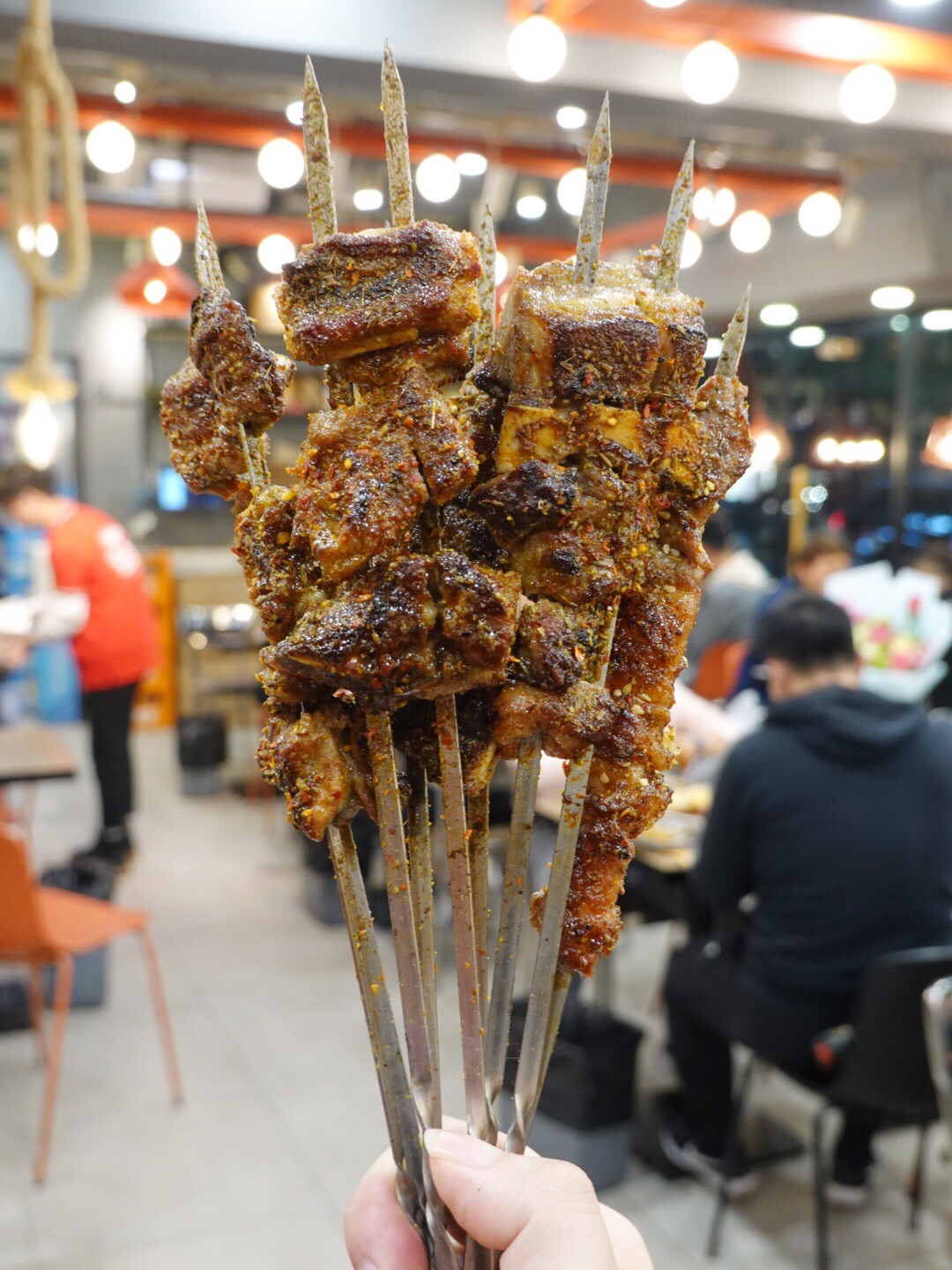 营业到深夜,外面依旧坐满人,人声鼎沸,热闹极了! 大虾,活虾烤制,肉质细嫩又有韧性;掌中宝,超级Q