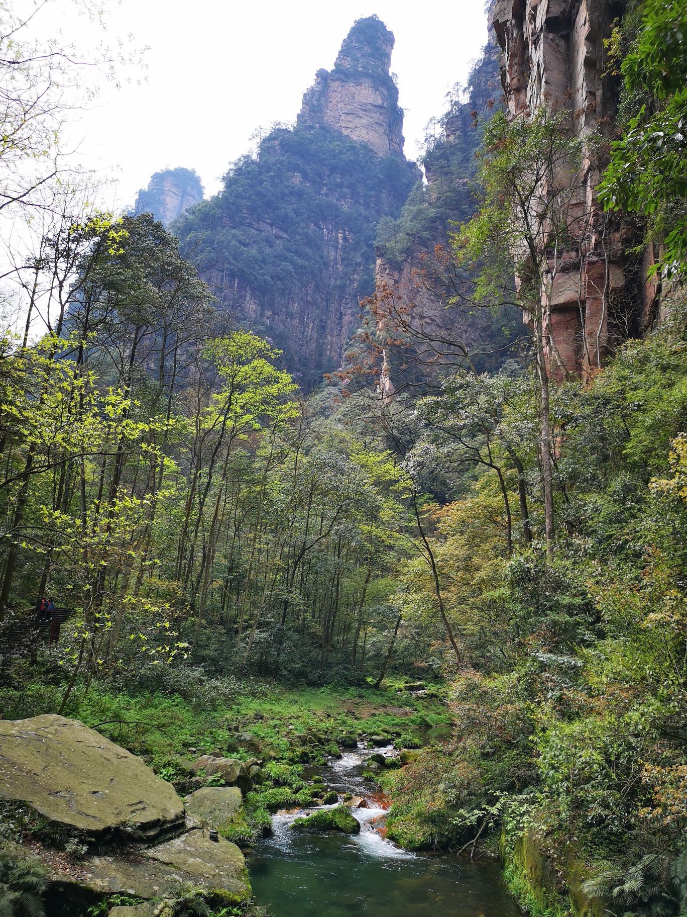 在黄石寨车站,走右边进金鞭溪,向武陵源方向的水绕四门步行,沿路标走,需要2.5小时到。但是在紫草潭服务区要注意,卫生间右边的路通往水绕四门,那里有观光车站,卫生间左边的路通往砂刀沟,袁家界,孔雀开屏后开始上坡,一路是树林,还有3000多级台阶,海拔上升170米,上来后就是袁家界的望桥台候车亭,需要4小时。所以在紫草潭服务区一定要清楚方向。 金鞭溪的景色是沿溪水走,两边是树林,山峰,基本是平地,进去不远是金鞭岩,86版西游记取景地,夫妻对拜等。景色一般,如果时间充足,可以走走,当在氧吧里走。