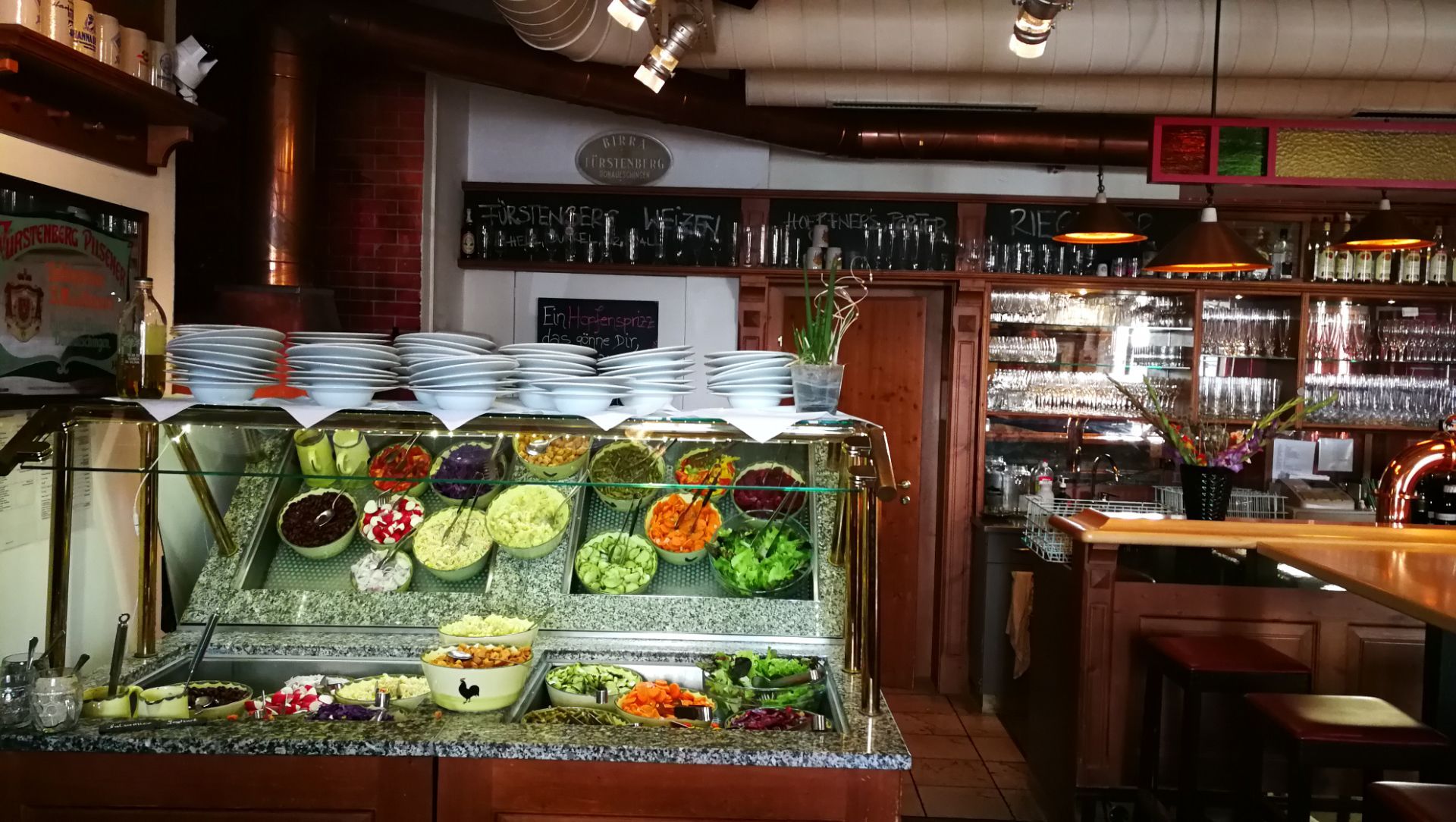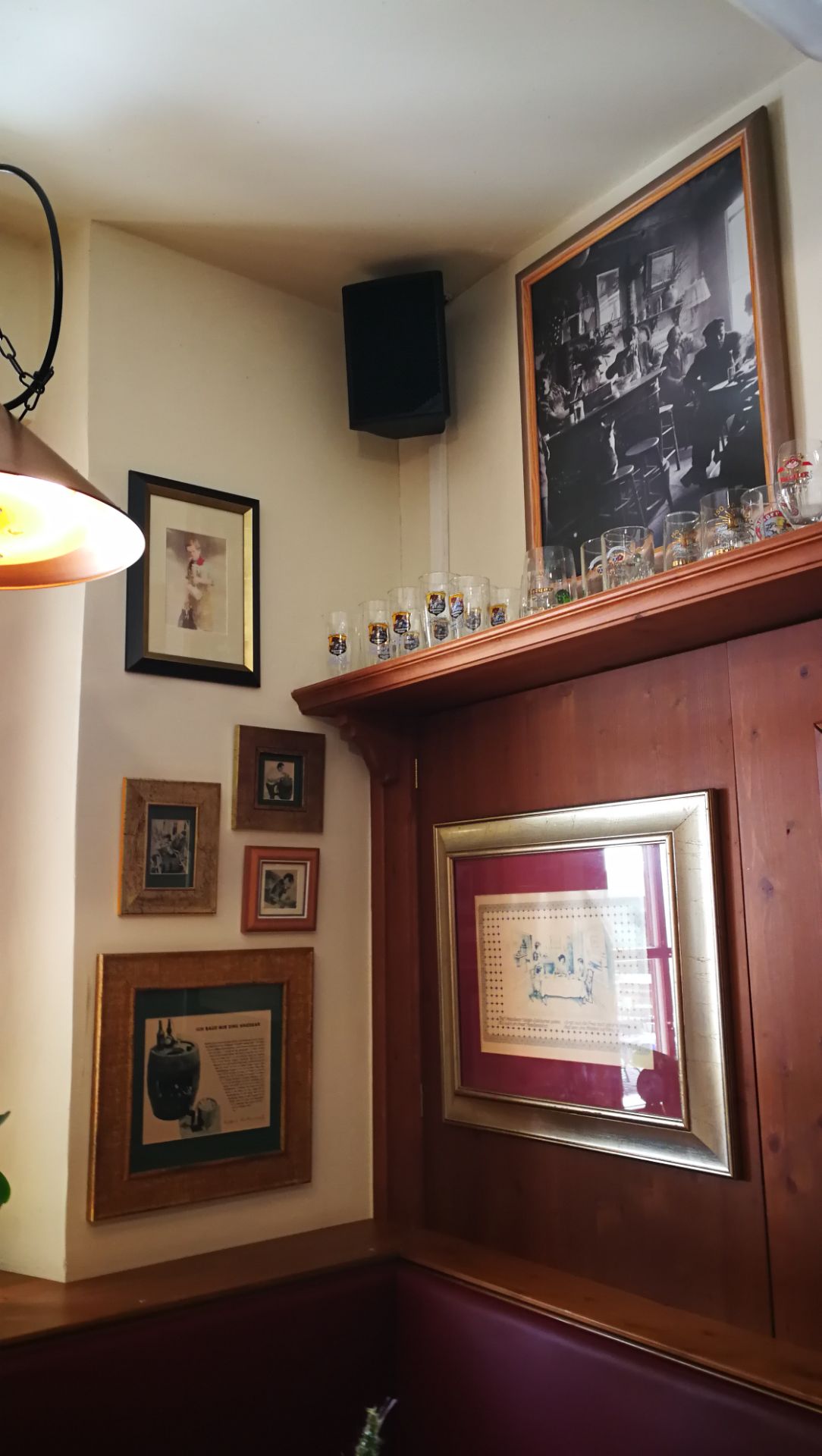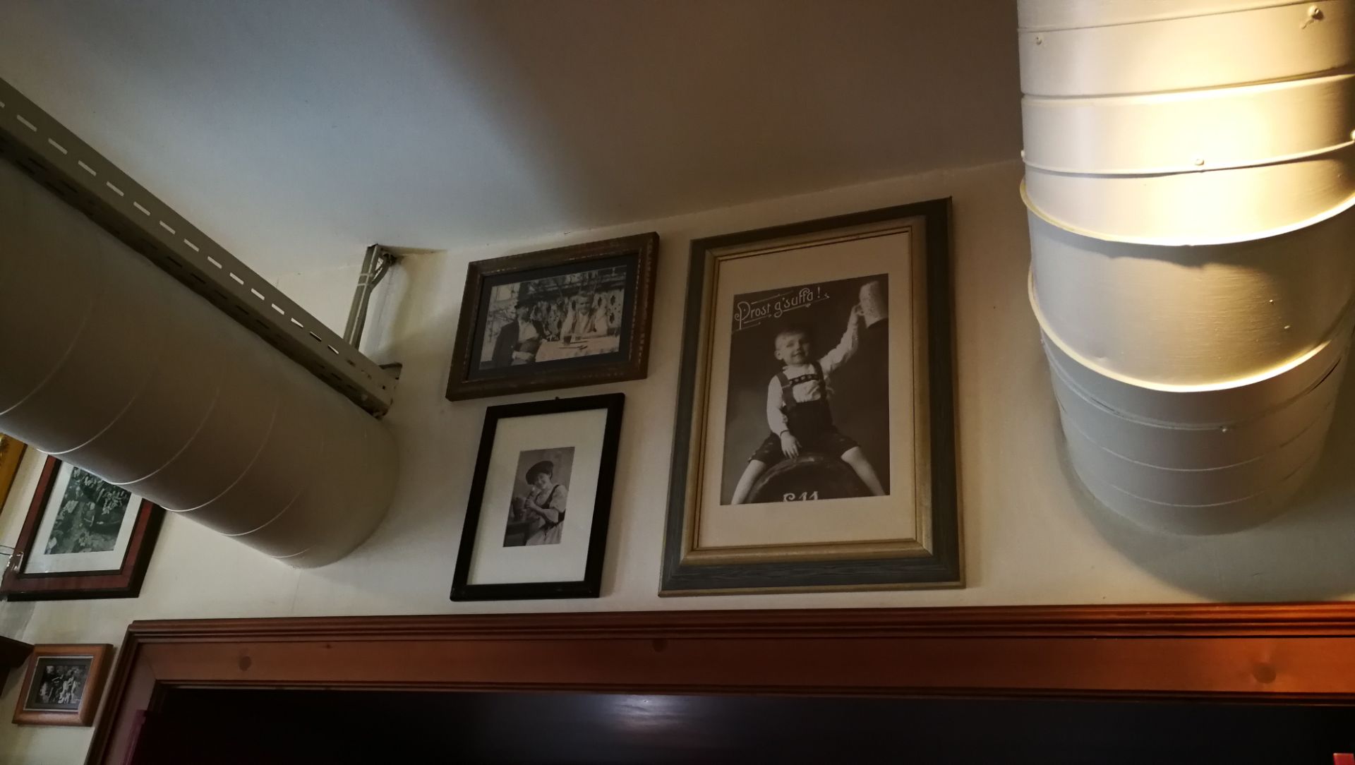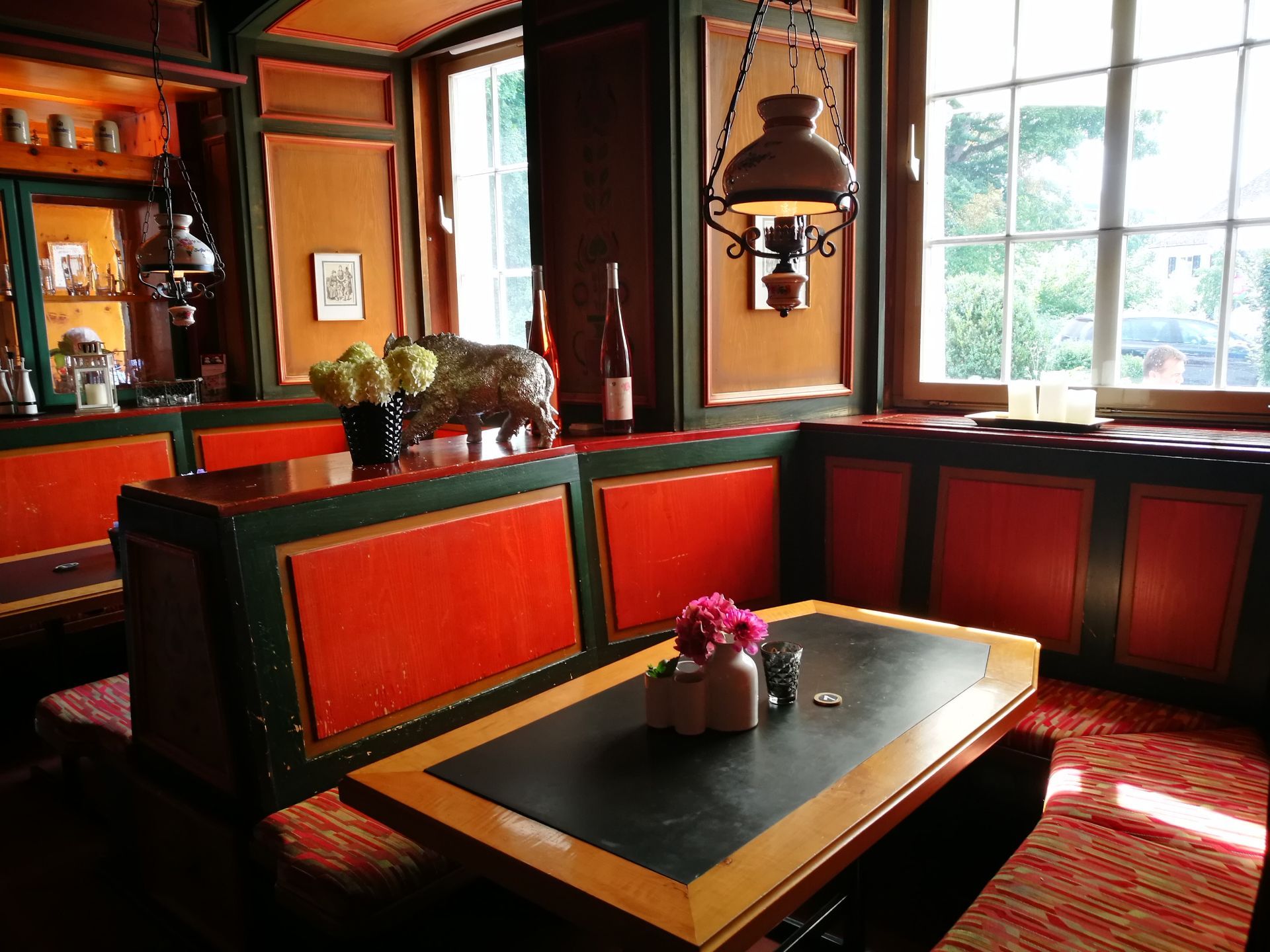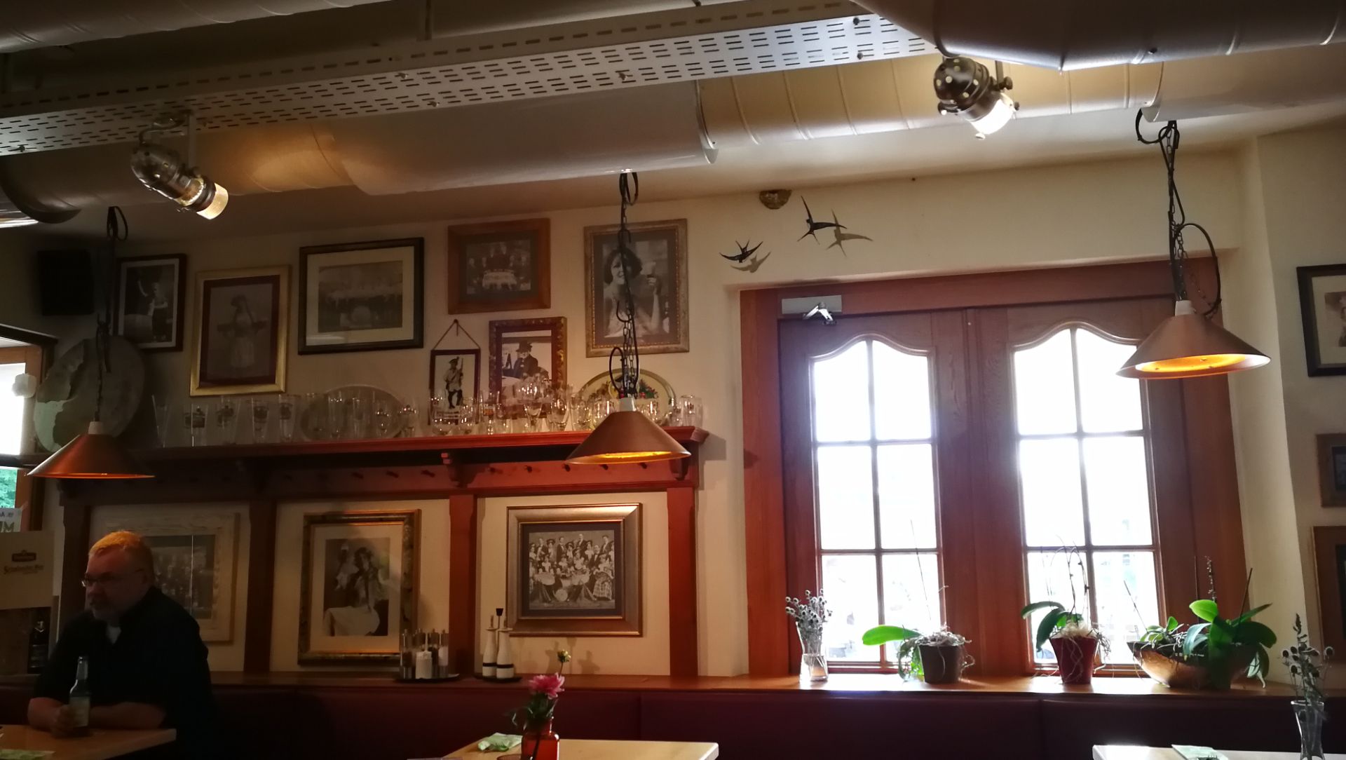 餐厅旁有专用的车位,但是开车进镇时不容易看到,等开到餐厅门口则停车位已经过了,算了就在啤酒厂门口附近找个位置停车,反正坐在室外喝啤酒看得见。餐厅非常大,室内浓重的乡村氛围,墙上挂着许多老照片,还不时有一群群打着小红旗穿着黄马甲参观服的德国老头老太,集体参观啤酒厂后在这里购买纪念品。菜则比较凶猛,黑森林的地方菜,猪排、猪手都来上一点,配上刚刚出厂的生啤,坐在阳光下泉水旁,真是生活