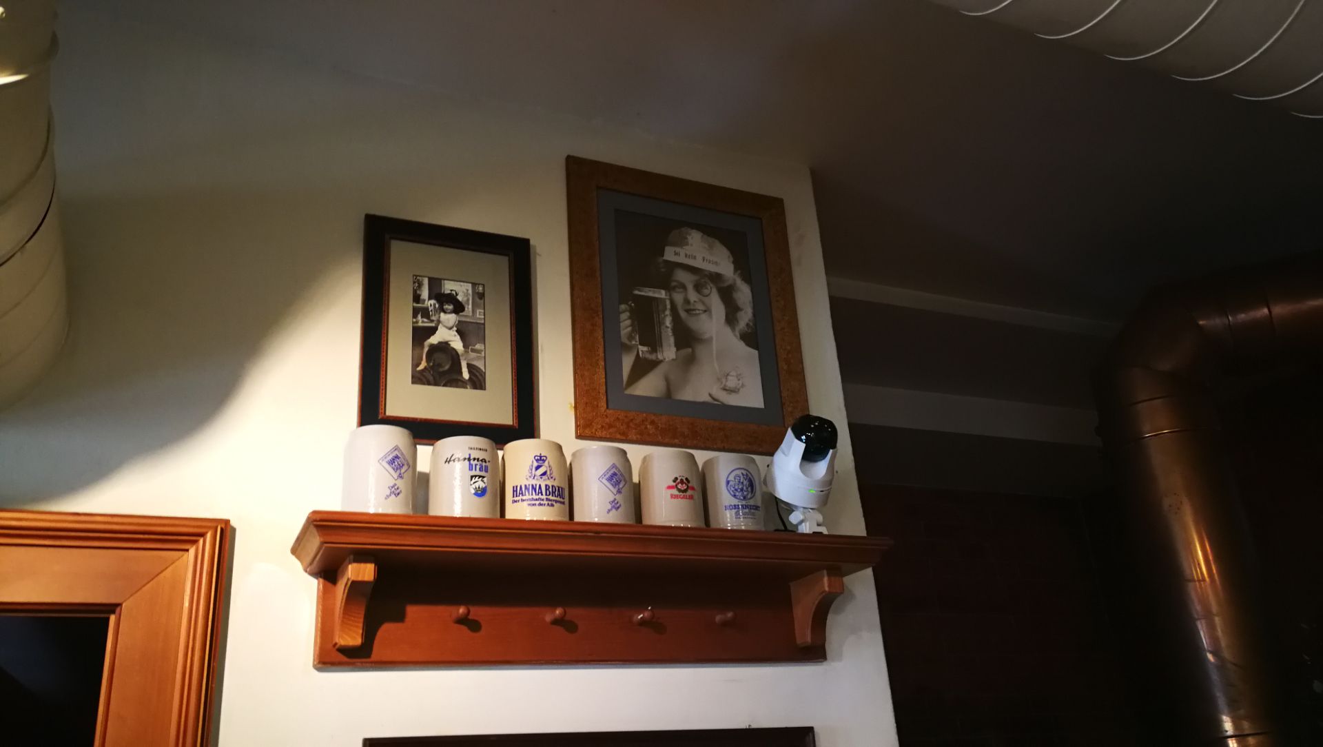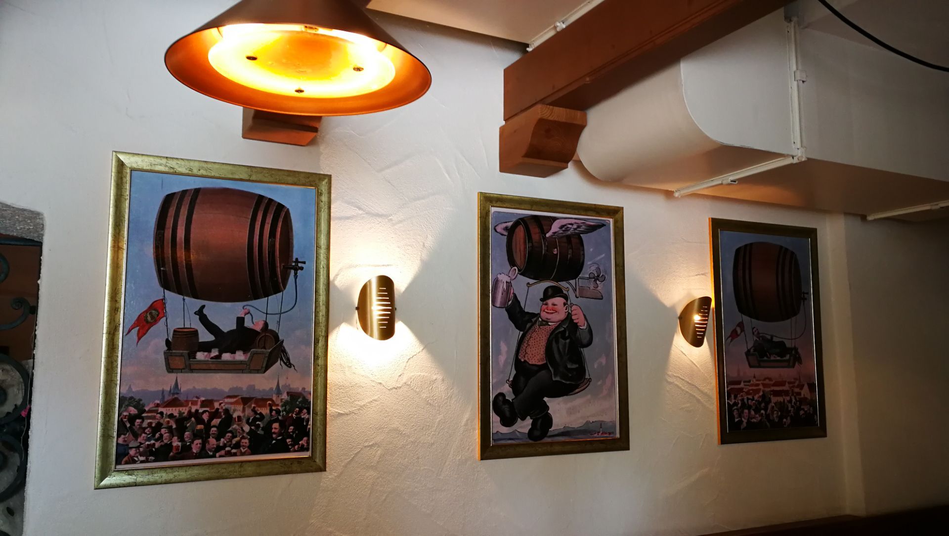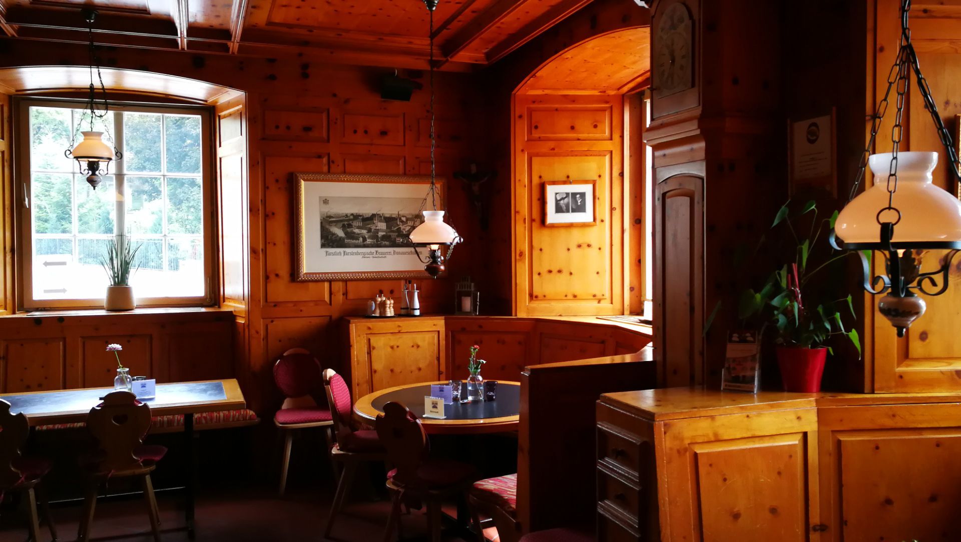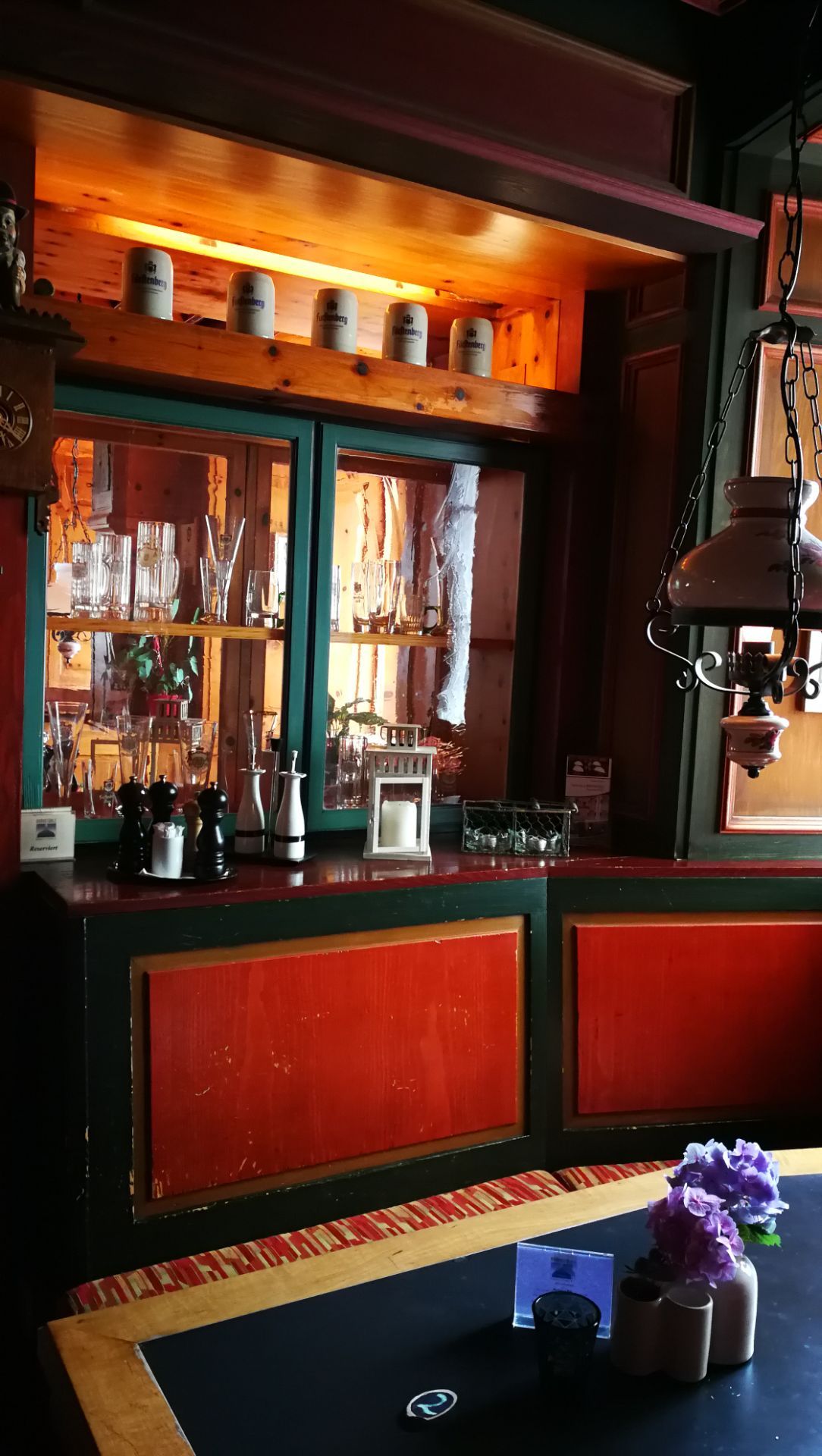 餐厅旁有专用的车位,但是开车进镇时不容易看到,等开到餐厅门口则停车位已经过了,算了就在啤酒厂门口附近找个位置停车,反正坐在室外喝啤酒看得见。餐厅非常大,室内浓重的乡村氛围,墙上挂着许多老照片,还不时有一群群打着小红旗穿着黄马甲参观服的德国老头老太,集体参观啤酒厂后在这里购买纪念品。菜则比较凶猛,黑森林的地方菜,猪排、猪手都来上一点,配上刚刚出厂的生啤,坐在阳光下泉水旁,真是生活