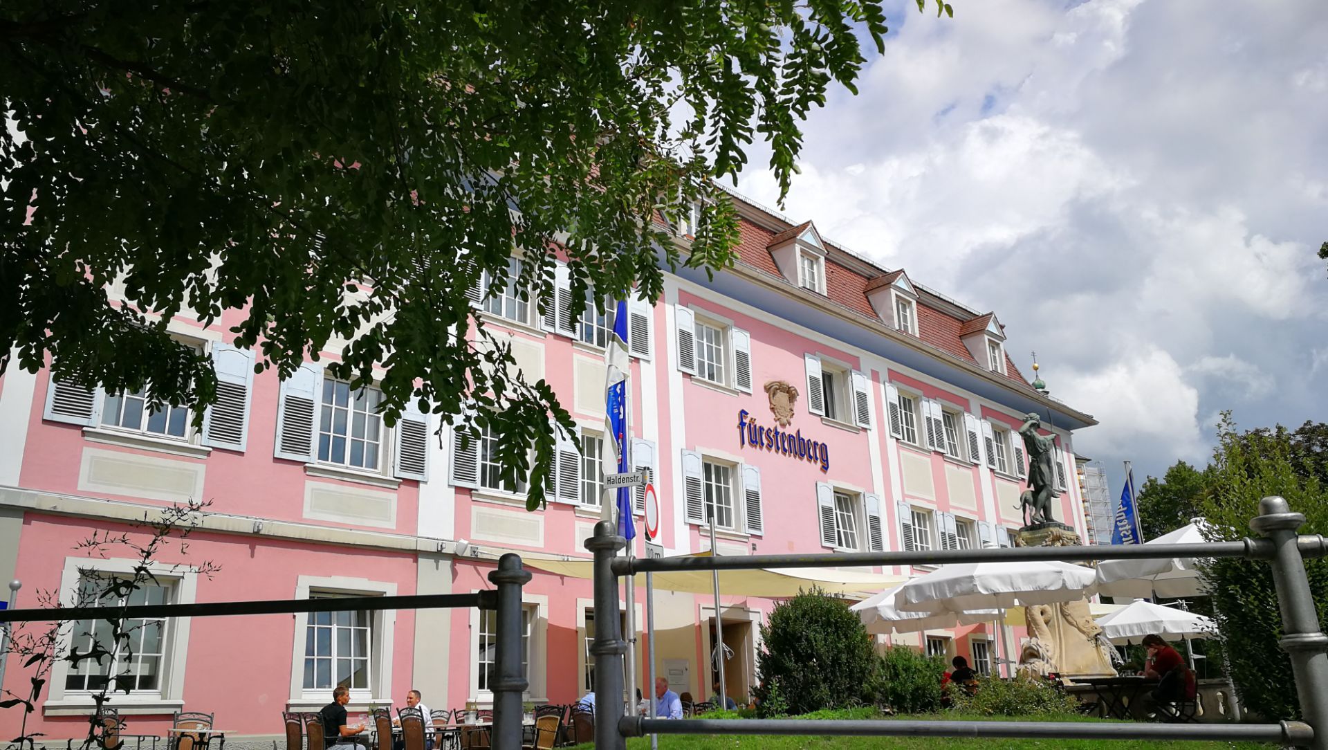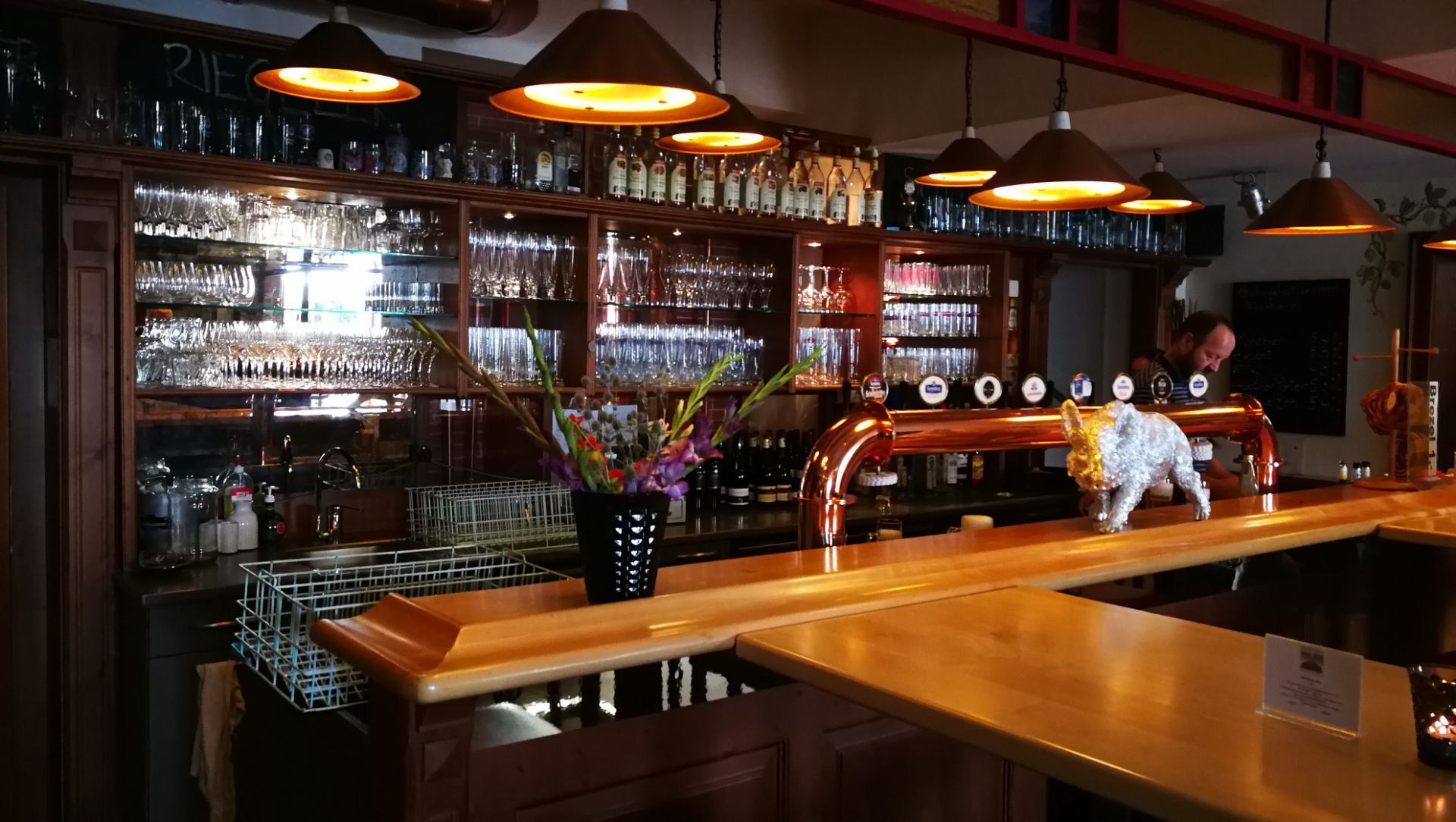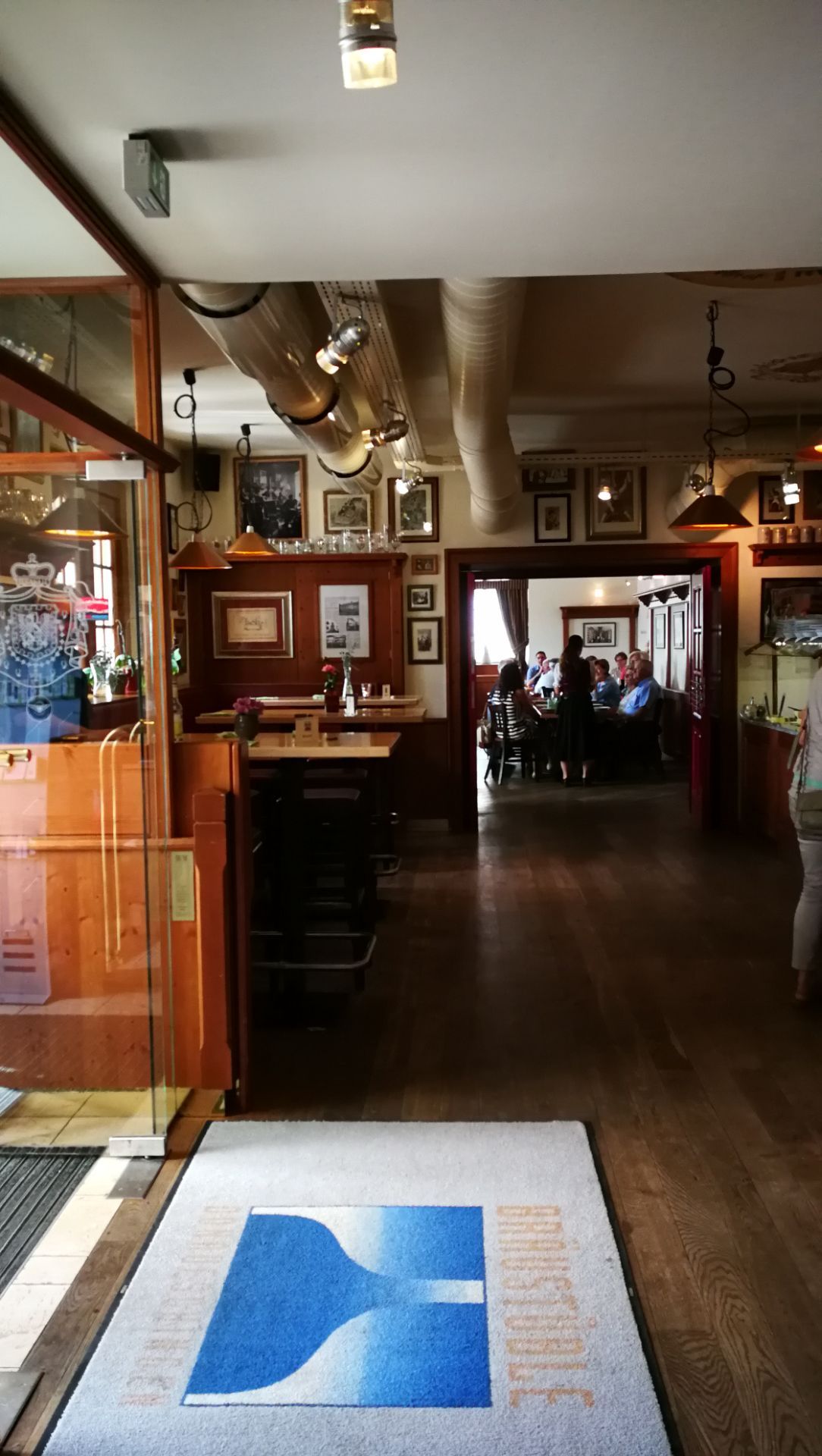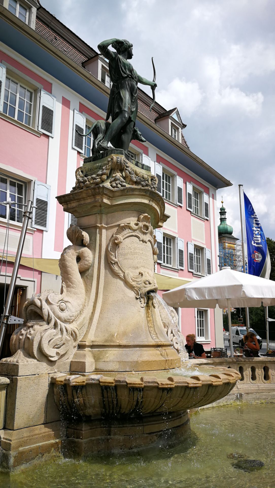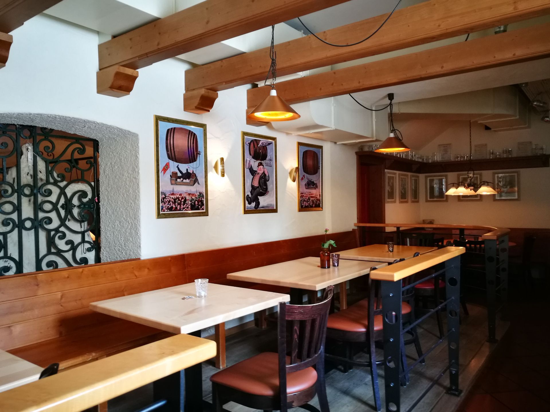 餐厅旁有专用的车位,但是开车进镇时不容易看到,等开到餐厅门口则停车位已经过了,算了就在啤酒厂门口附近找个位置停车,反正坐在室外喝啤酒看得见。餐厅非常大,室内浓重的乡村氛围,墙上挂着许多老照片,还不时有一群群打着小红旗穿着黄马甲参观服的德国老头老太,集体参观啤酒厂后在这里购买纪念品。菜则比较凶猛,黑森林的地方菜,猪排、猪手都来上一点,配上刚刚出厂的生啤,坐在阳光下泉水旁,真是生活