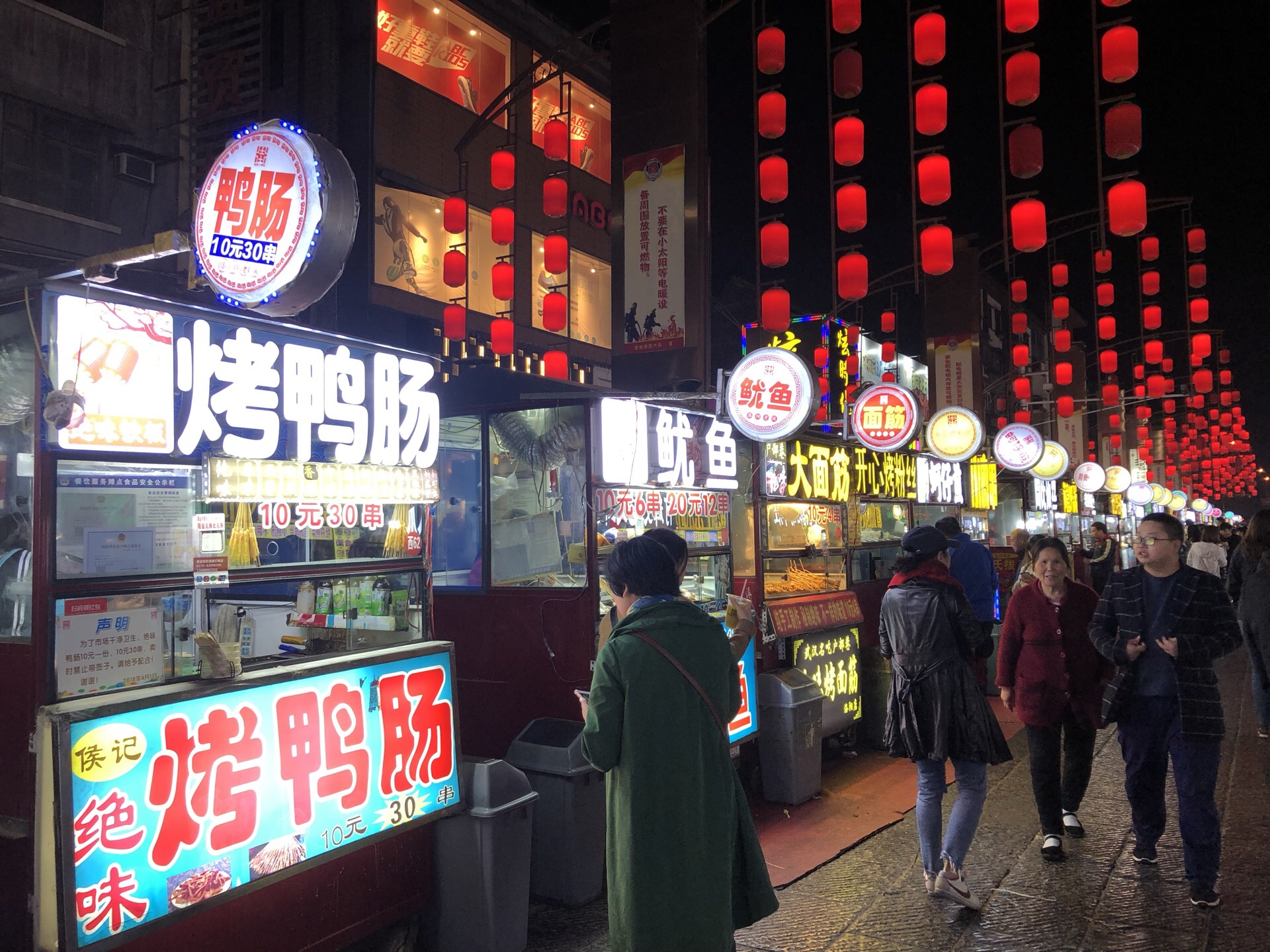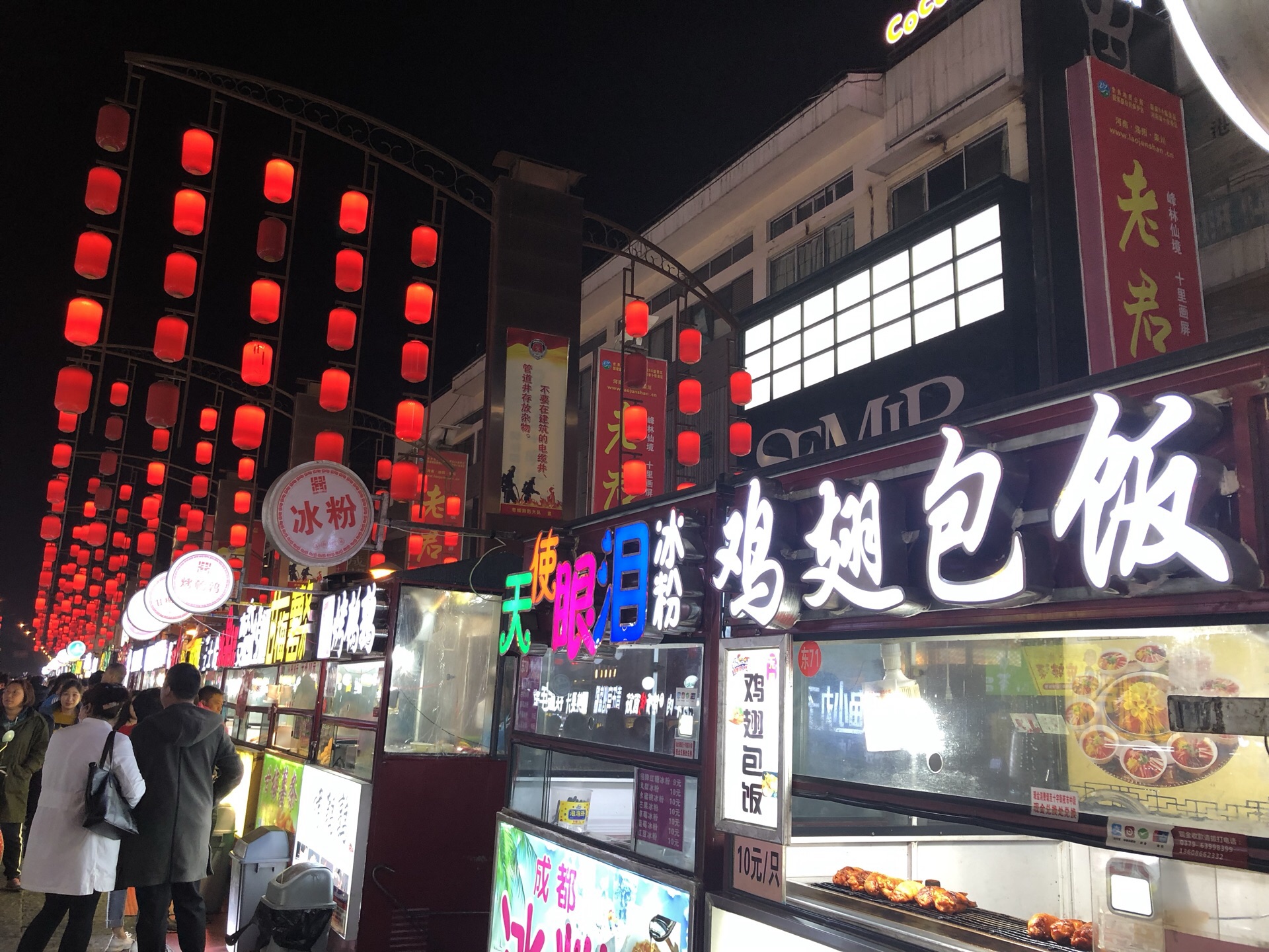 第一眼真的被震撼了,两排密密麻麻的小吃店铺,上方高挂的一排排红色灯笼,路上熙熙攘攘的人群,哇,...