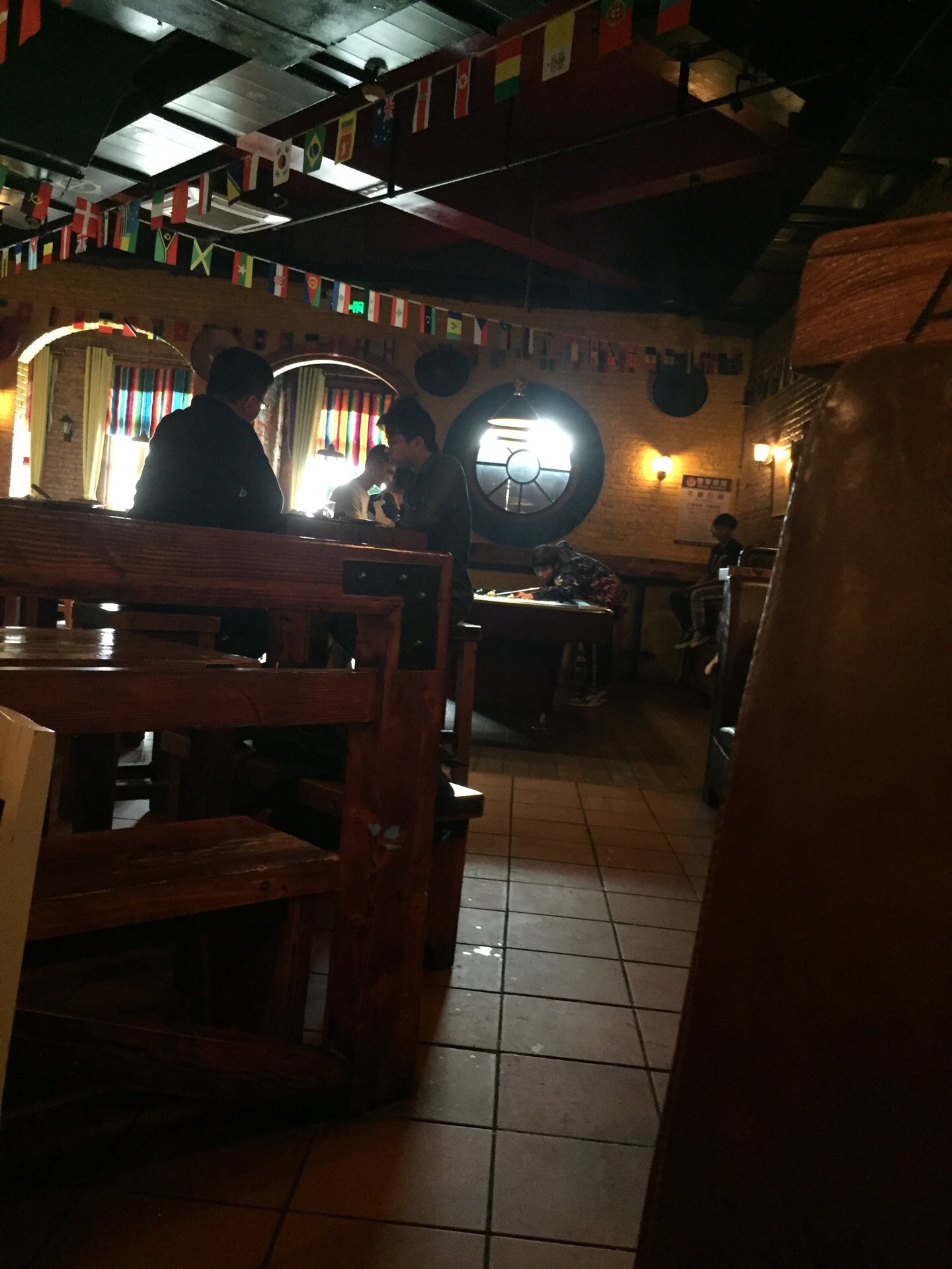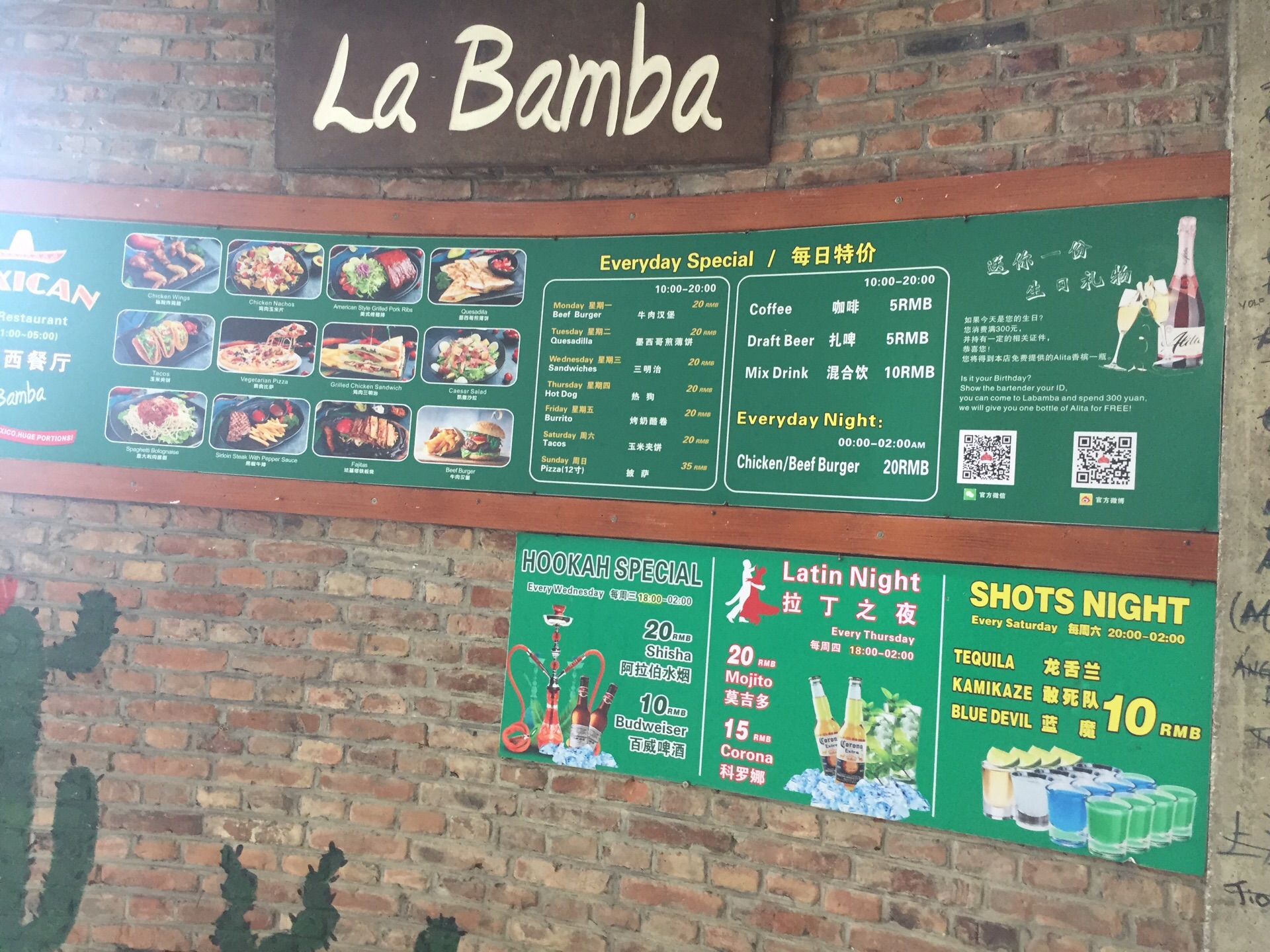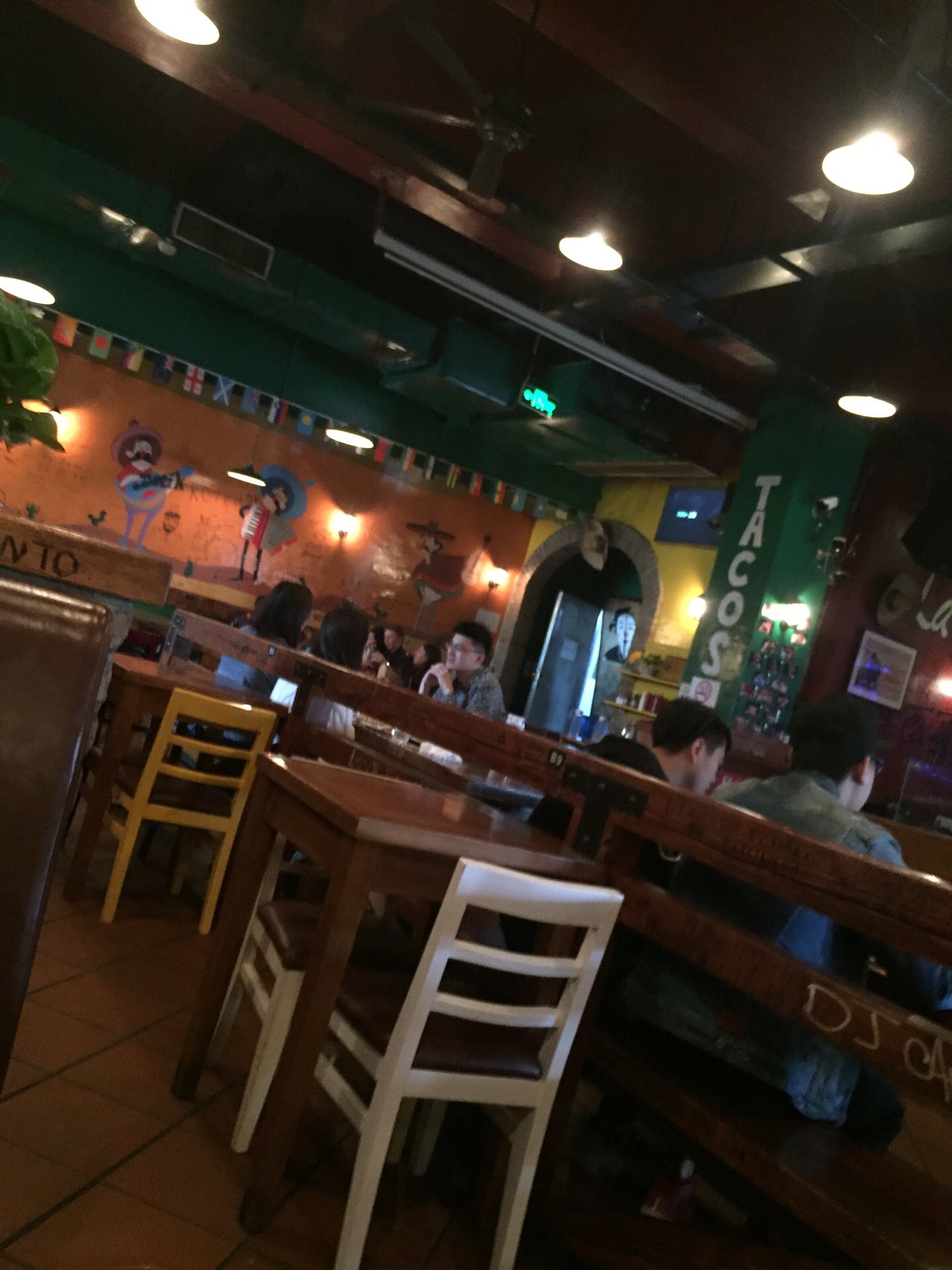 LaBamba 1)店面位置:位于杨浦区国定路靠近政修路上的三号湾广场2层 2)店面特色:墨西哥餐厅和酒吧,店内有台球可以免费打,点餐+2元饮品(雪碧、可乐等)自助畅饮,主营汉堡、薯条、披萨、墨西哥薄煎饼、三明治、沙拉等西餐以及阿拉伯水烟、酒水等。 主食中墨西哥鸡肉卷饼是特色。顾客以周边复旦学生和外国留学生居多。夜晚,餐厅里比较热闹喧嚣一些。 3)店面环境:比较国际酒吧范,店面空间比较大,堂食座位有四人卡座、靠窗座位和两人小桌,木制桌子上有各国语言,吧台附近有电视屏幕可以看世界杯。 4)用餐体验:到店后入座点单,有免费白水供应。出单速度较快。 凯撒沙拉1份38 元,分量很足,肉量也很实在。鸡肉薄煎饼1份38 元,薄饼卷着鸡肉丝比较入味;鸡米花、炸鸡翅的味道有点中国卤味的口感,中规中矩;炸薯条份量比较足,但不够脆。 5)餐饮价格:人均¥70元左右