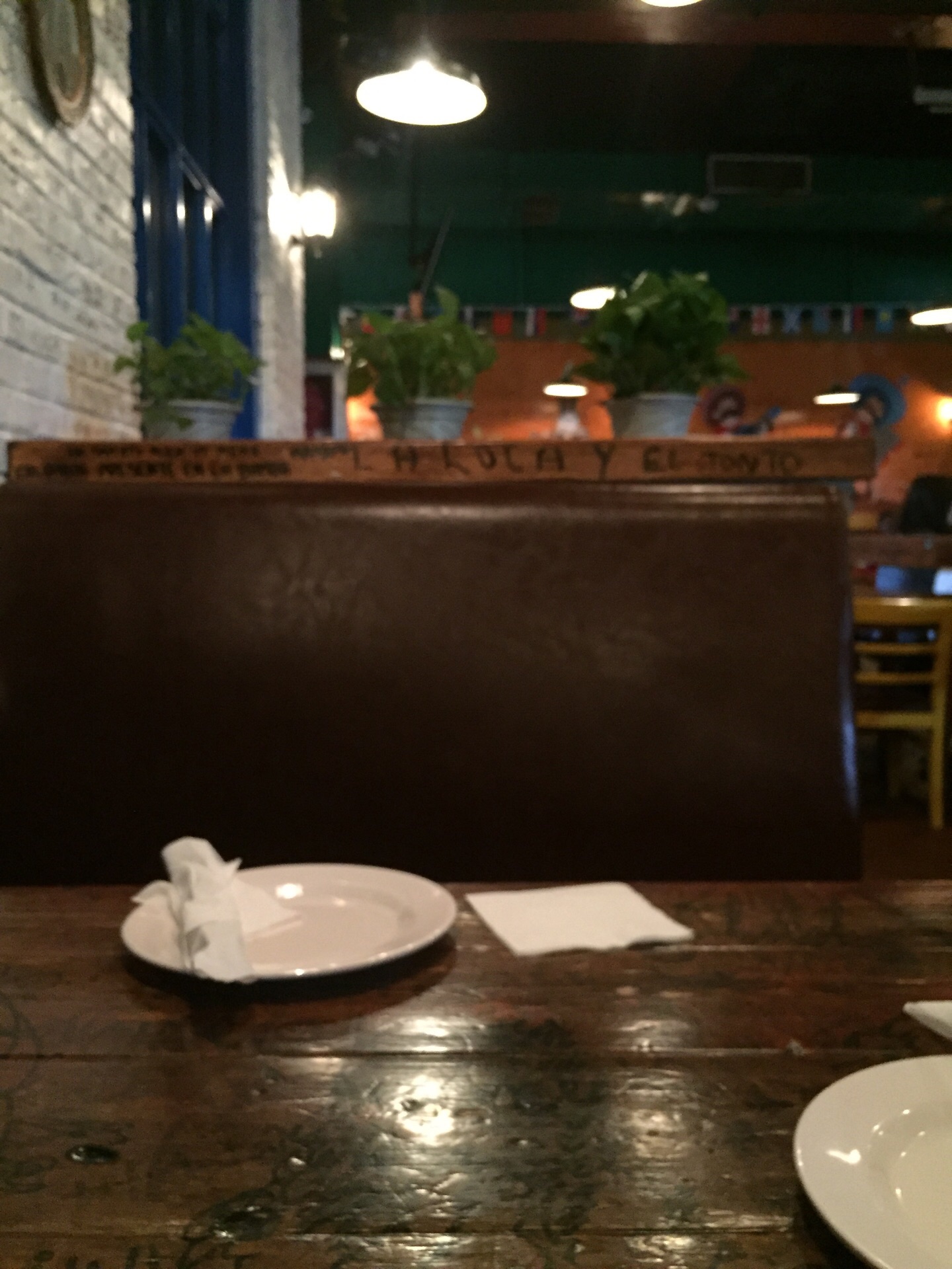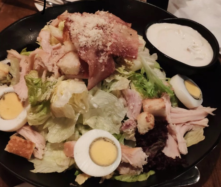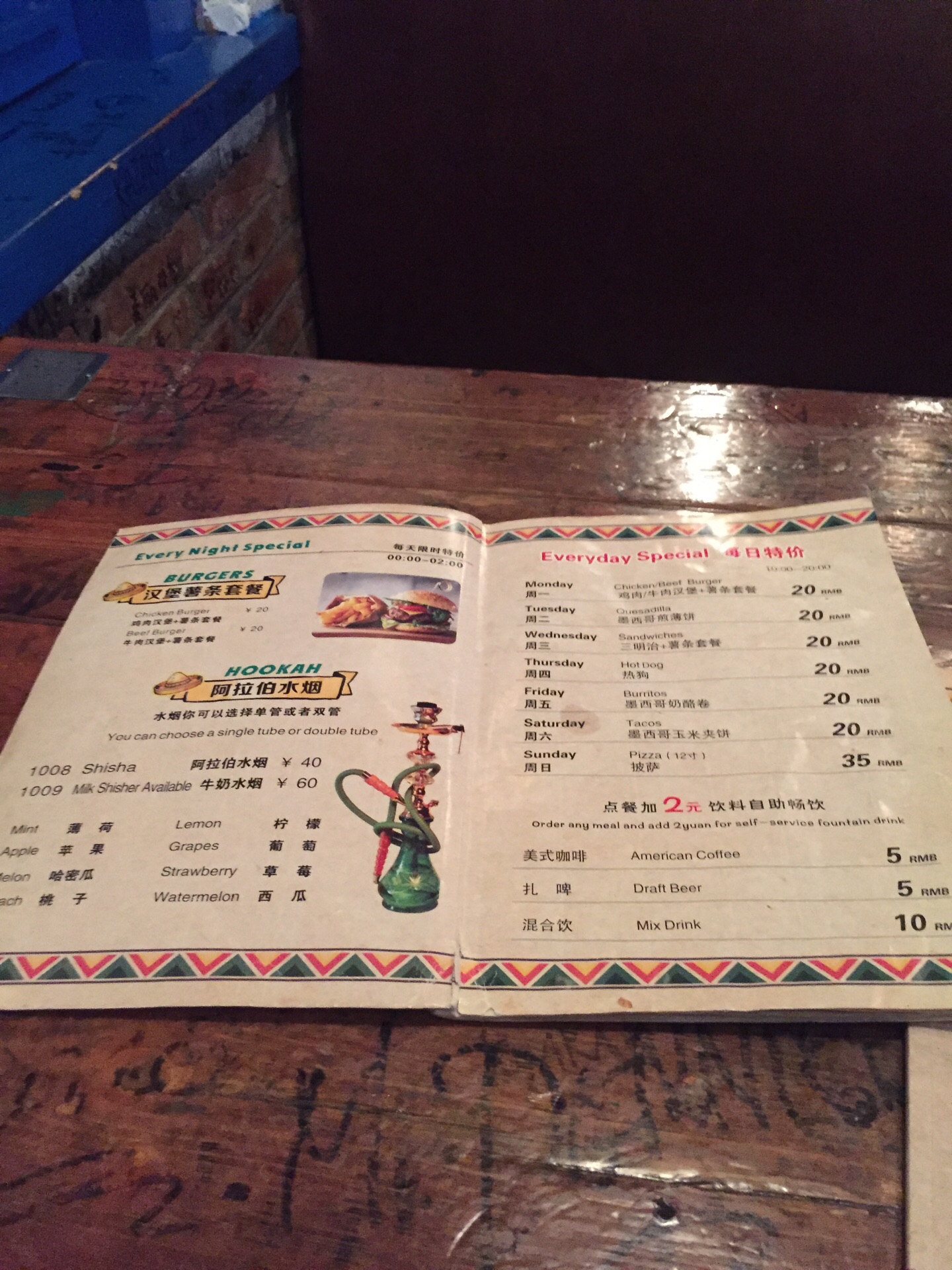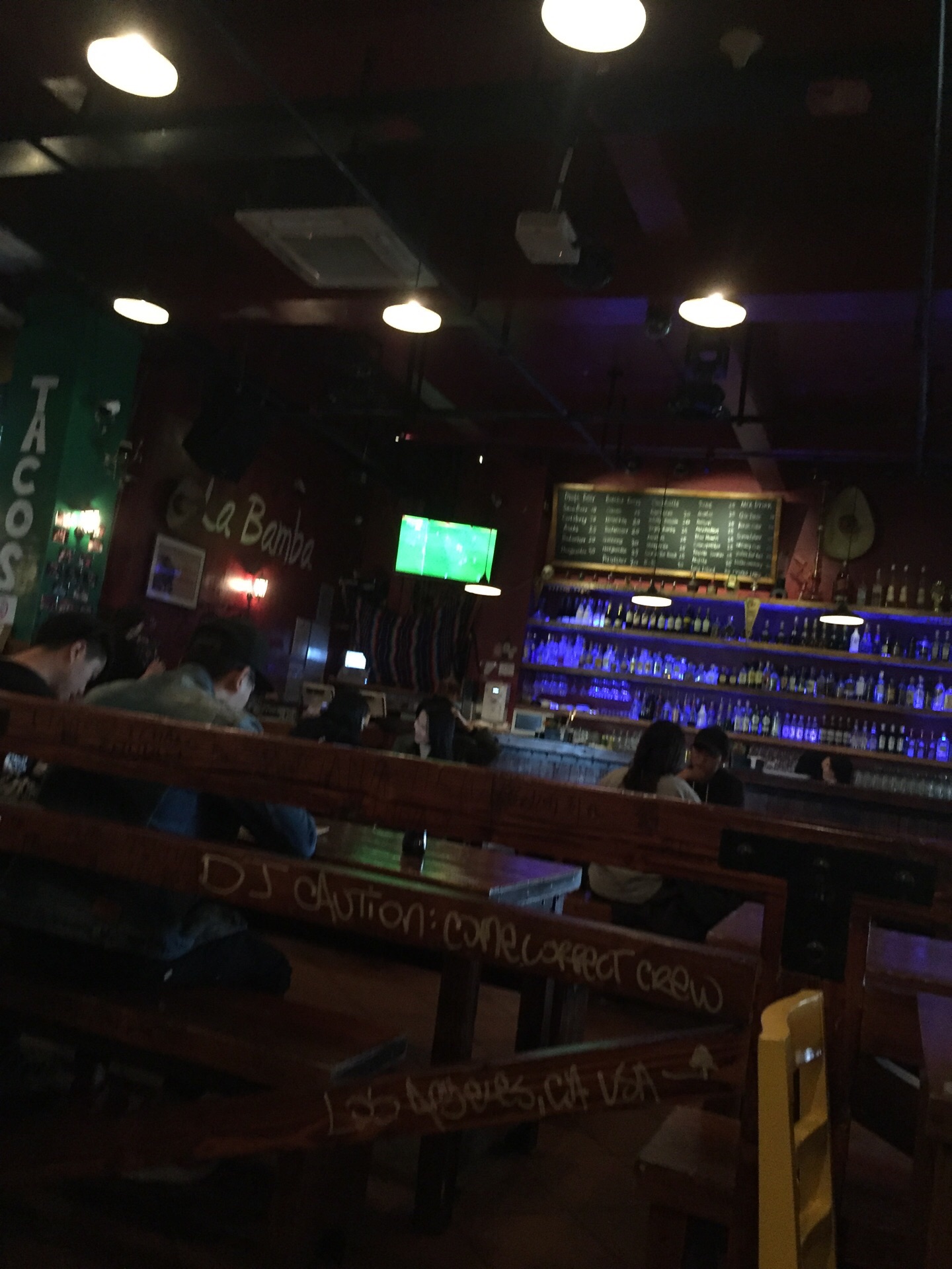 LaBamba 1)店面位置:位于杨浦区国定路靠近政修路上的三号湾广场2层 2)店面特色:墨西哥餐厅和酒吧,店内有台球可以免费打,点餐+2元饮品(雪碧、可乐等)自助畅饮,主营汉堡、薯条、披萨、墨西哥薄煎饼、三明治、沙拉等西餐以及阿拉伯水烟、酒水等。 主食中墨西哥鸡肉卷饼是特色。顾客以周边复旦学生和外国留学生居多。夜晚,餐厅里比较热闹喧嚣一些。 3)店面环境:比较国际酒吧范,店面空间比较大,堂食座位有四人卡座、靠窗座位和两人小桌,木制桌子上有各国语言,吧台附近有电视屏幕可以看世界杯。 4)用餐体验:到店后入座点单,有免费白水供应。出单速度较快。 凯撒沙拉1份38 元,分量很足,肉量也很实在。鸡肉薄煎饼1份38 元,薄饼卷着鸡肉丝比较入味;鸡米花、炸鸡翅的味道有点中国卤味的口感,中规中矩;炸薯条份量比较足,但不够脆。 5)餐饮价格:人均¥70元左右